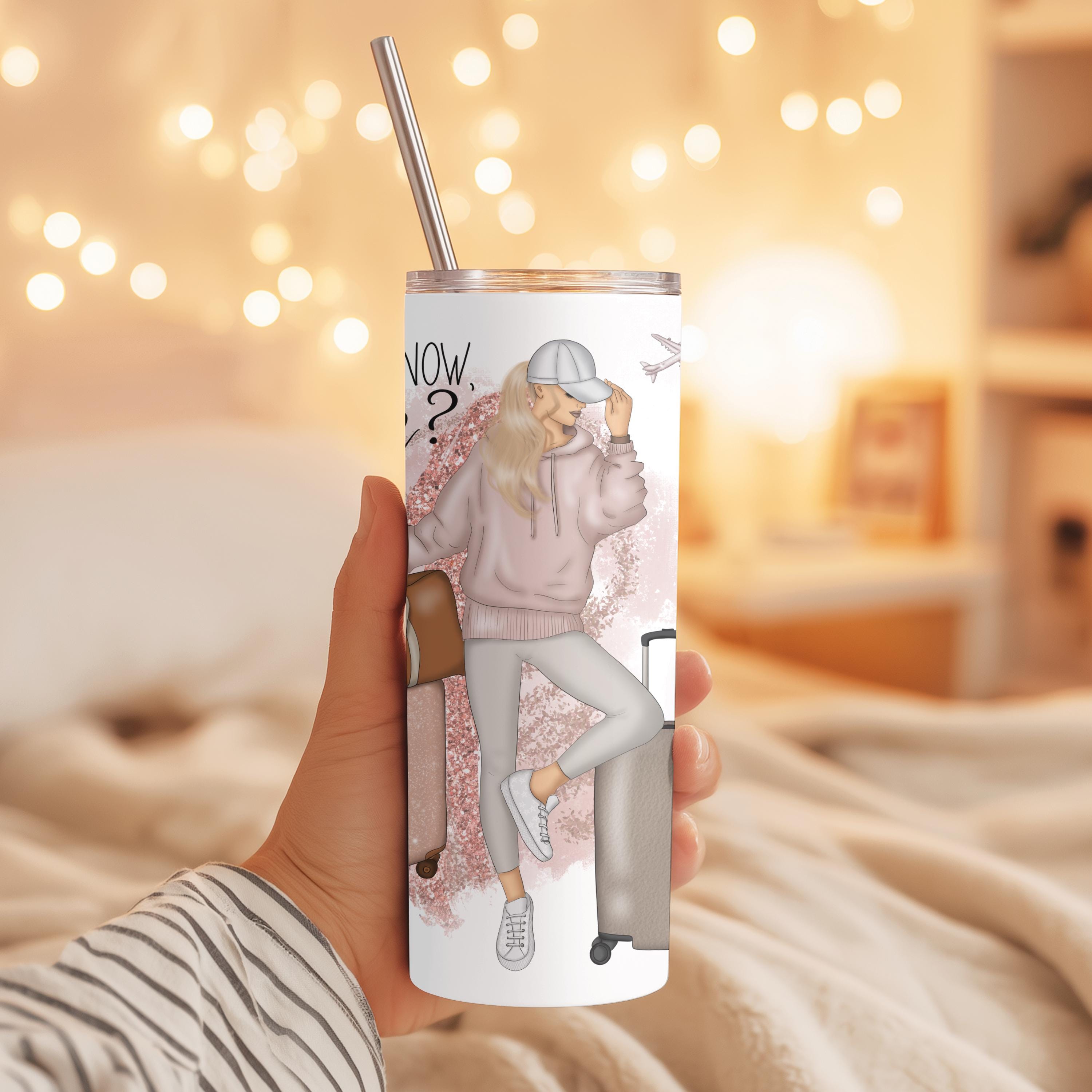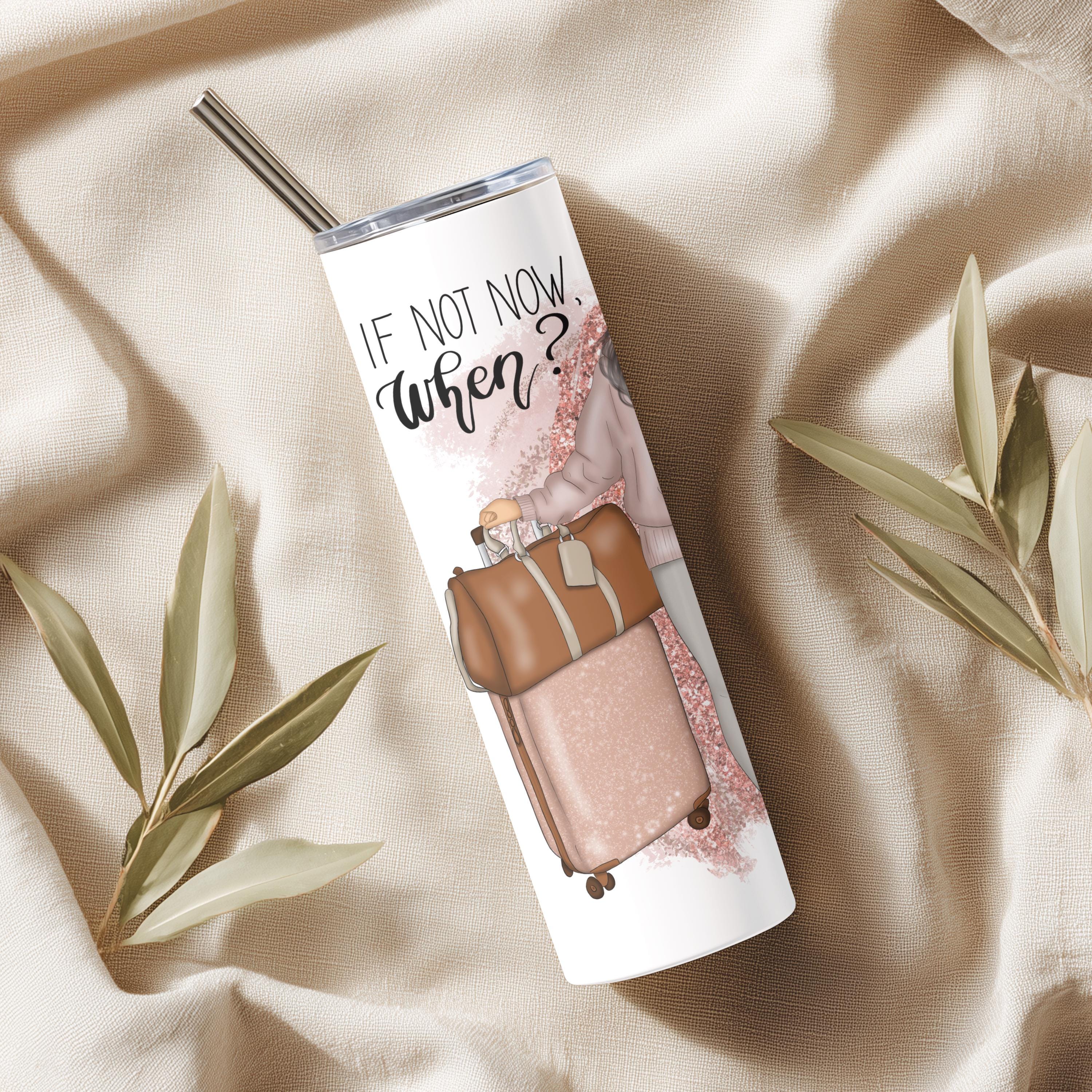 This personalized travel girl tumbler is a reminder to chase dreams, book the trip, and live boldly. Featuring an inspiring illustration of a stylish woman ready to travel and the phrase “If Not Now, When?”, this tumbler is perfect for anyone who loves adventure, travel, and meaningful quotes.