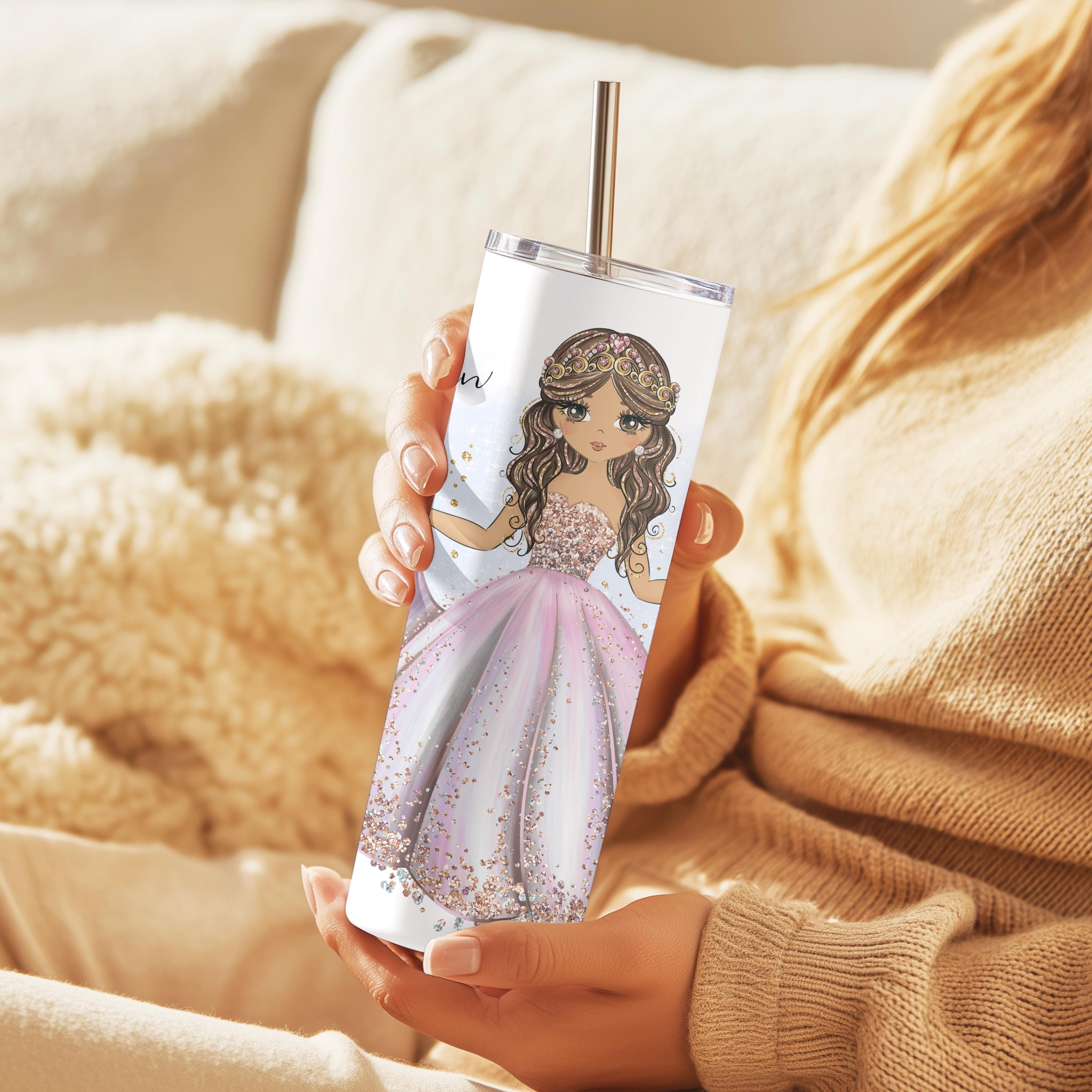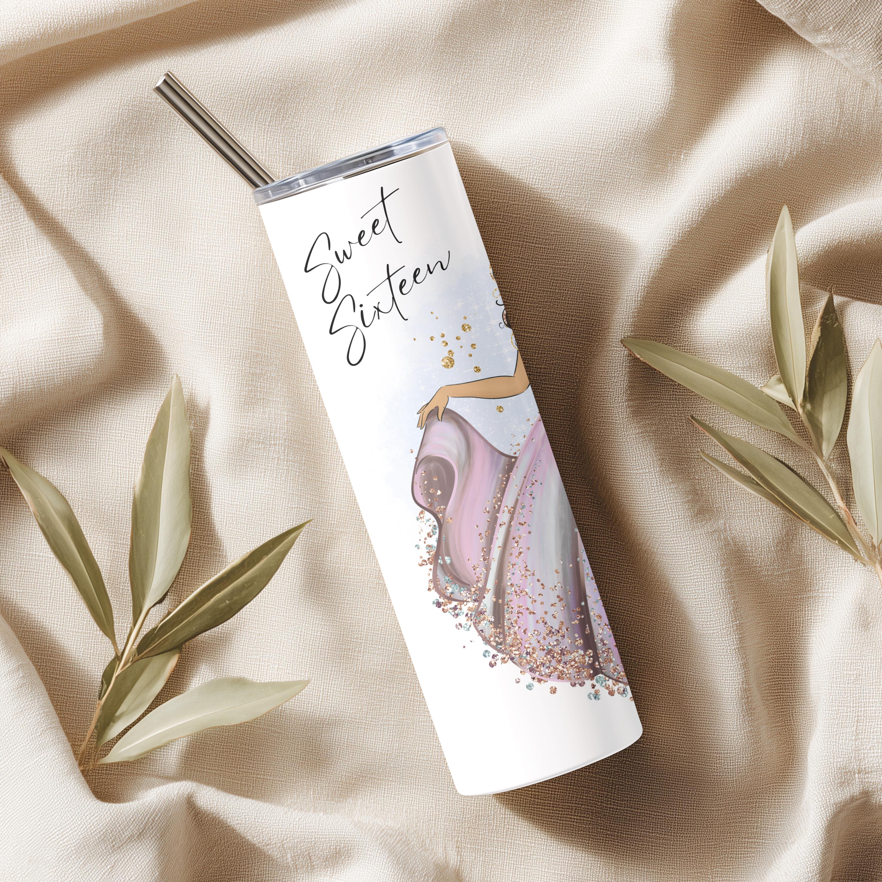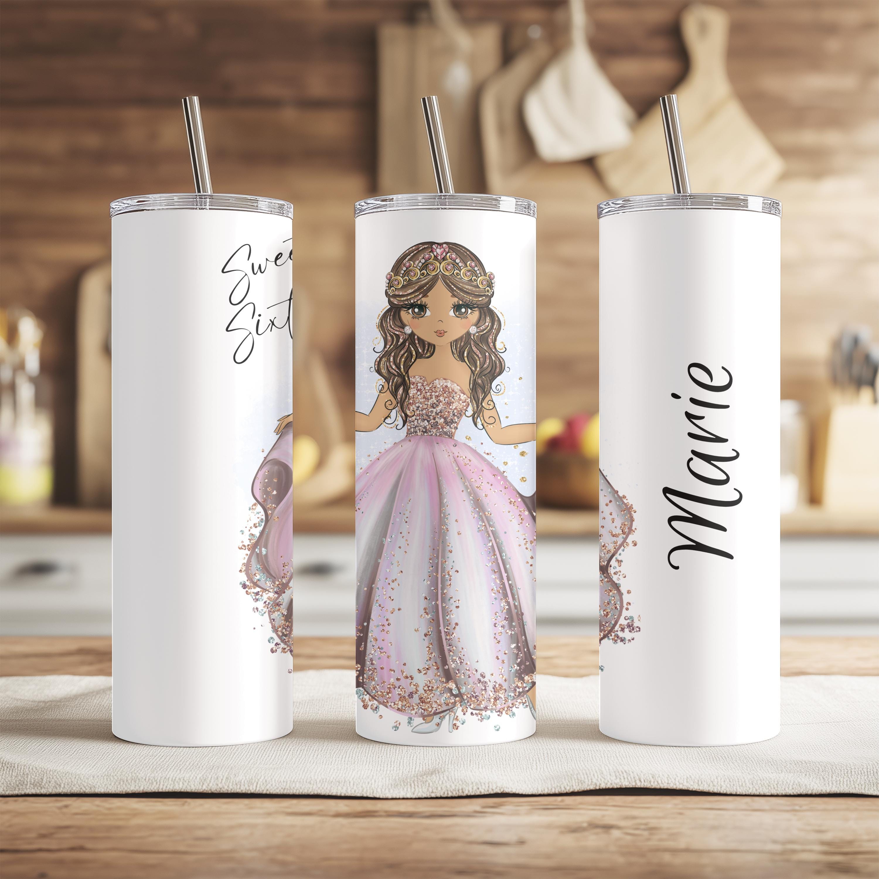 Celebrate a milestone birthday with this personalized Sweet Sixteen or Mis Quince tumbler, designed to make her feel truly special. Featuring an elegant princess-style gown illustration with sparkling details, this tumbler is perfect for Sweet 16 parties, Quinceañeras, and as a keepsake birthday gift.