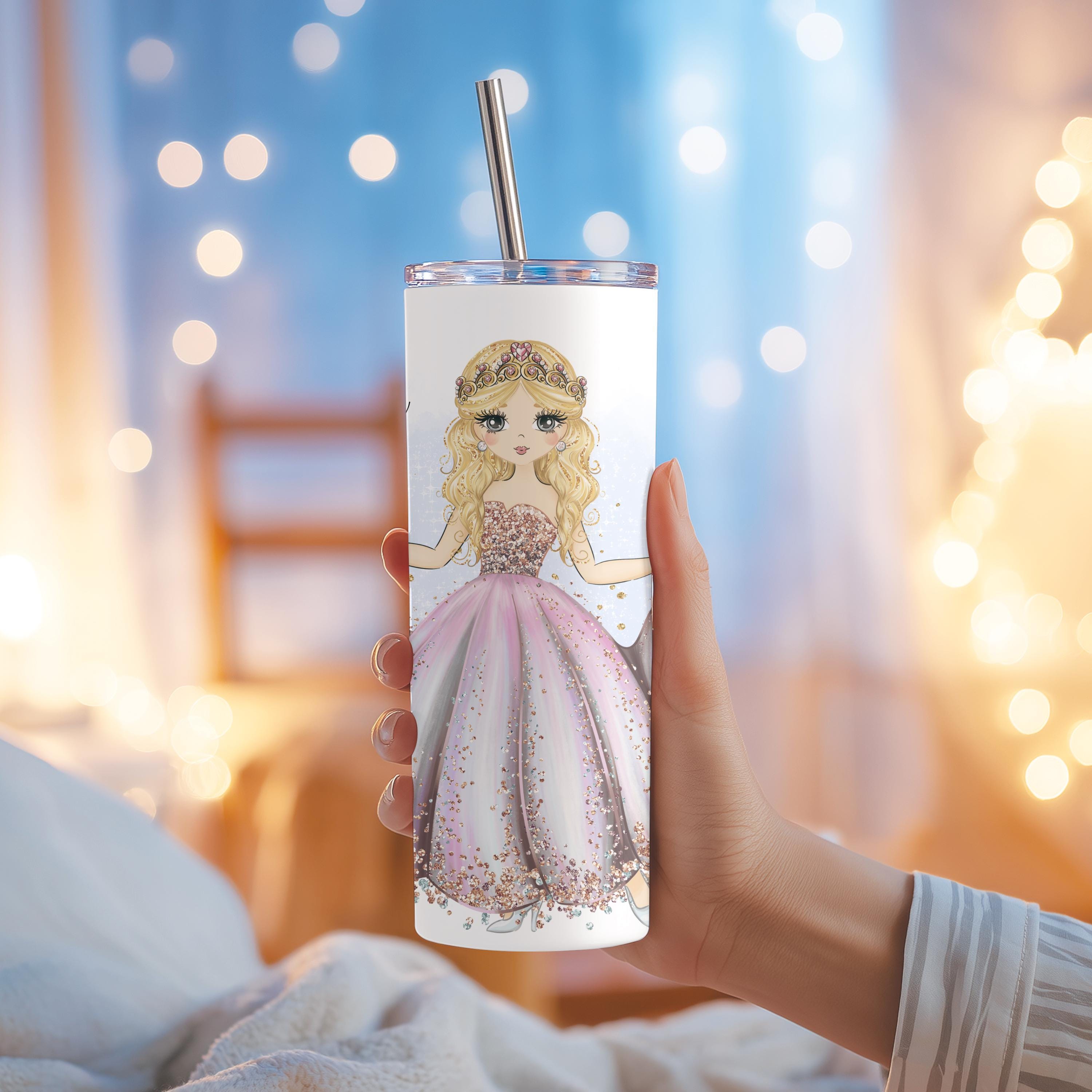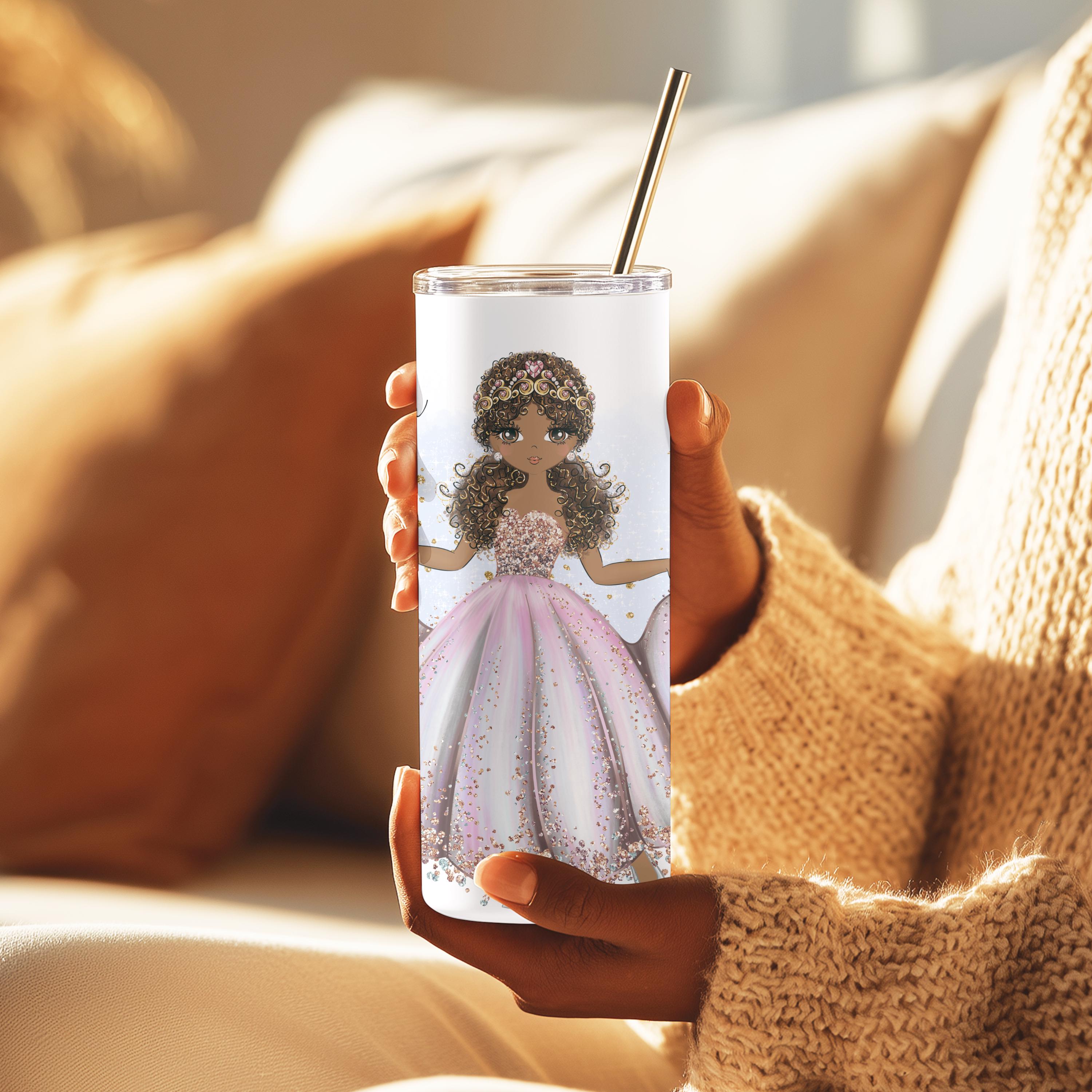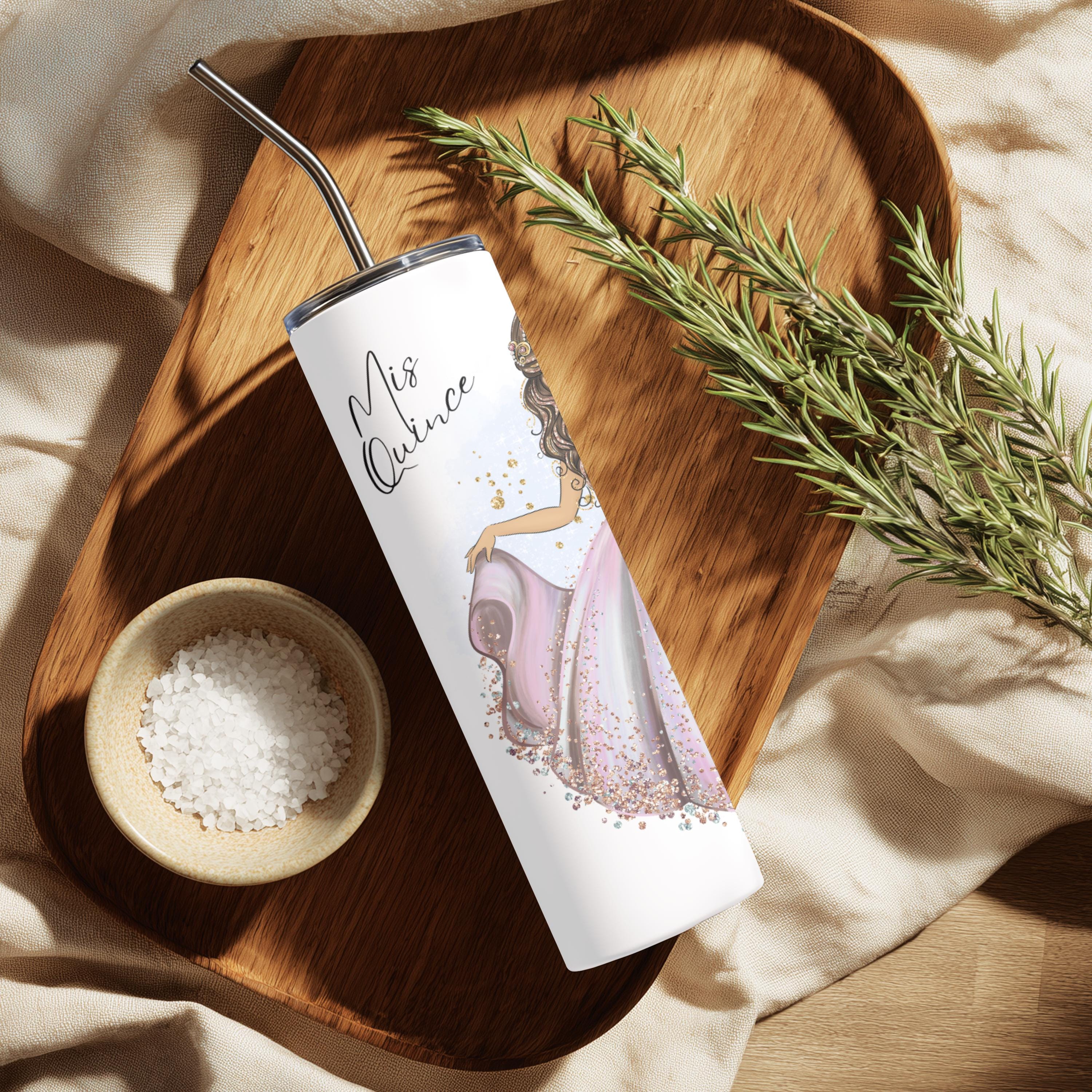 Celebrate a milestone birthday with this personalized Sweet Sixteen or Mis Quince tumbler, designed to make her feel truly special. Featuring an elegant princess-style gown illustration with sparkling details, this tumbler is perfect for Sweet 16 parties, Quinceañeras, and as a keepsake birthday gift.