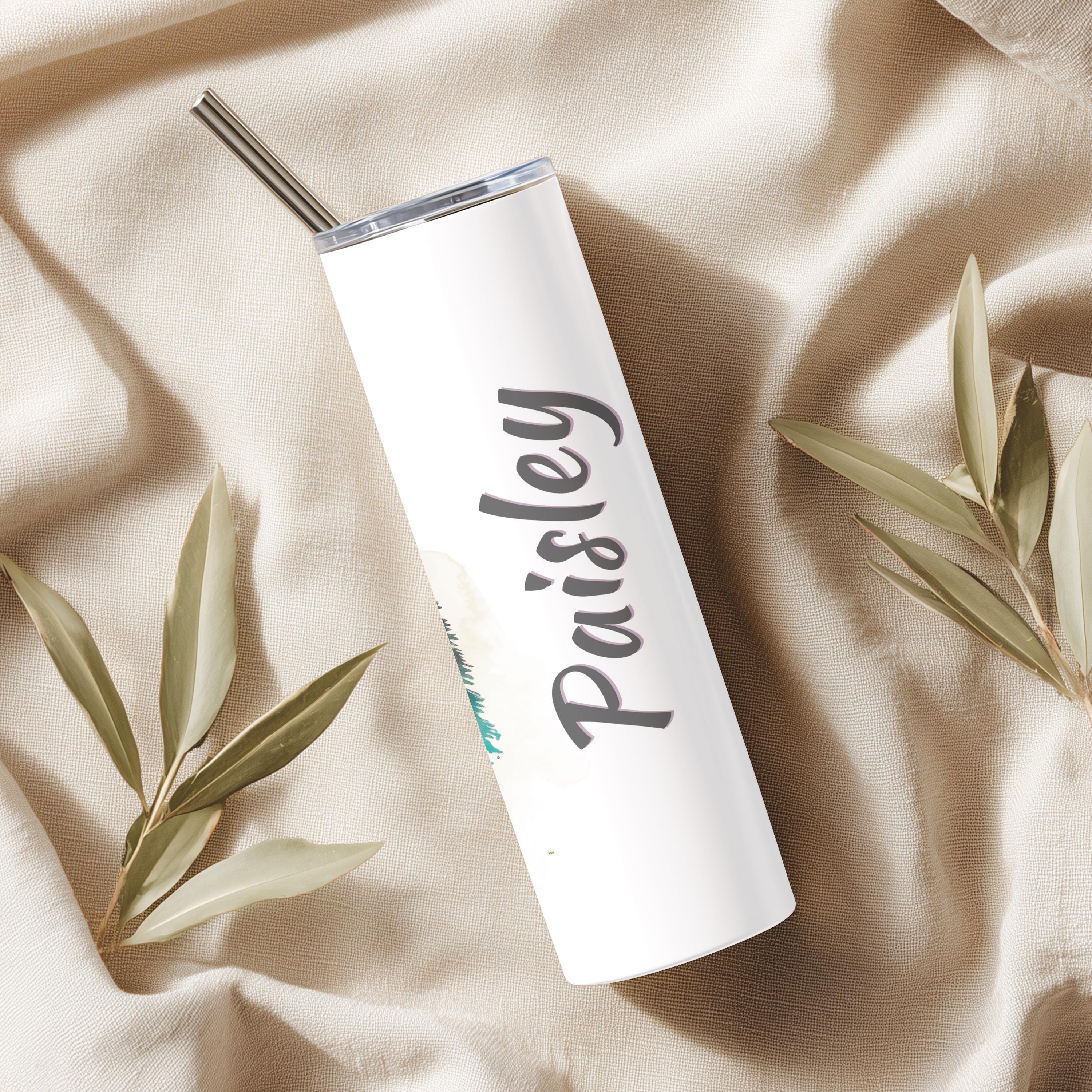 The 20oz stainless steel skinny tumbler is double-walled and vacuum-insulated, keeping drinks hot or cold for hours! The exterior features a smooth, glossy white finish.