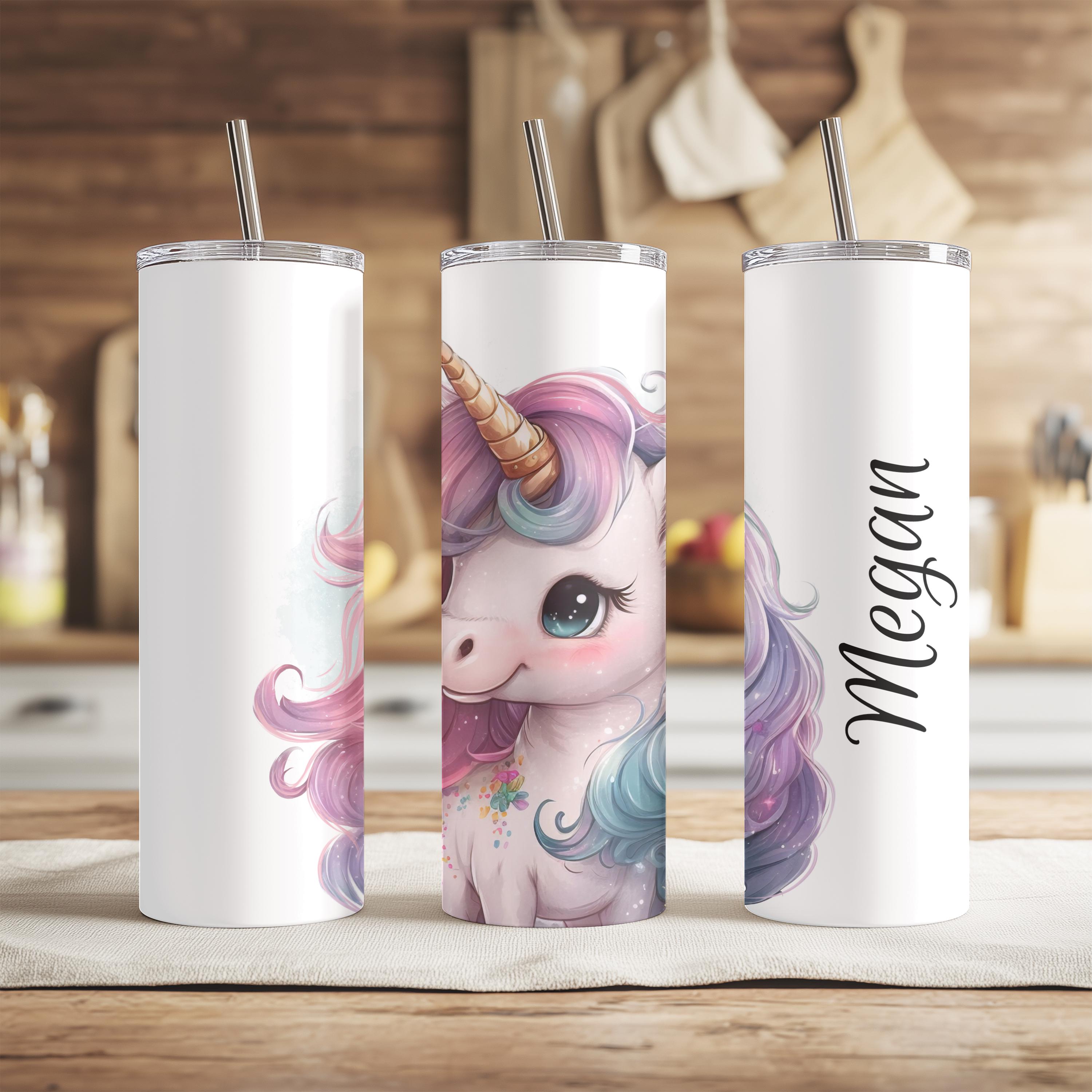This personalized unicorn tumbler features an adorable pastel unicorn with flowing rainbow hair, soft watercolor details, and a magical sparkle feel that kids absolutely love.