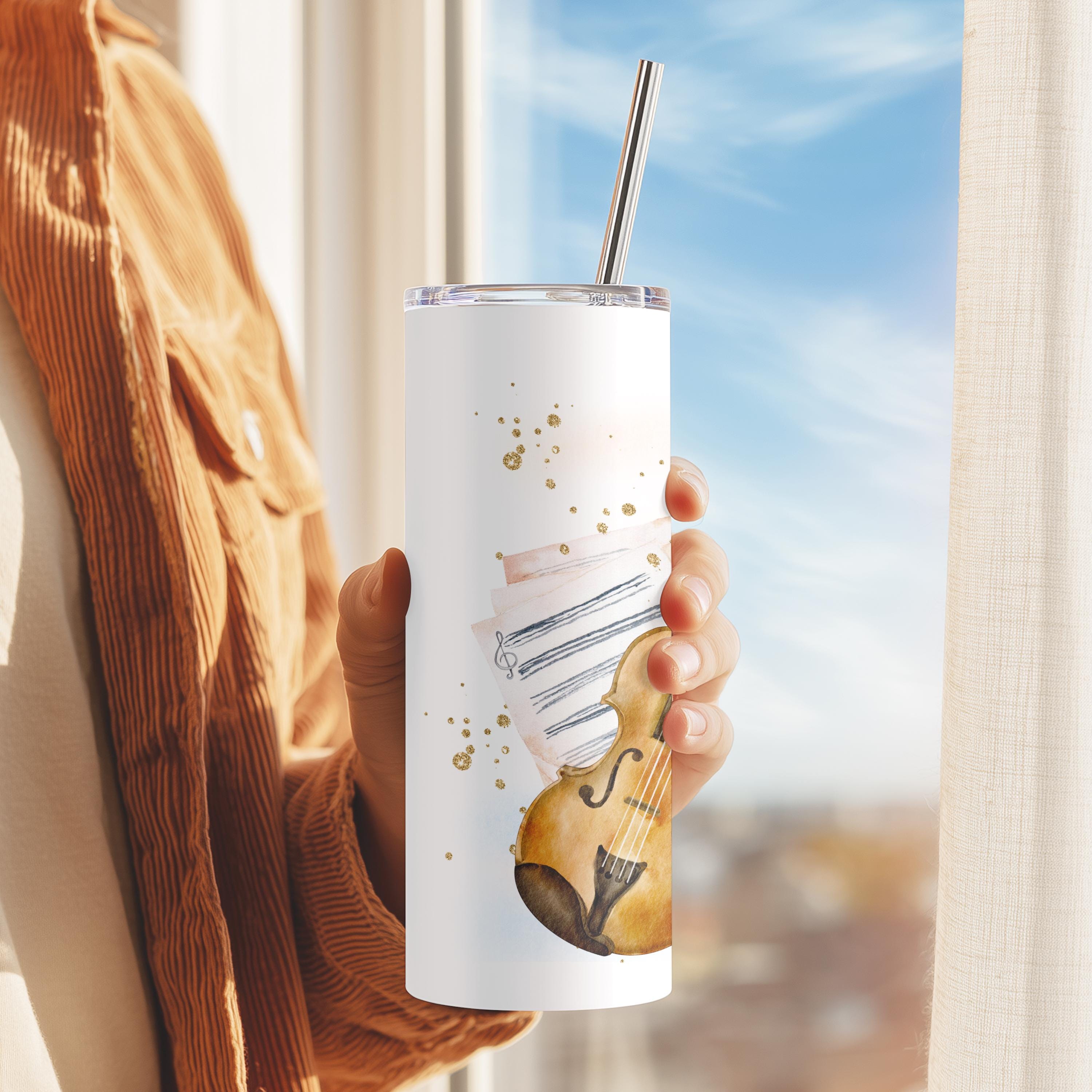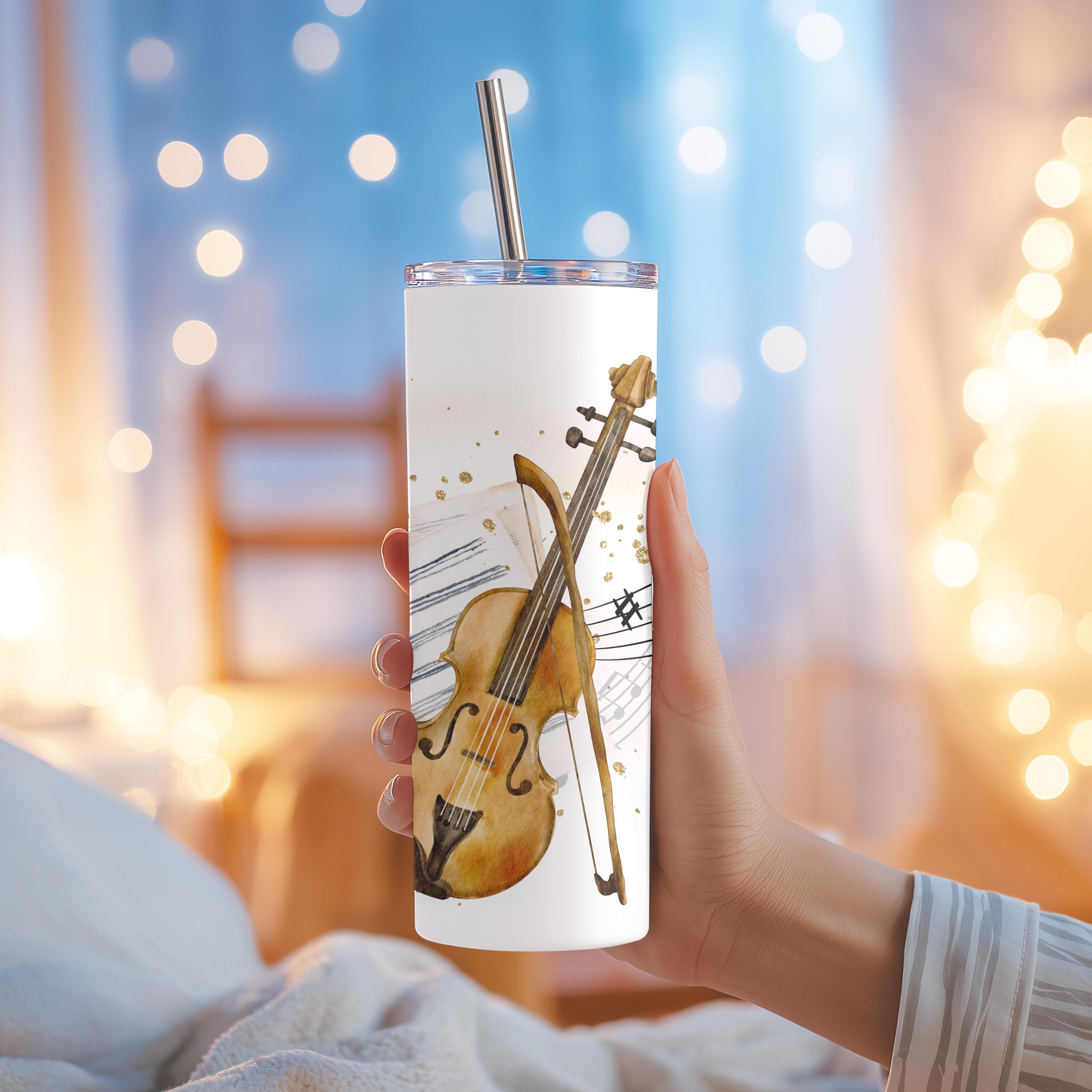 This personalized violin tumbler features a beautifully detailed watercolor violin paired with flowing musical notes, creating a timeless design for musicians and music lovers alike.