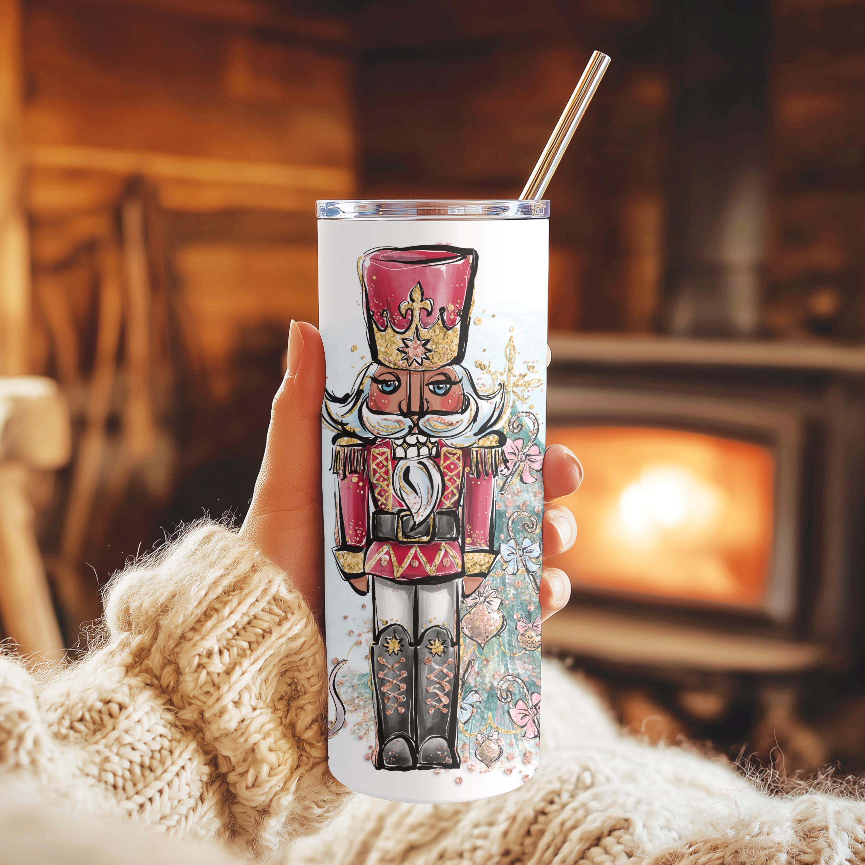 Celebrate the magic of the holiday season with this beautifully illustrated nutcracker tumbler, featuring a classic nutcracker design with soft watercolor details, festive ornaments, and elegant holiday accents.