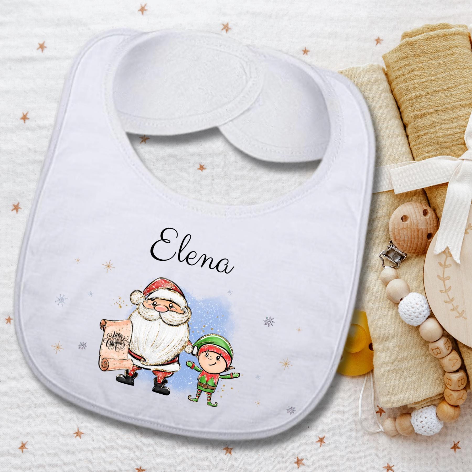 Make your baby's holiday season even more magical with this adorable Santa and Elf personalized bib. Featuring a sweet watercolor-style design with Santa holding a "Nice List" and his cheerful elf companion, it's the perfect mix of festive charm and cuteness overload.
