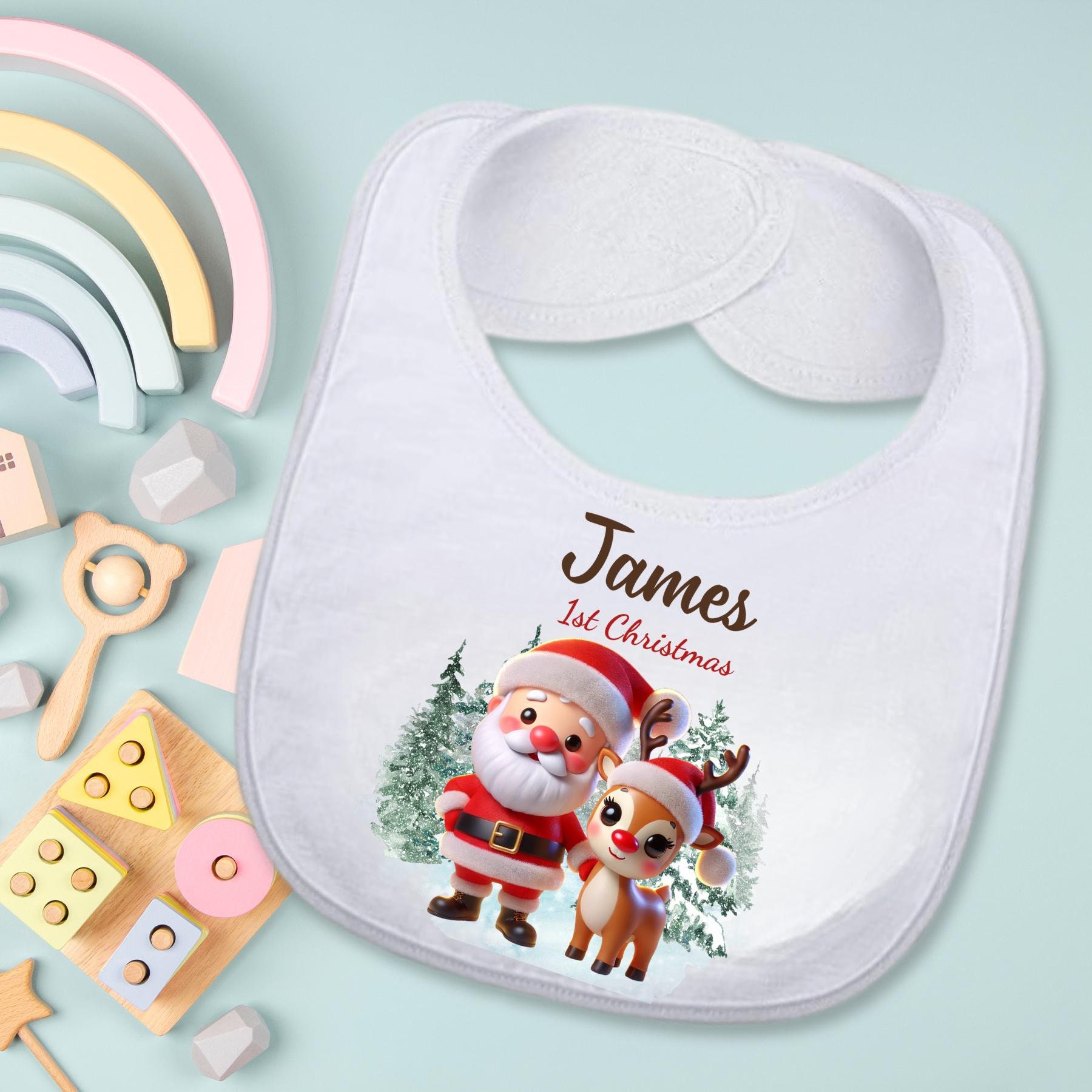 Make your little one’s holiday season even more magical with this personalized baby bib and sippy cup Christmas set. Choose from four adorable winter designs featuring Santa, reindeer, and snowman scenes — each one customized with your baby’s name and “1st Christmas” for the perfect keepsake.