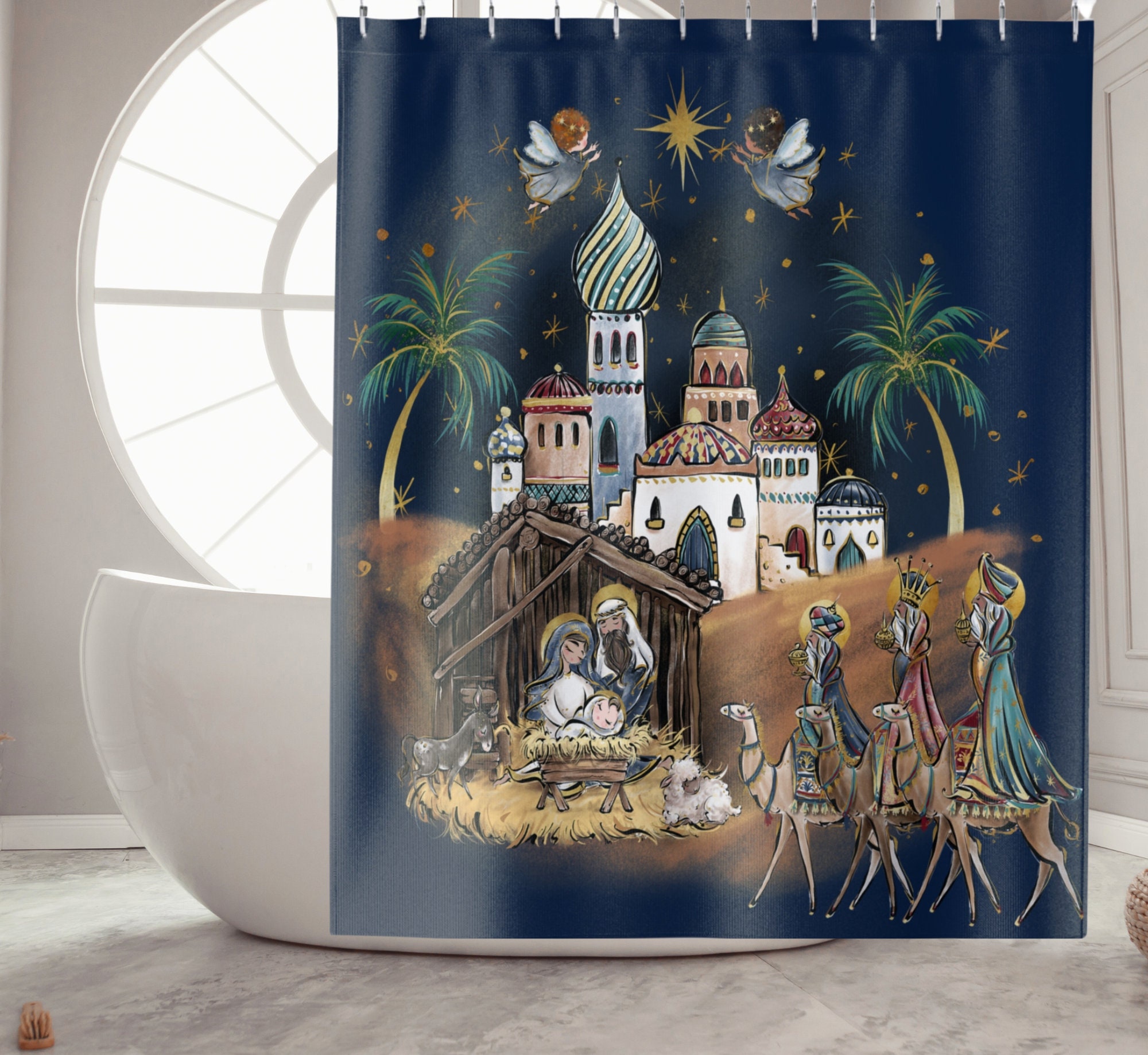 Transform your bathroom into a festive wonderland with our Christmas shower curtain! This curtain features a beautiful Nativity scene with Baby Jesus, adding a touch of holiday cheer to your bathroom decor.