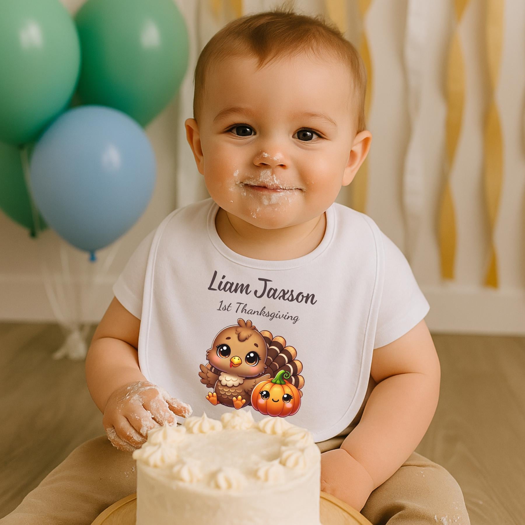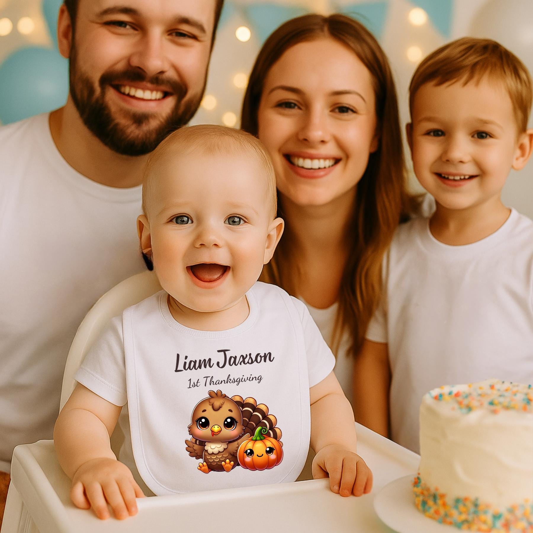 Make your little one’s first Thanksgiving extra adorable with this personalized baby bib! Featuring a sweet cartoon turkey and smiling pumpkin, this bib is perfect for capturing precious holiday moments. Customizable with your baby’s name, it’s a festive keepsake parents will cherish forever.