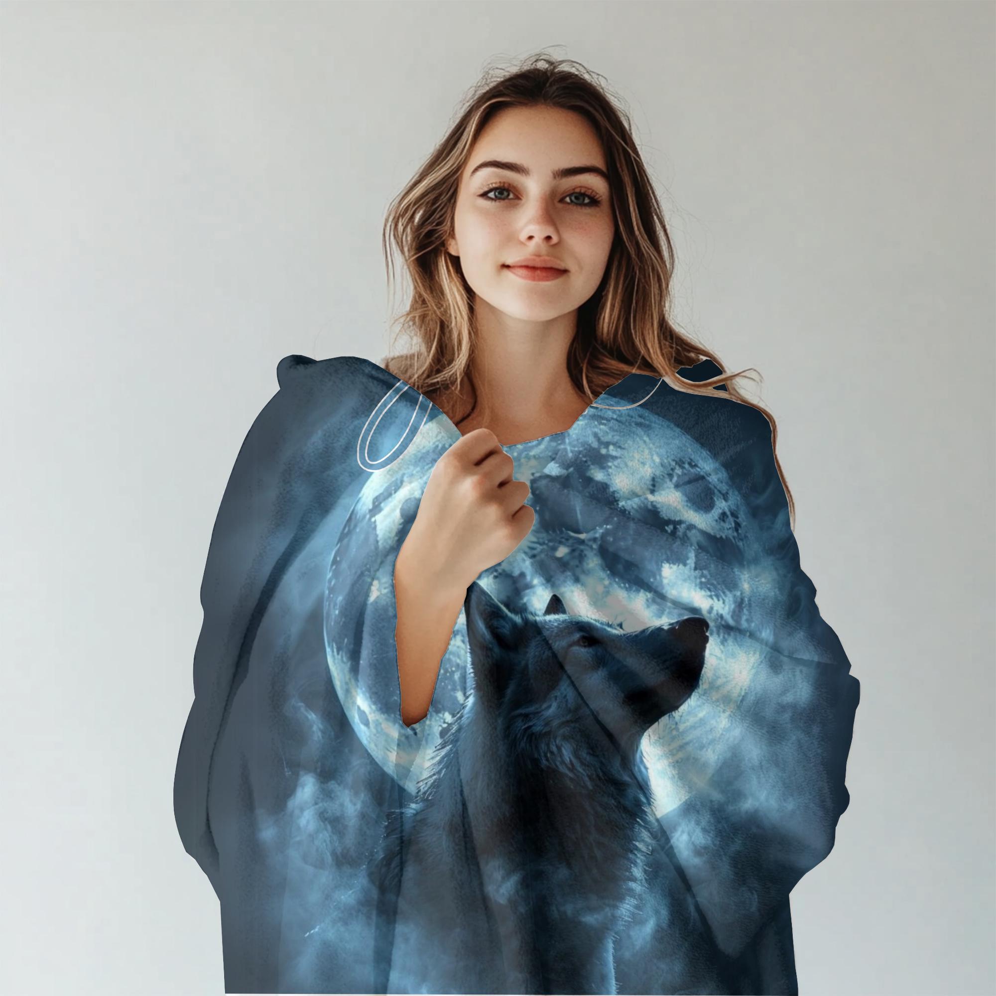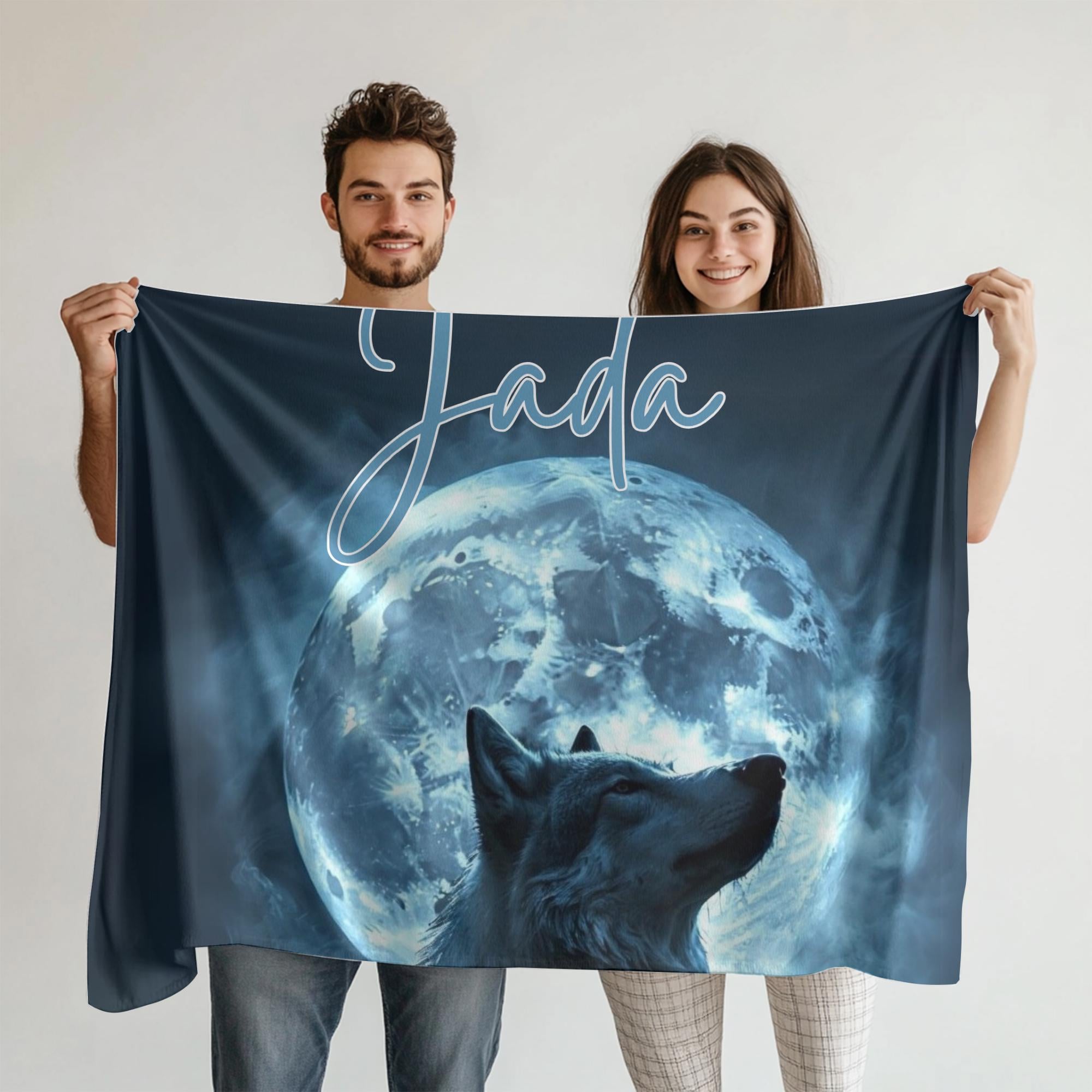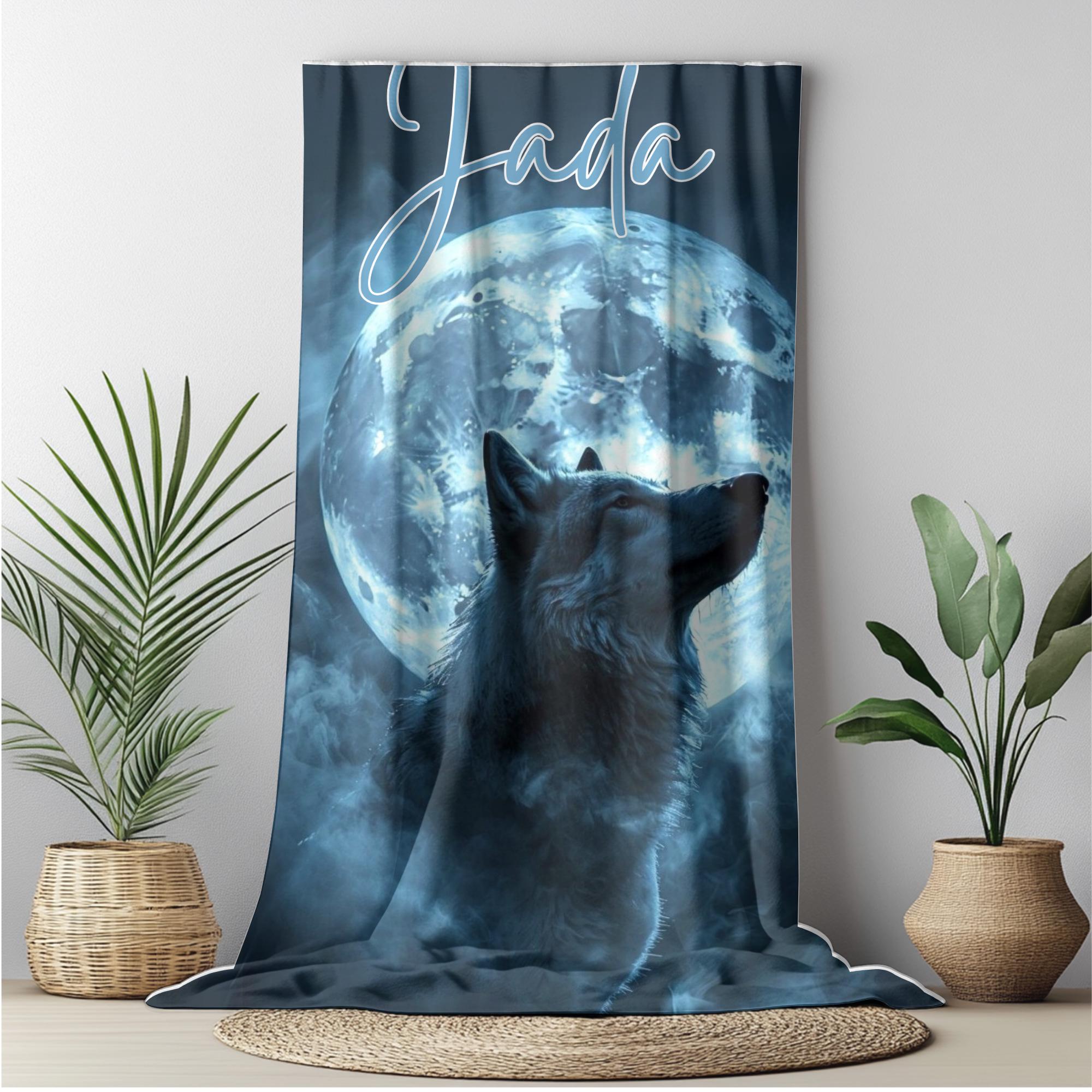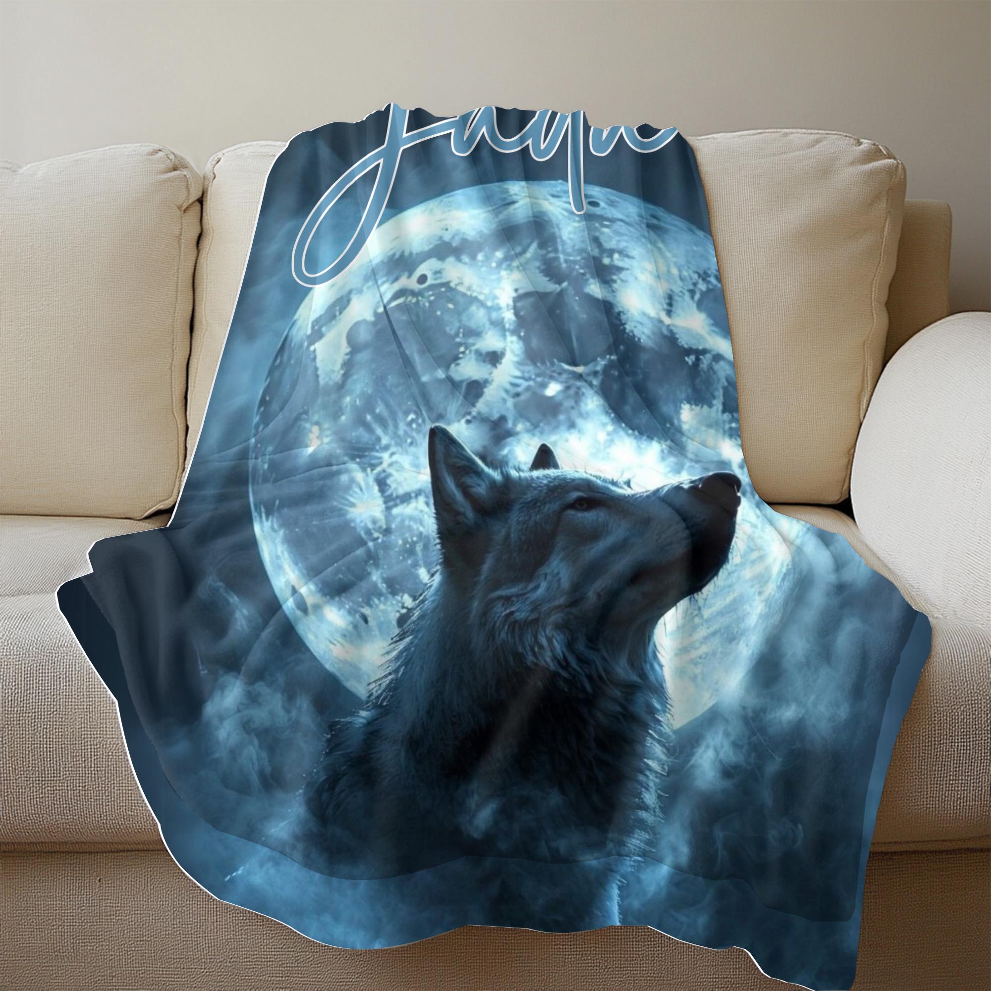 Featuring a stunning, realistic wolf silhouette illuminated by a glowing full moon, swirling mist, and your custom name at the top, this blanket feels magical, bold, and deeply personal.