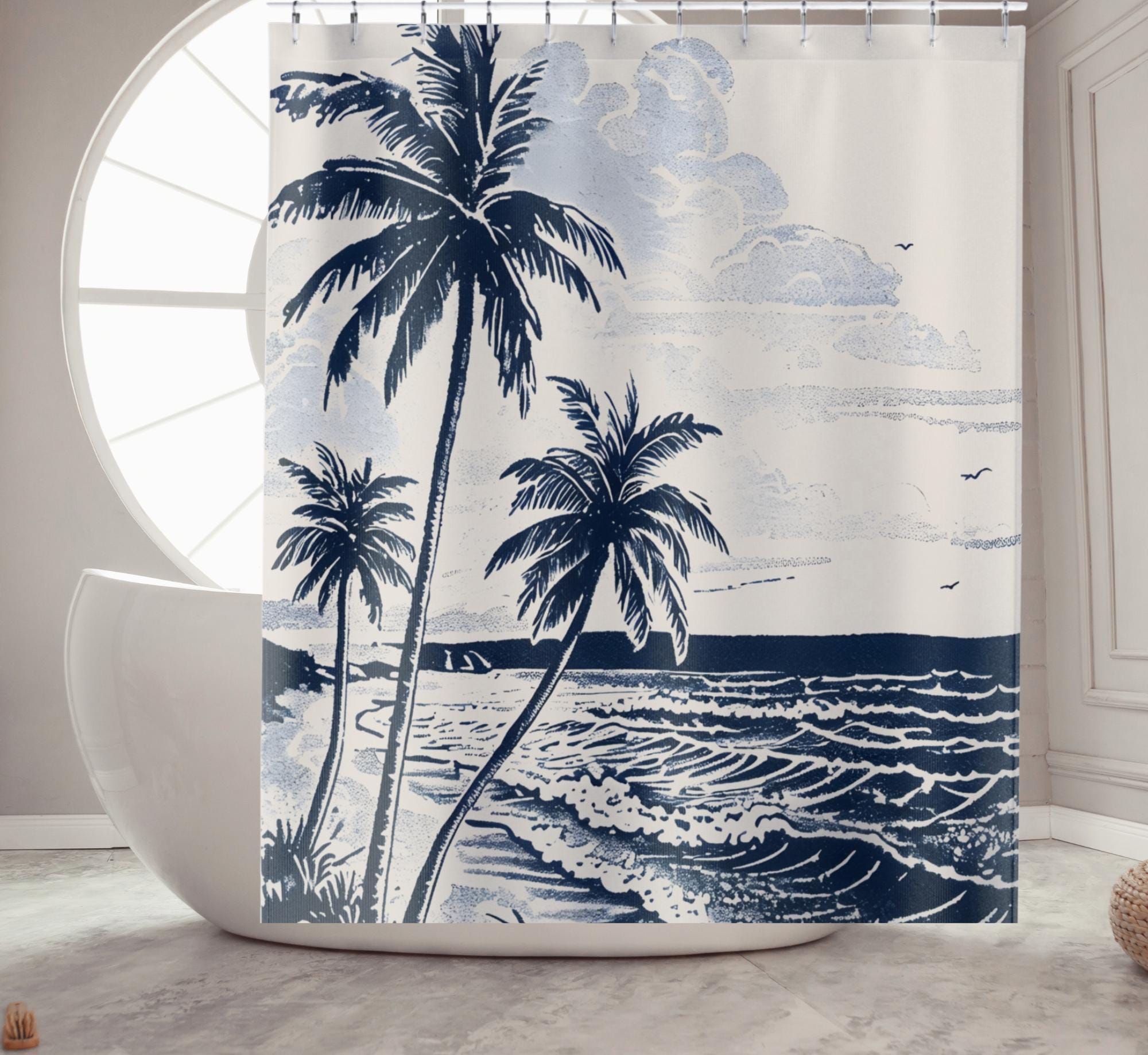 Crafted with care, this cute shower curtain enhances your bathing experience and serves as a stylish bathroom accessory. Whether you're decorating your home or searching for the perfect housewarming gift, our ocean shower curtain is a fantastic choice. Bring a piece of the beach to your daily routine with our navy blue bath curtain and enjoy the refreshing vibe it brings!