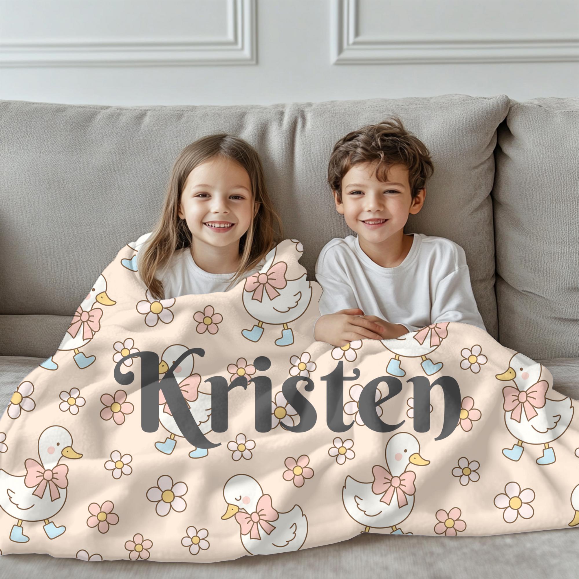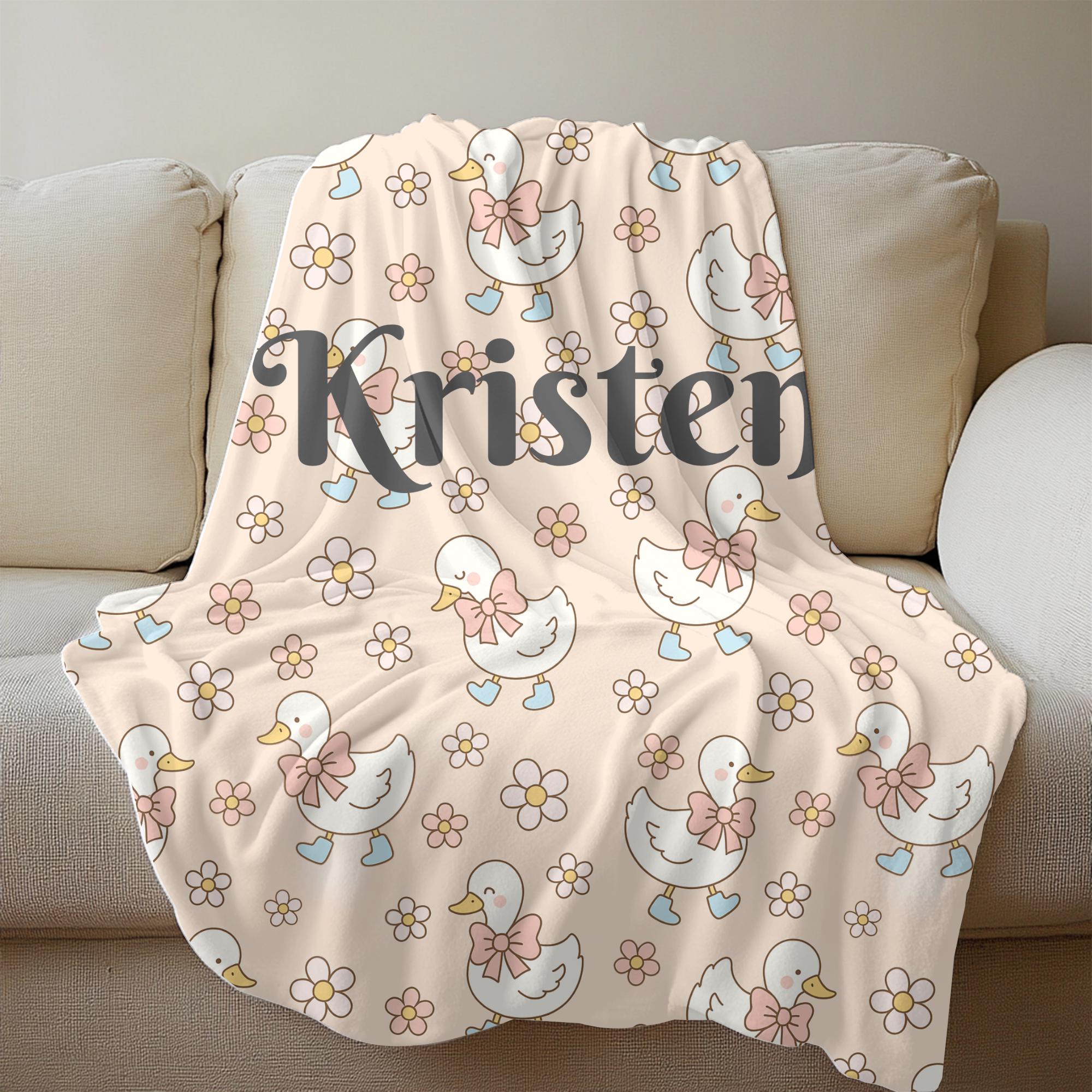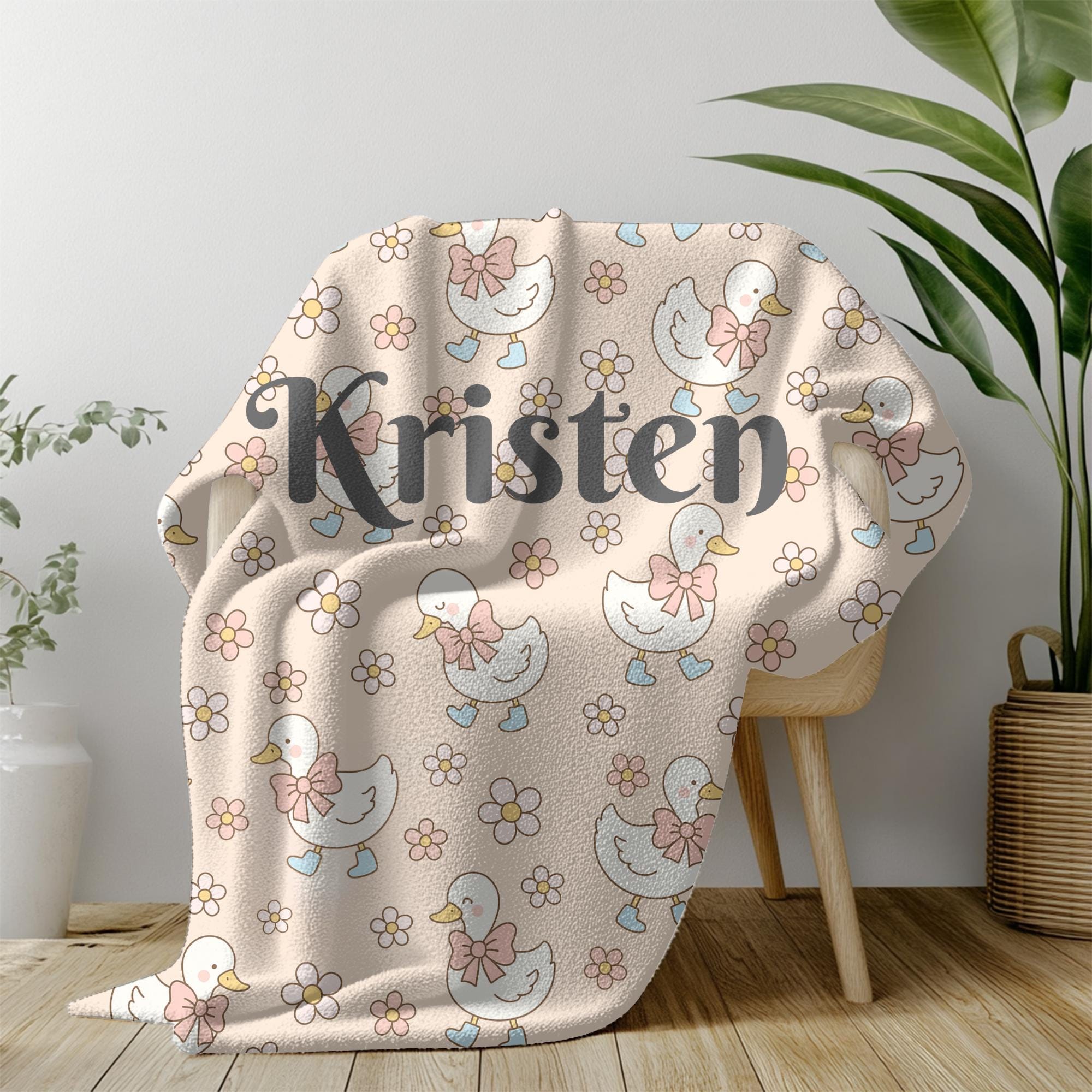 Snuggle up in sweetness with this personalized goose blanket, featuring the most charming little geese dressed in pastel bows and boots. Scattered with delicate hand-drawn flowers, this soft and cozy fleece blanket brings a touch of vintage whimsy and cottagecore charm to any nursery or toddler space.