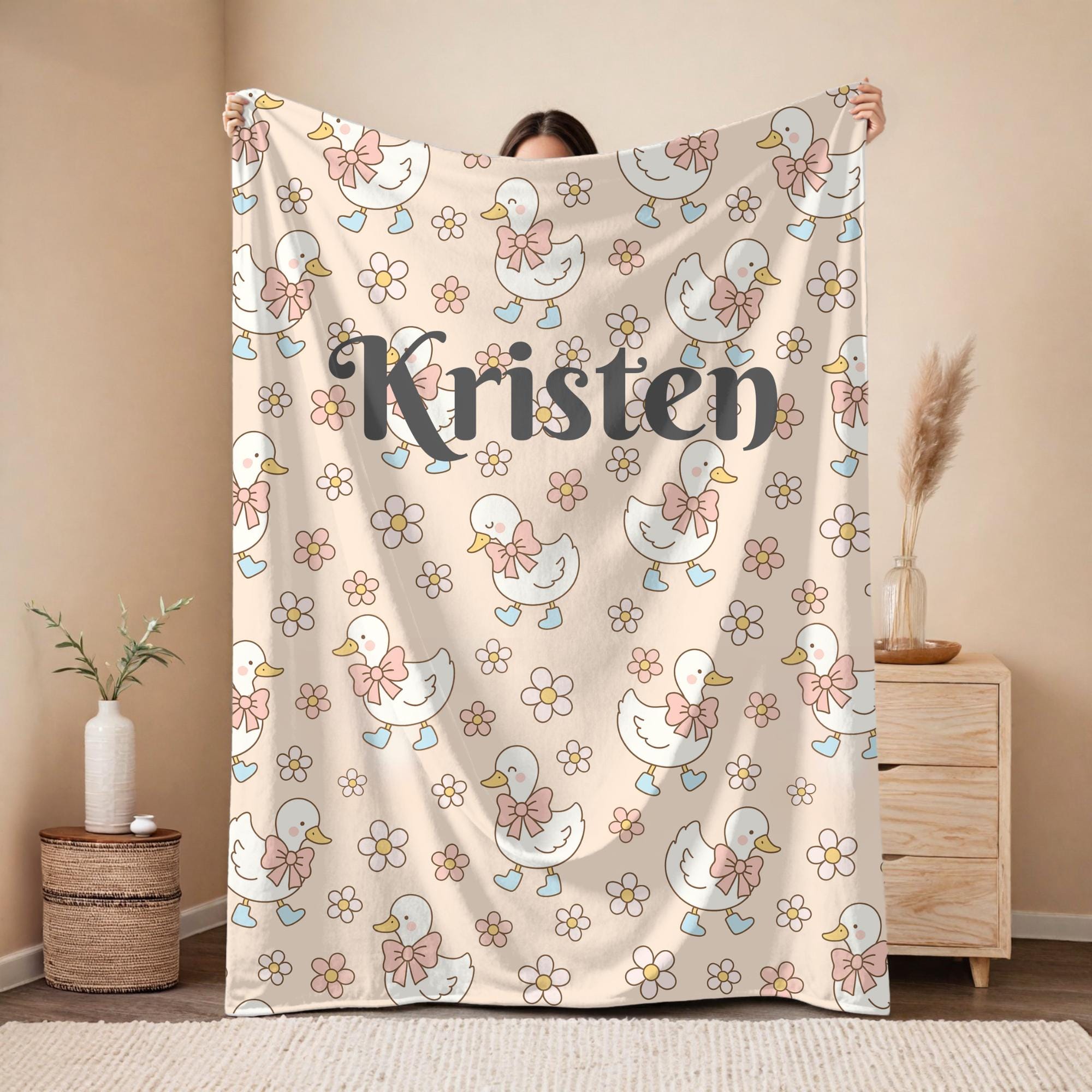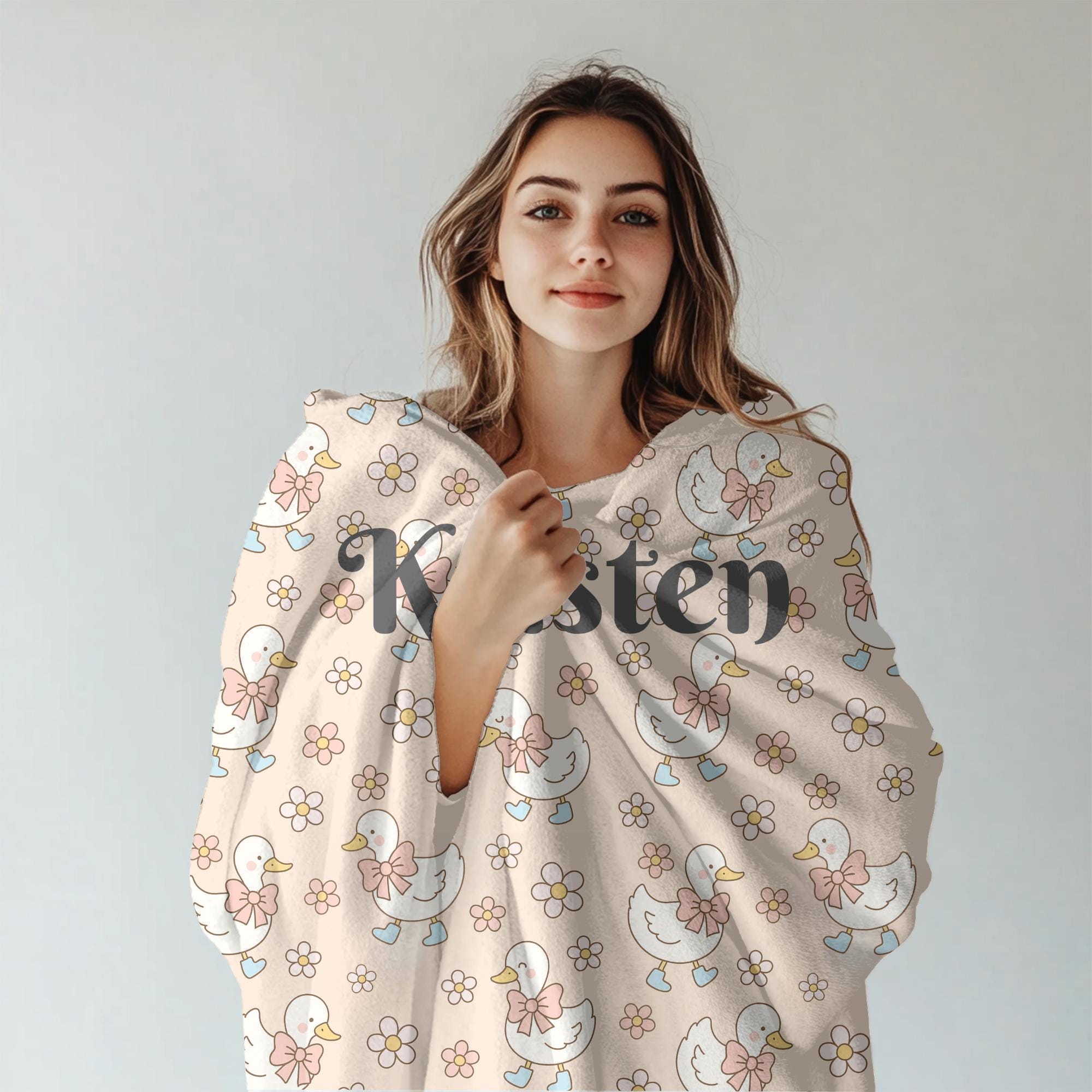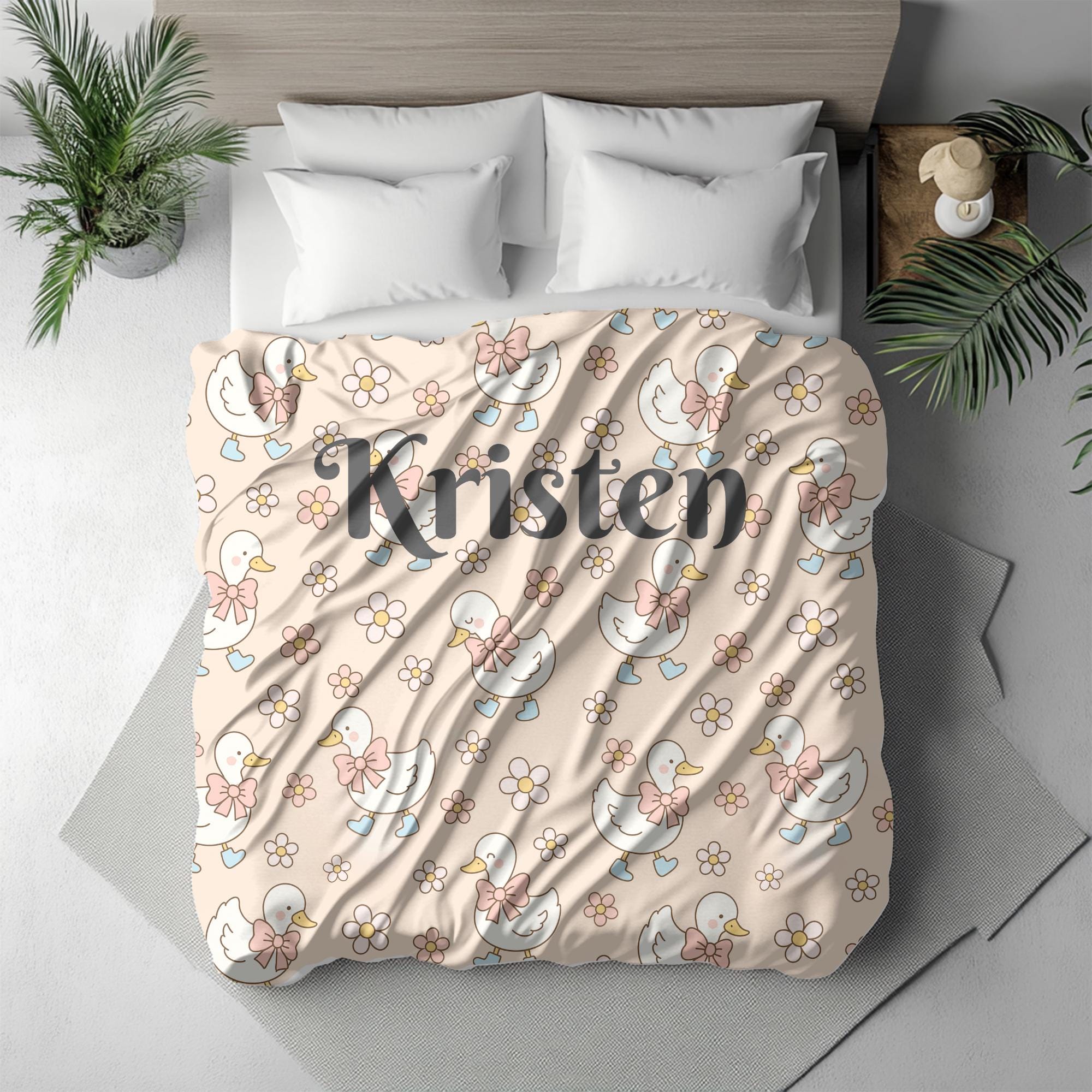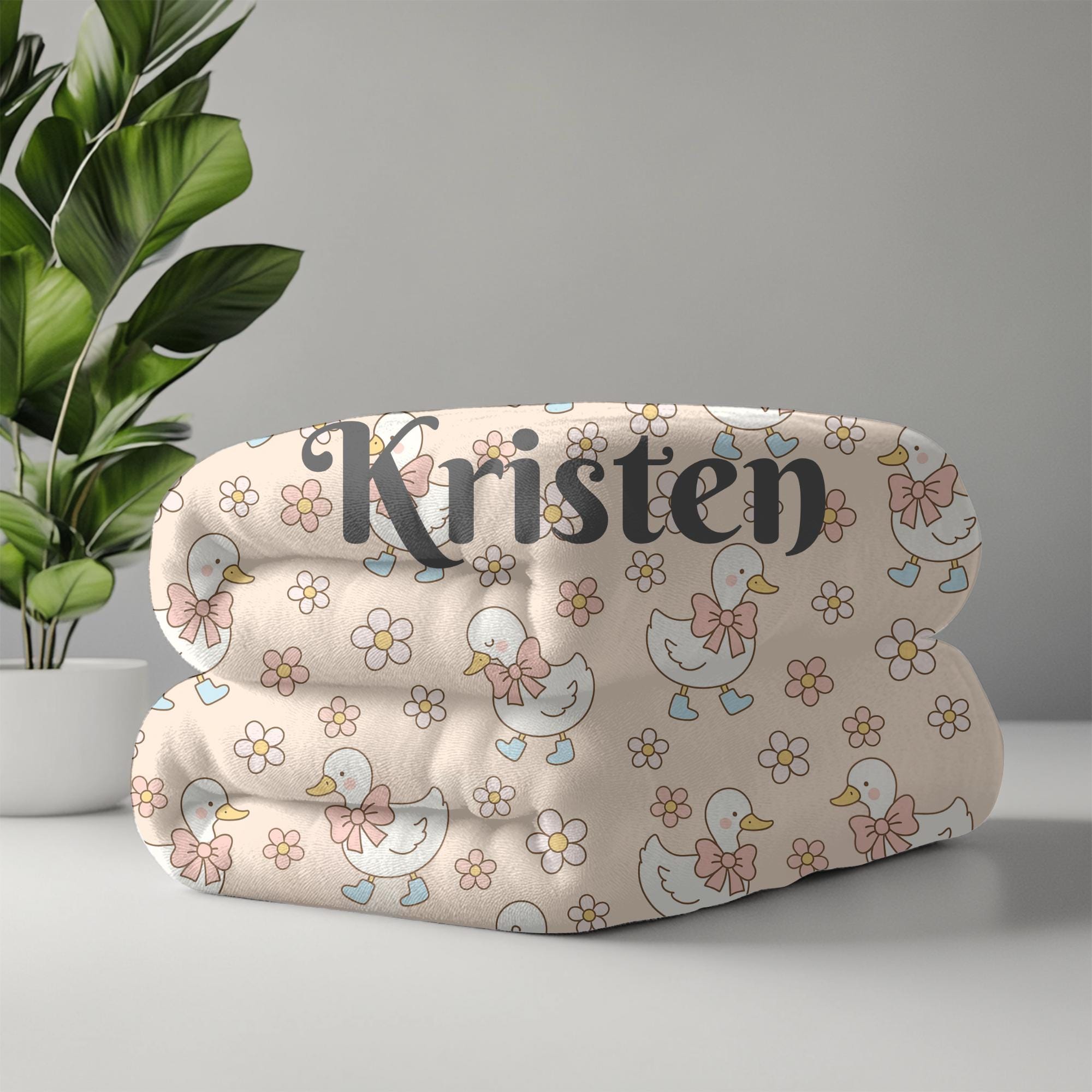 Snuggle up in sweetness with this personalized goose blanket, featuring the most charming little geese dressed in pastel bows and boots. Scattered with delicate hand-drawn flowers, this soft and cozy fleece blanket brings a touch of vintage whimsy and cottagecore charm to any nursery or toddler space.