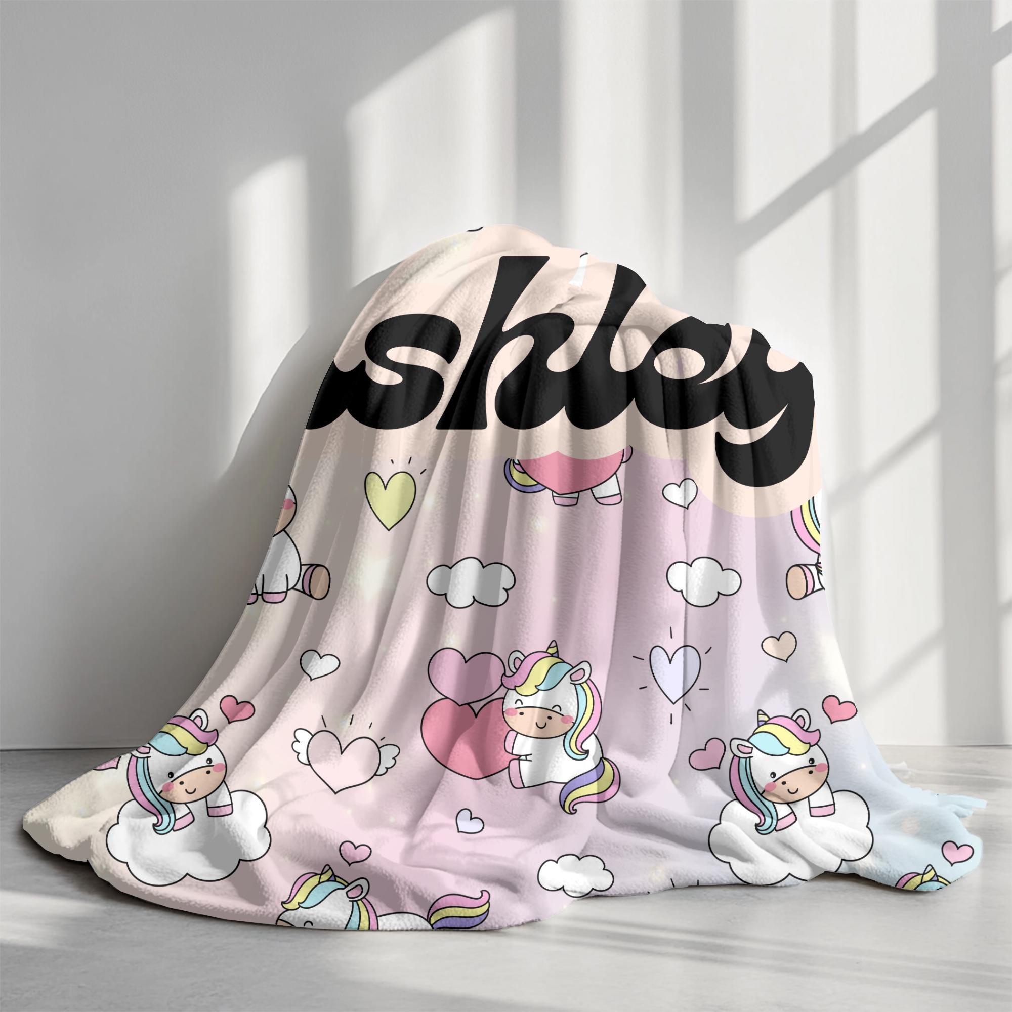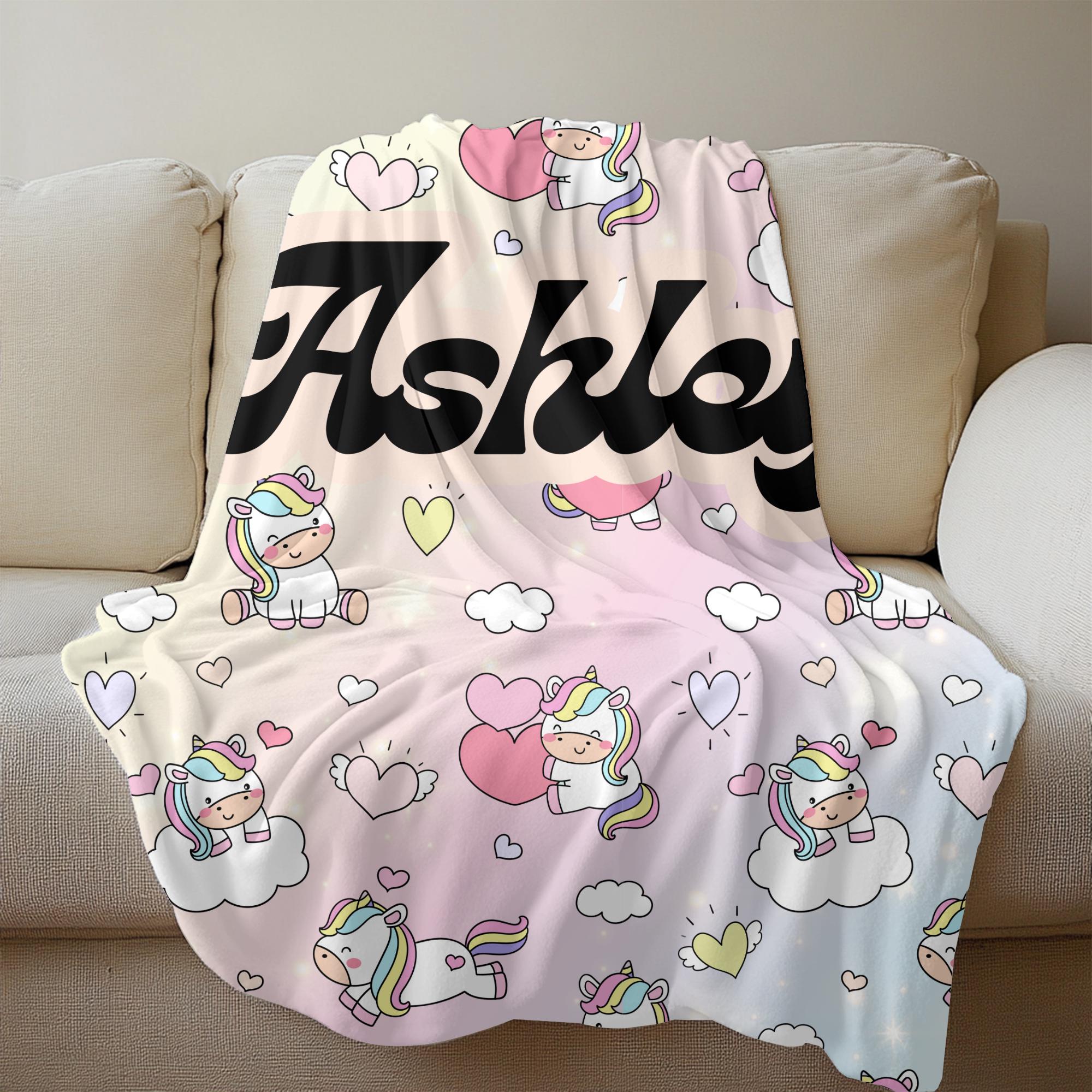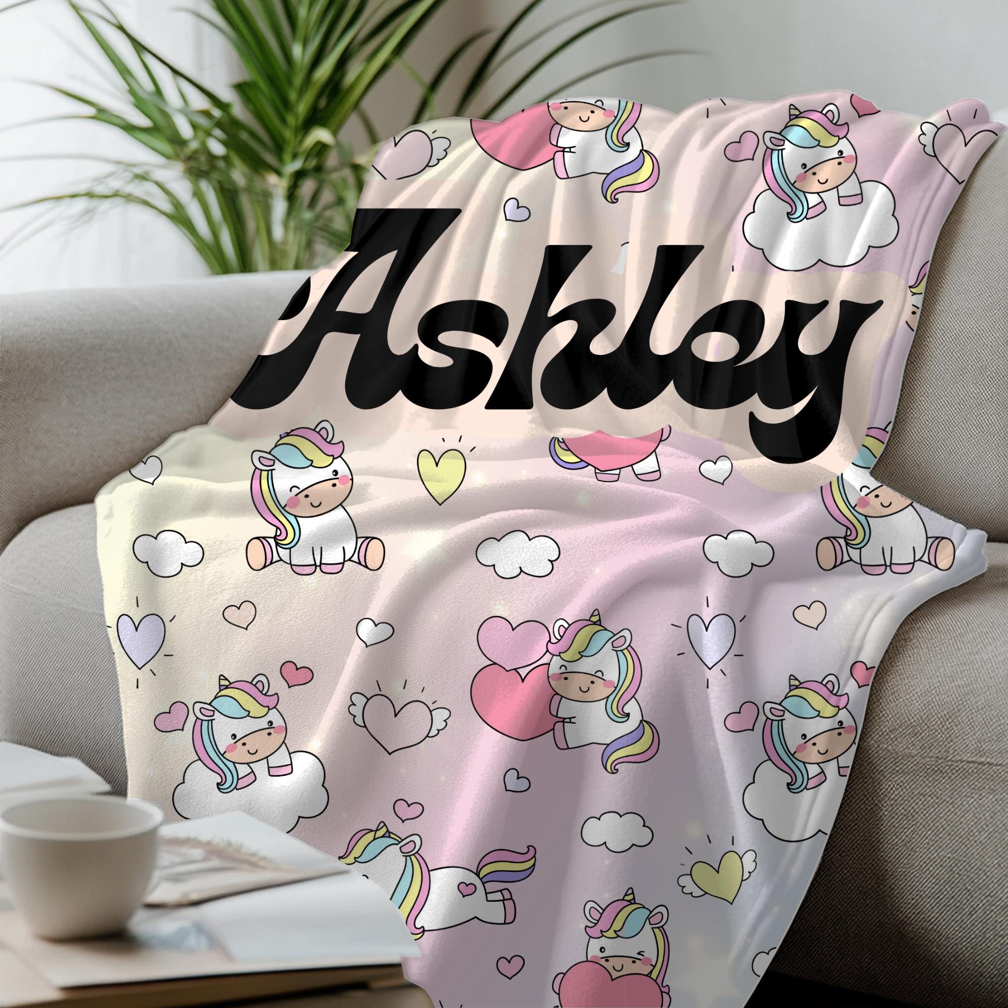 This cozy blanket features a pastel rainbow background filled with adorable unicorns, puffy clouds, sparkly stars, and heart details. Your child’s name takes center stage in a bold, playful font, making this blanket uniquely theirs. The vibrant, all-over print is full of joyful color, perfect for adding a pop of personality to any bedroom, nursery, or playroom.