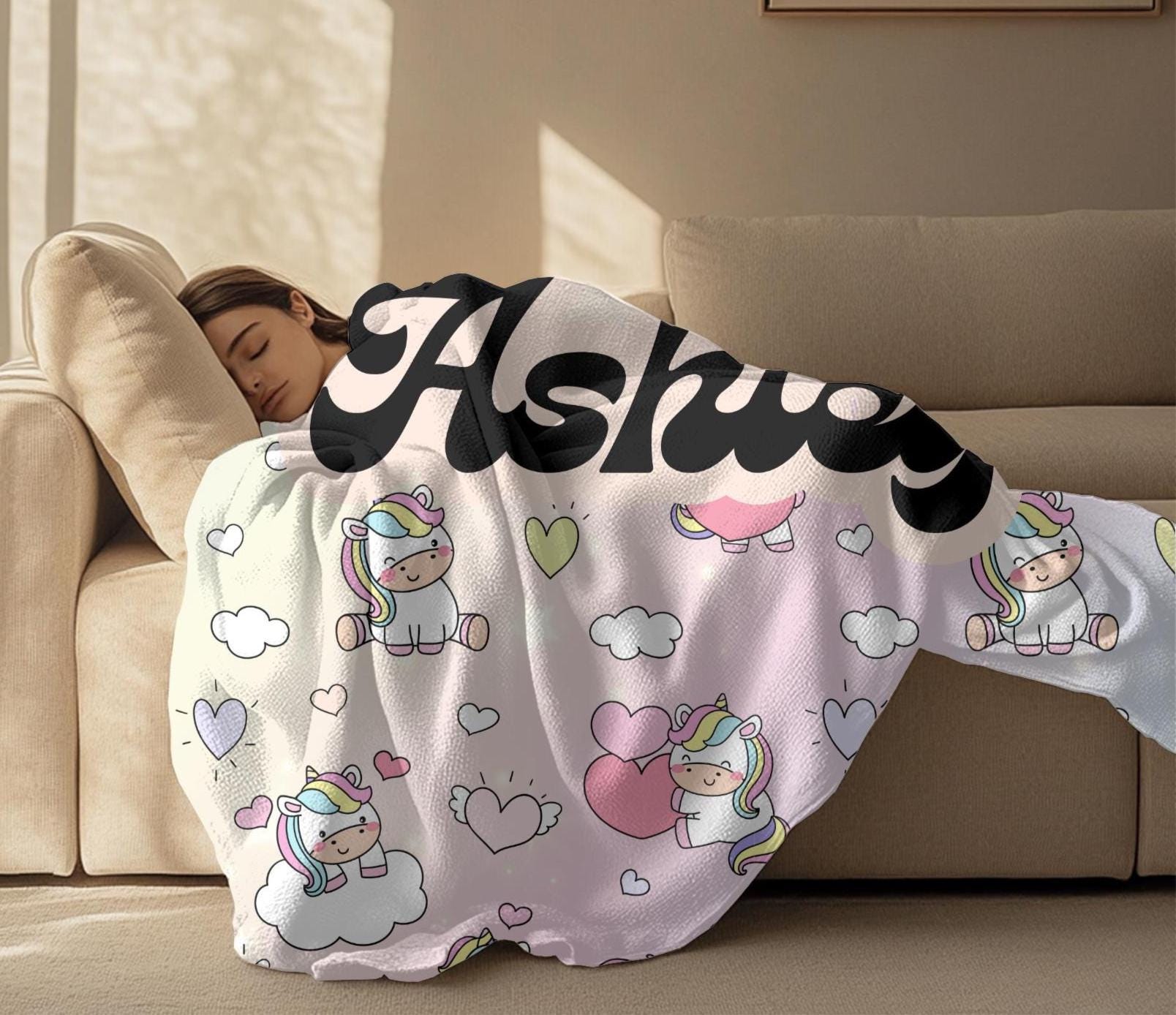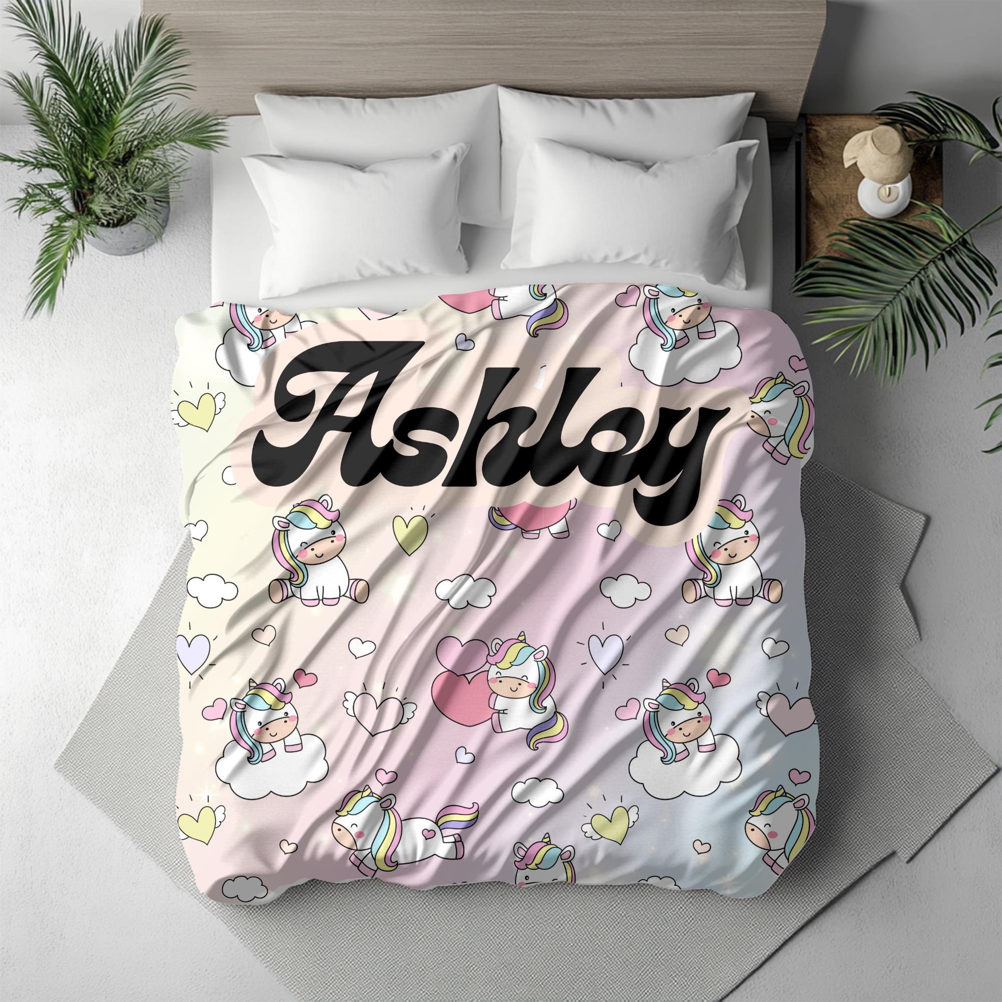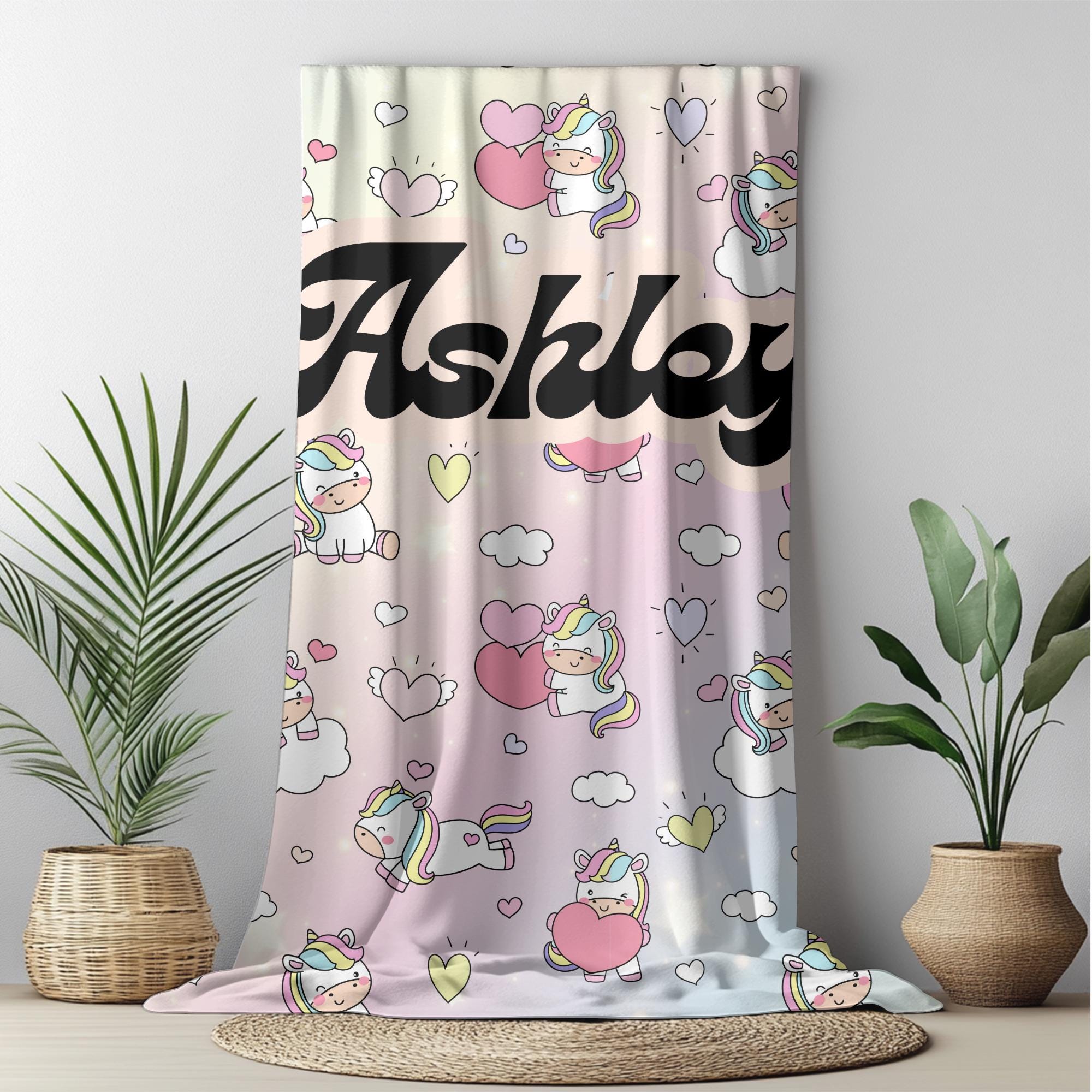 This cozy blanket features a pastel rainbow background filled with adorable unicorns, puffy clouds, sparkly stars, and heart details. Your child’s name takes center stage in a bold, playful font, making this blanket uniquely theirs. The vibrant, all-over print is full of joyful color, perfect for adding a pop of personality to any bedroom, nursery, or playroom.