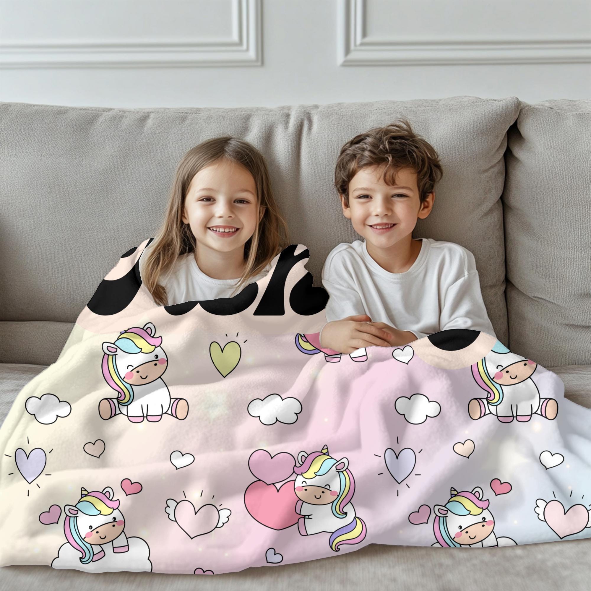 Add a little magic to bedtime with this personalized kawaii unicorn blanket — the perfect gift for girls who love rainbows, hearts, and sparkle!