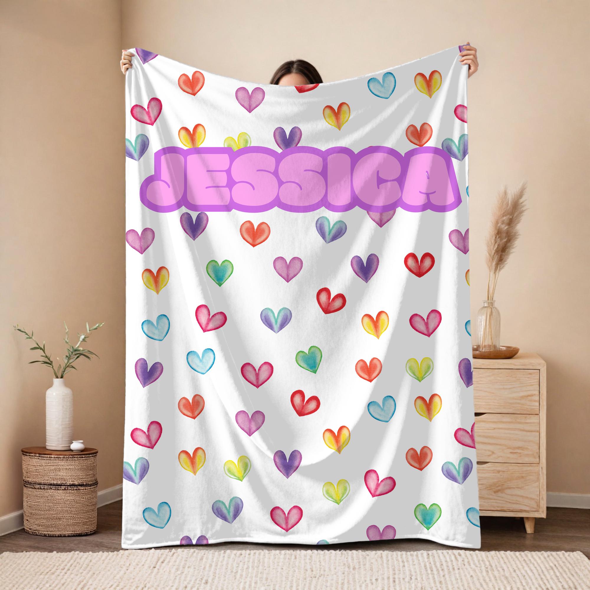 This bright and playful blanket features a field of rainbow watercolor hearts on a clean white background with a bold custom name across the top in vibrant pink and purple. It’s the perfect combination of cozy comfort and colorful style — ideal for bedroom decor, slumber parties, birthday gifts, or just cuddling up with a good book or show.