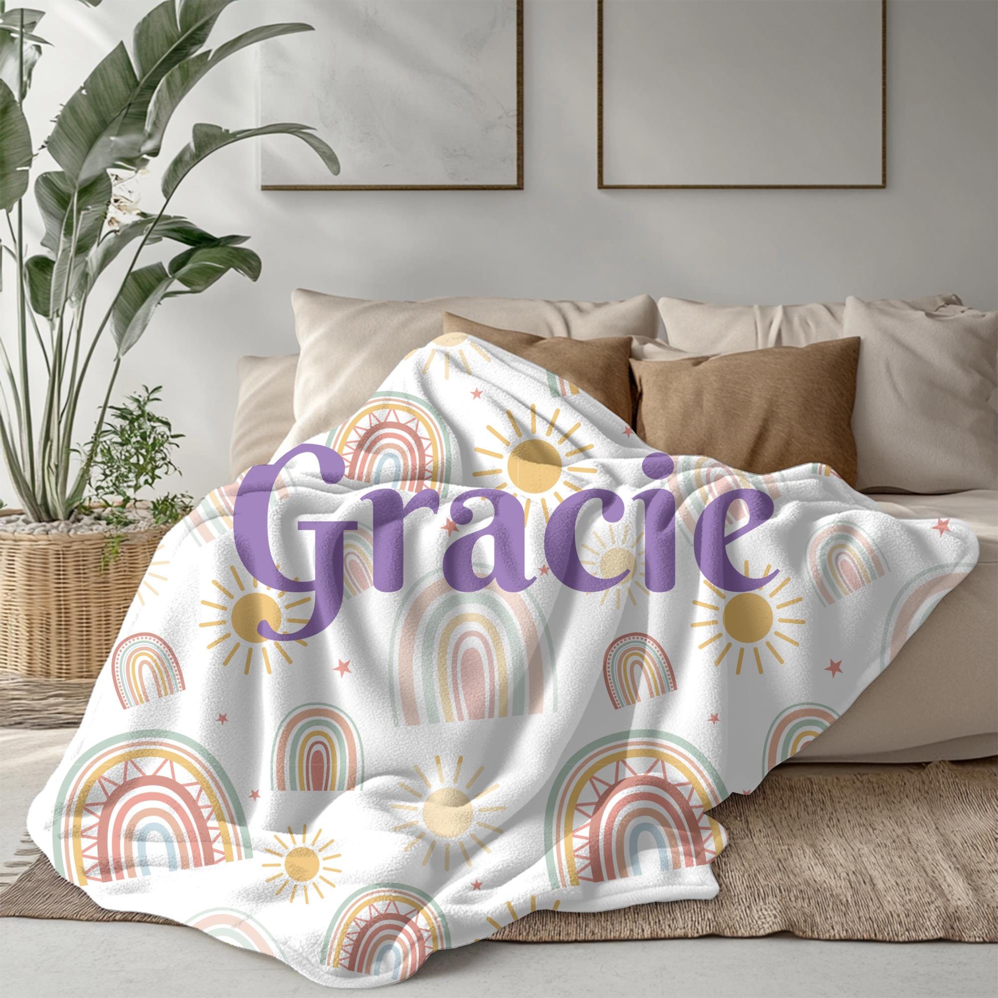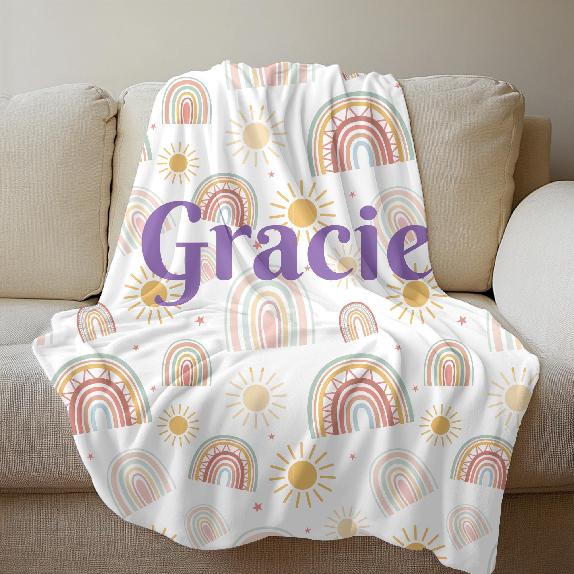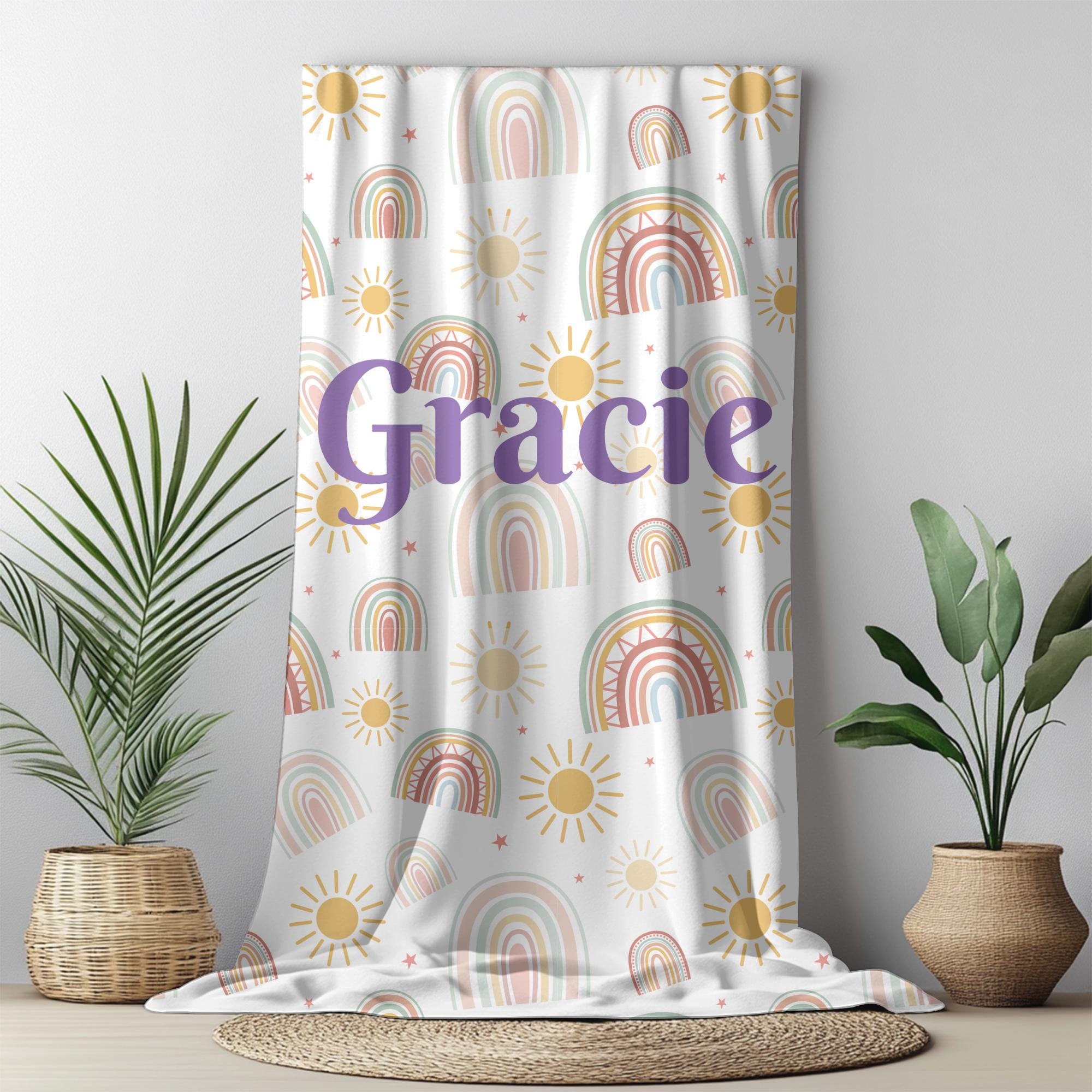 Wrap your little one in cozy boho charm with this custom name boho rainbow blanket, perfect for baby girls, baby boys, or gender‑neutral nurseries. Featuring a soft pastel rainbow, subtle earth tones, and your child’s name printed in elegant script, this throw makes a standout gift and keepsake.