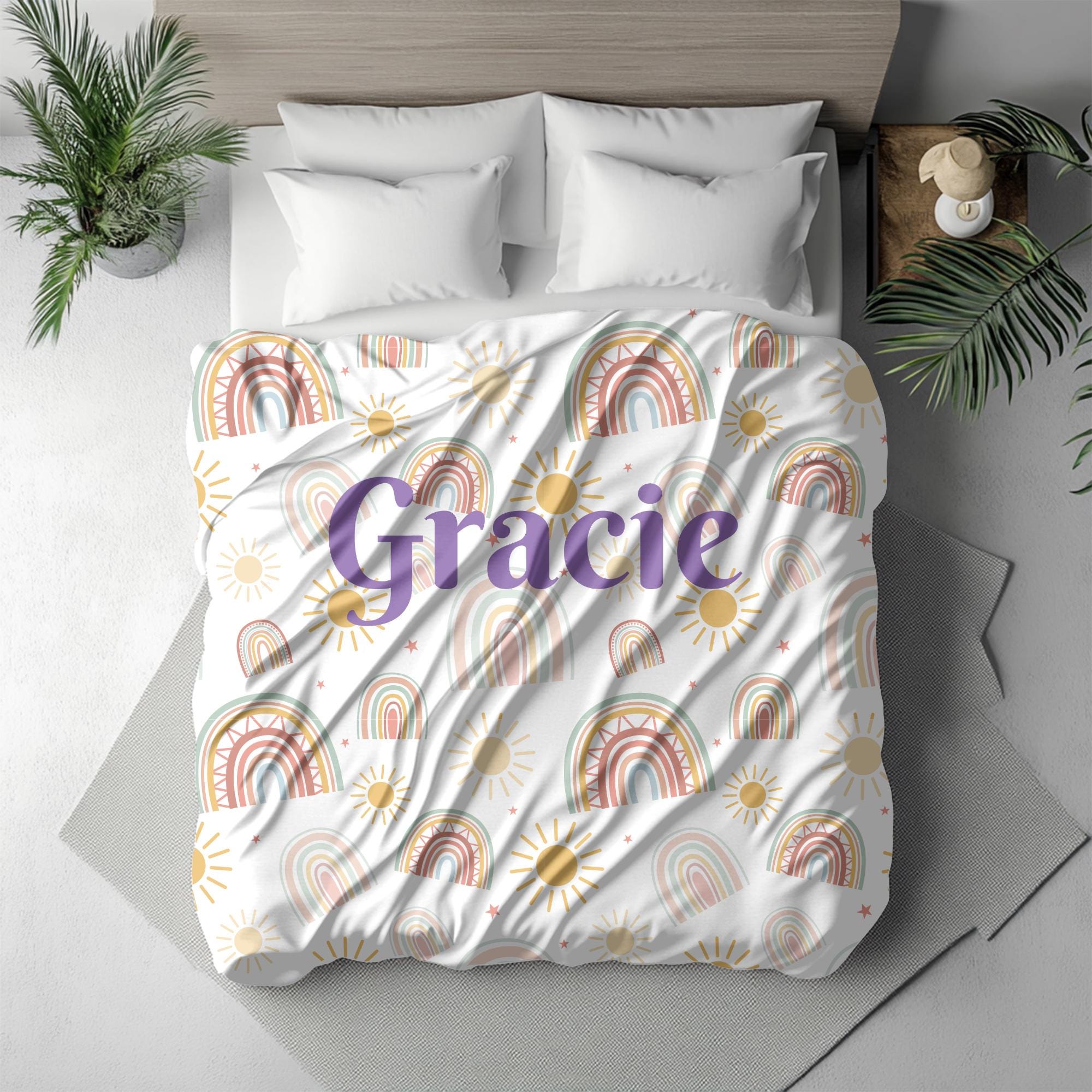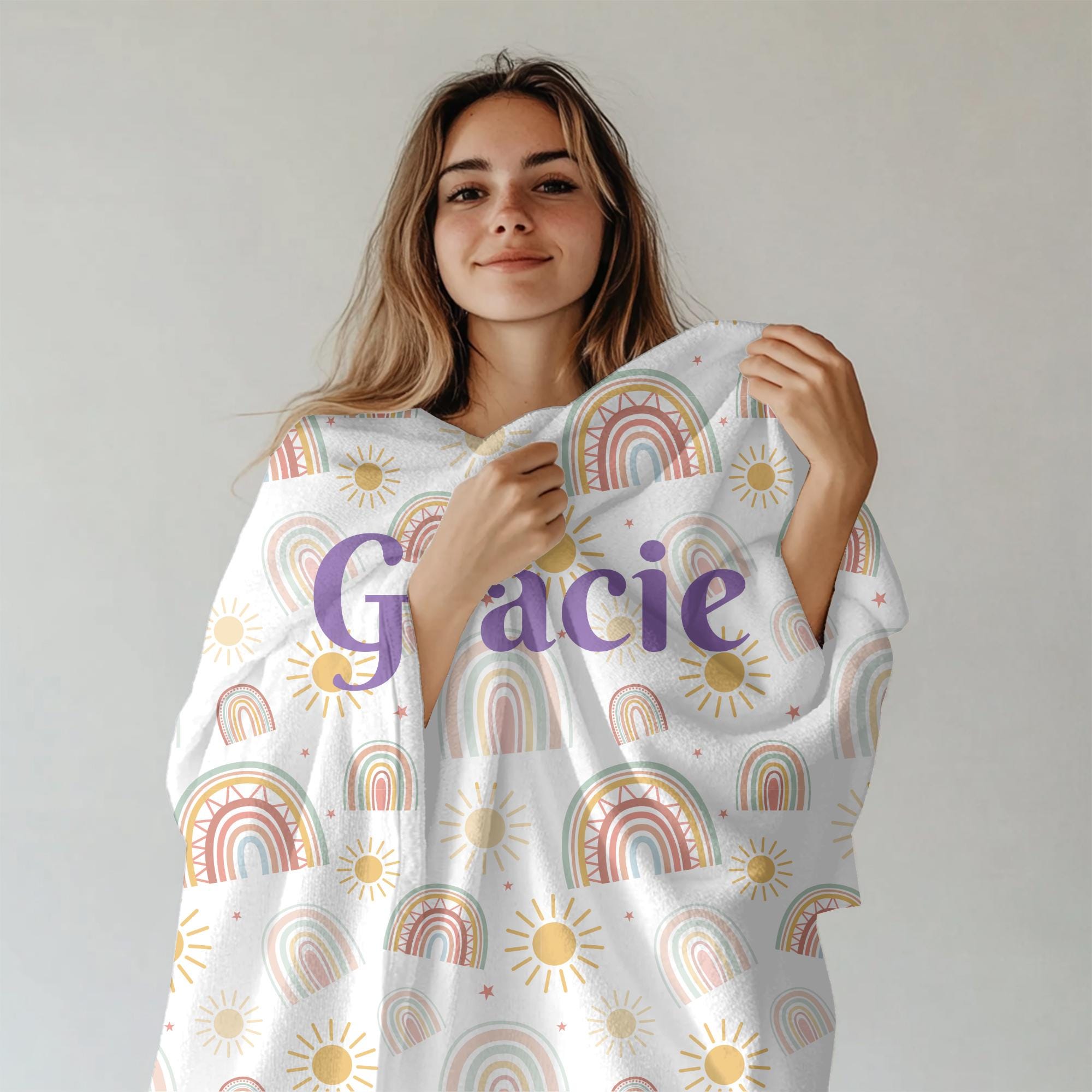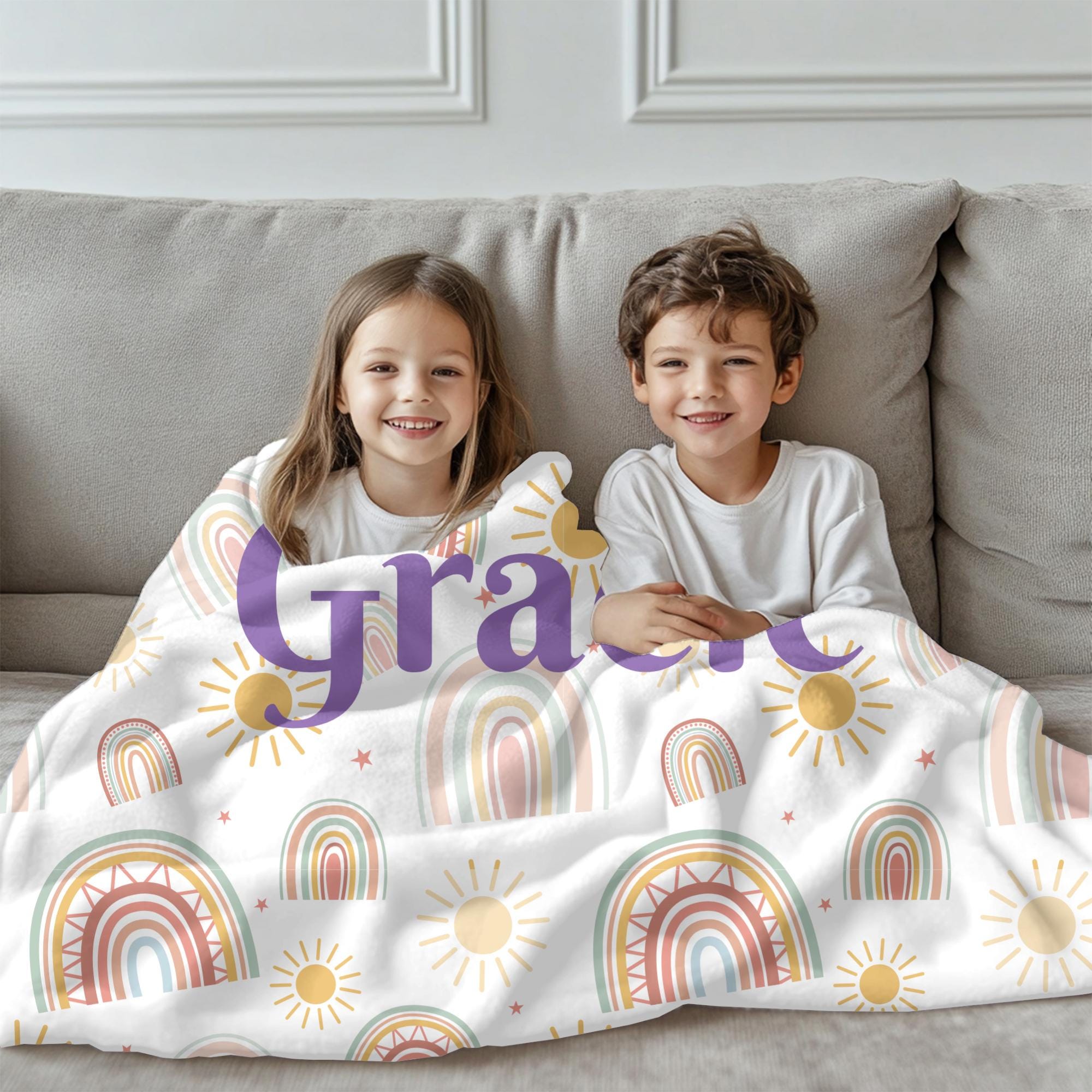 Wrap your little one in cozy boho charm with this custom name boho rainbow blanket, perfect for baby girls, baby boys, or gender‑neutral nurseries. Featuring a soft pastel rainbow, subtle earth tones, and your child’s name printed in elegant script, this throw makes a standout gift and keepsake.
