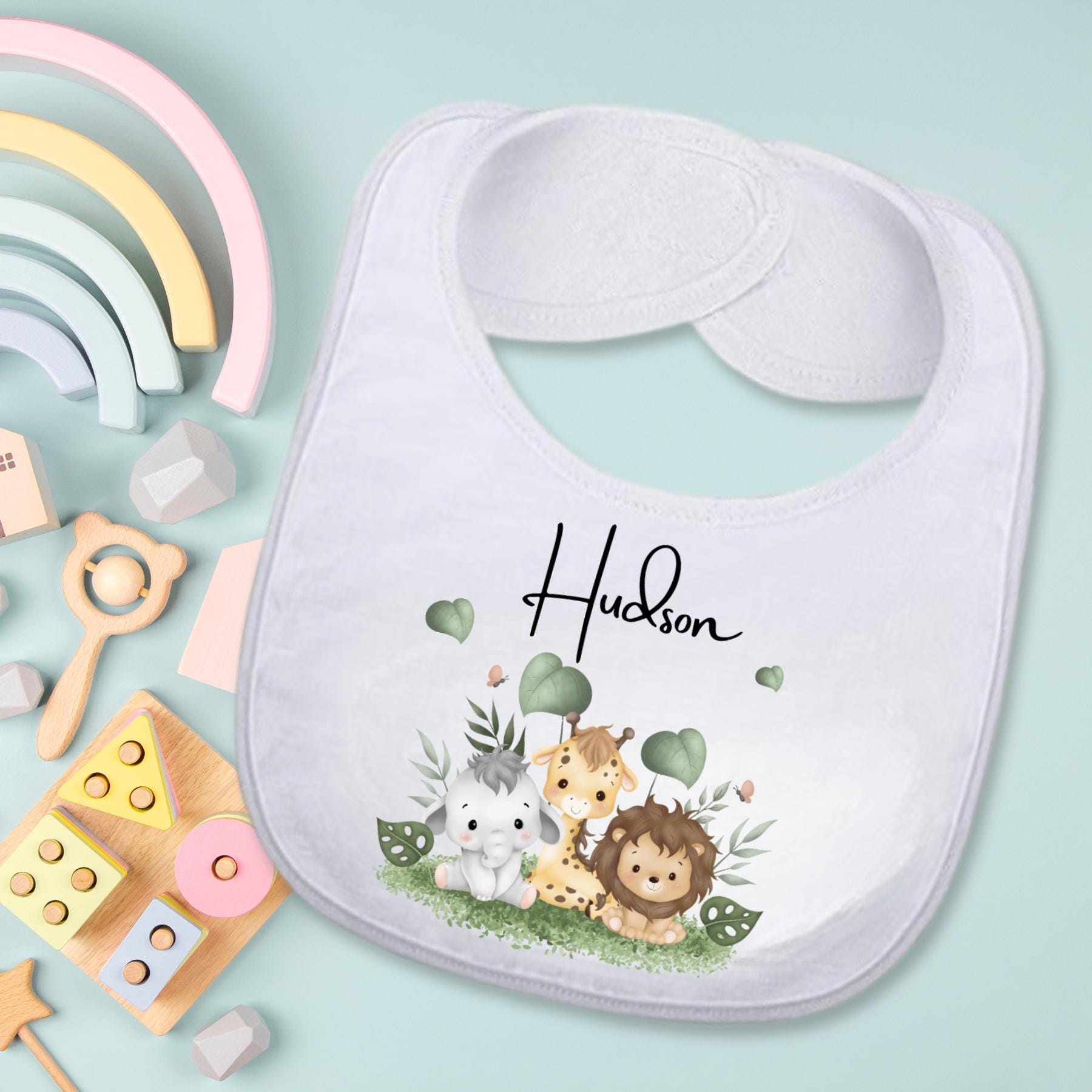 Create a one-of-a-kind baby shower or first birthday gift with this personalized jungle baby bib and sippy cup set. This adorable duo features a safari-inspired design with a baby elephant, giraffe, and lion—making it a perfect jungle baby gift for boys or girls.