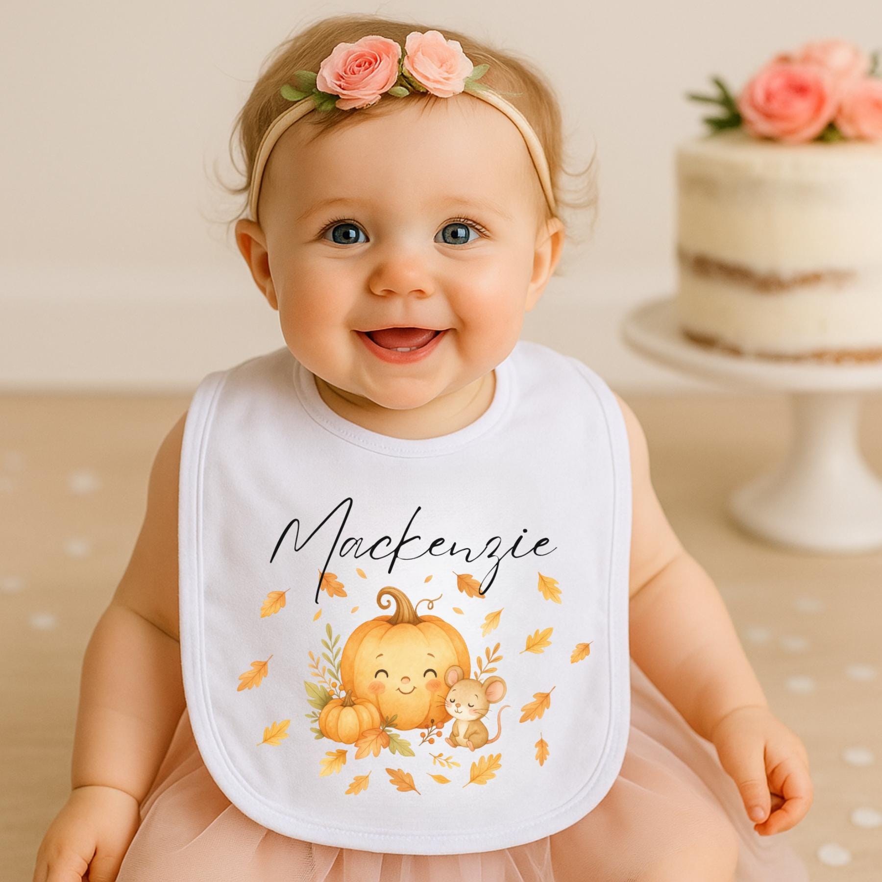 Celebrate your little one's first fall in style with this cozy and cute pumpkin-themed bib! Featuring a cheerful pumpkin and sweet mouse surrounded by autumn leaves, this personalized bib makes the perfect seasonal accessory for baby’s first Thanksgiving, fall birthdays, or pumpkin patch photoshoots.