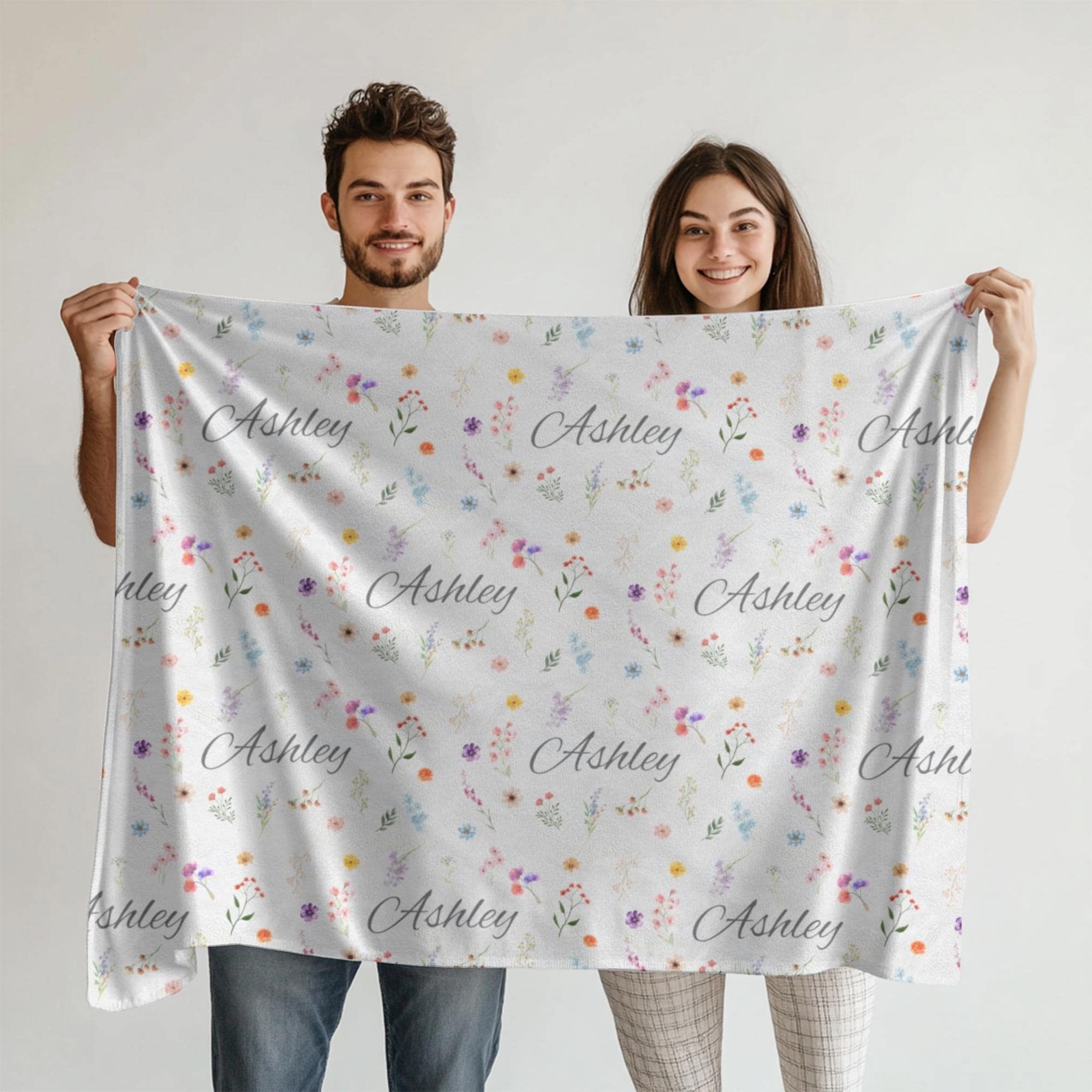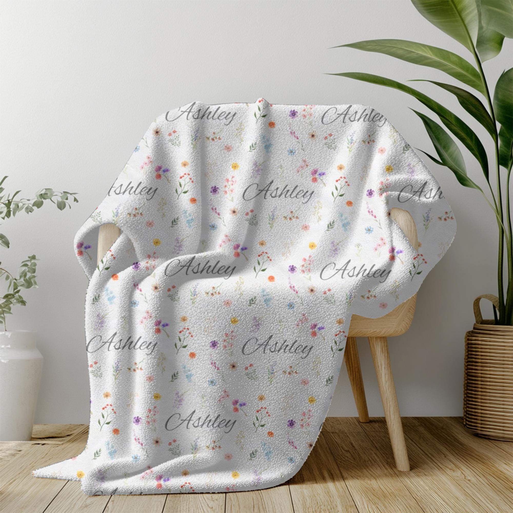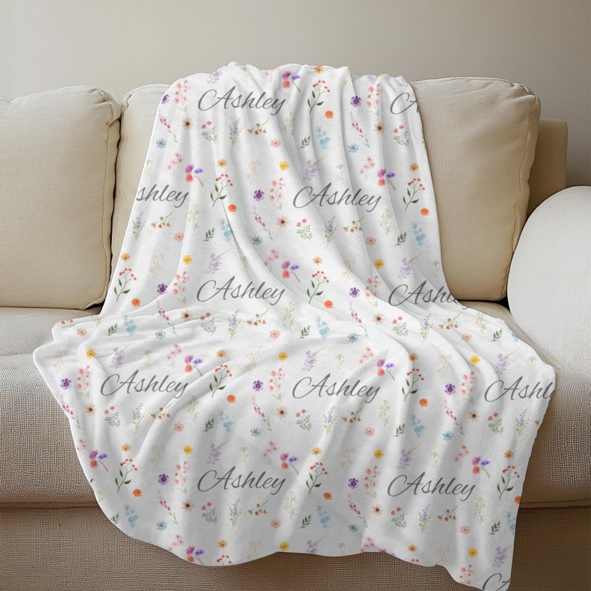 Wrap yourself or a loved one in comfort and beauty with this personalized name blanket featuring delicate watercolor flowers. Your chosen name is repeated in a soft, elegant script across the entire surface, surrounded by a botanical blend of hand-painted floral illustrations. It’s a cozy, custom-made keepsake that feels as thoughtful as it looks.