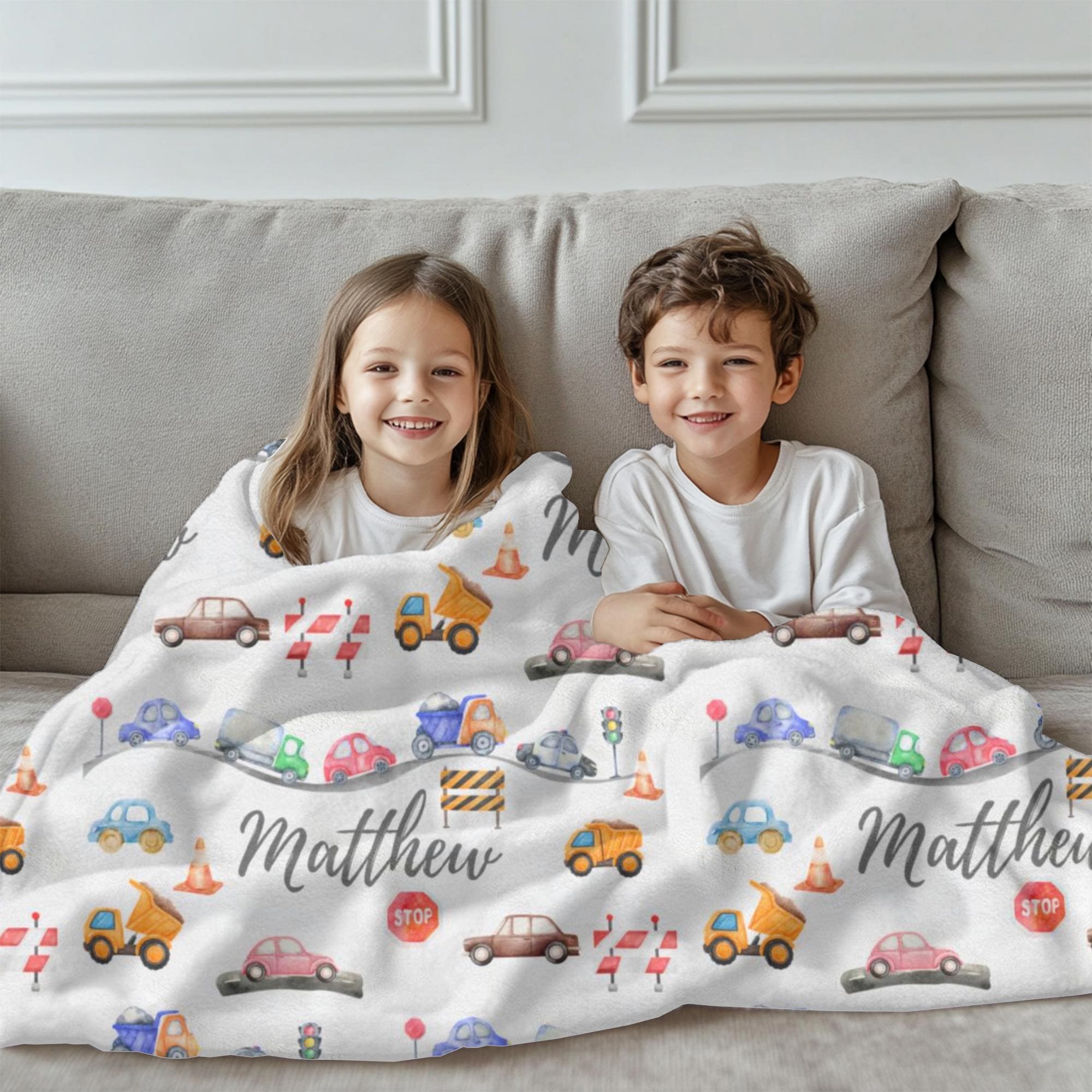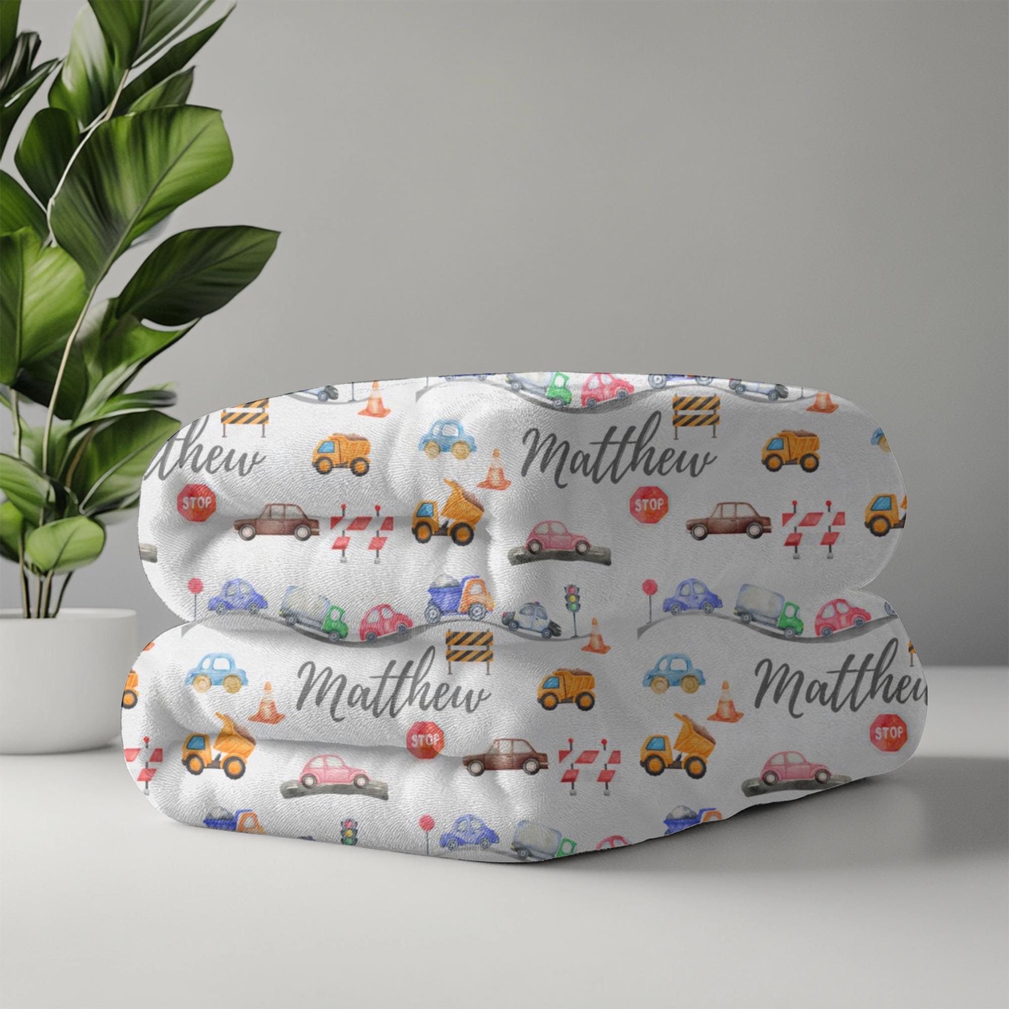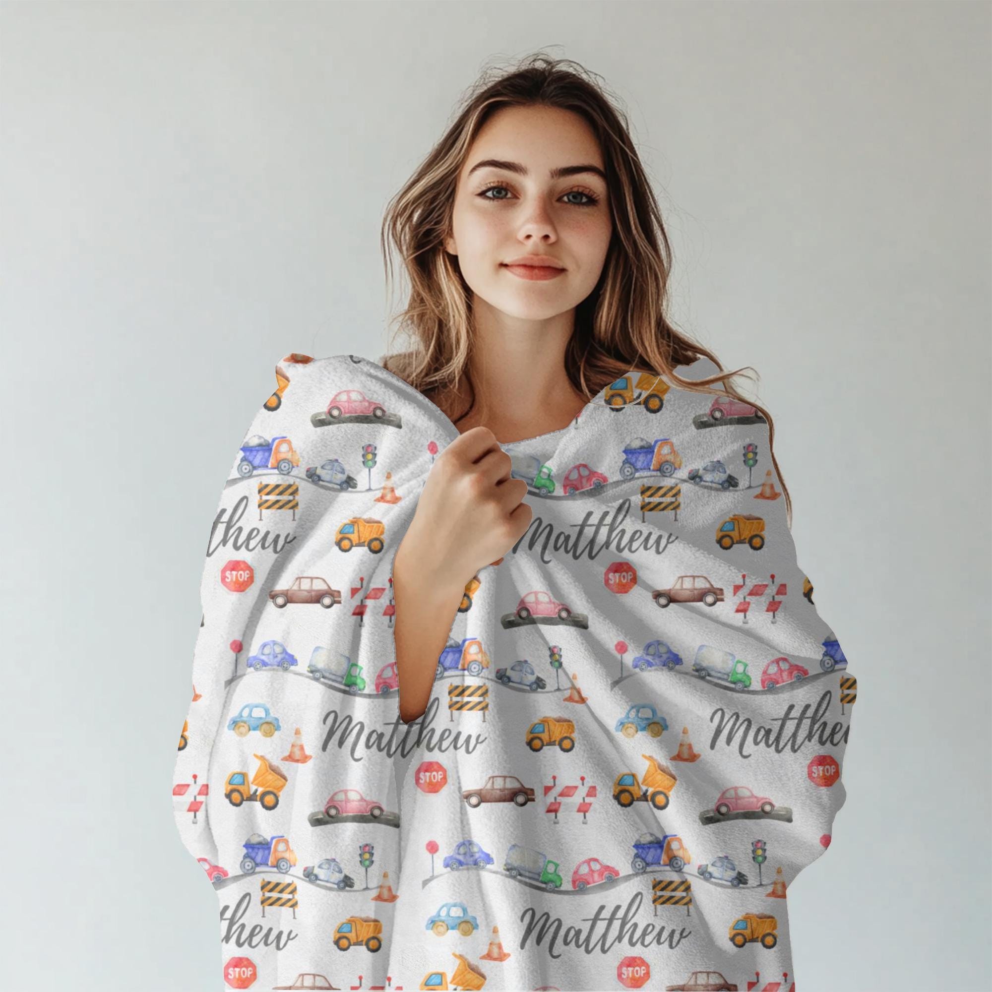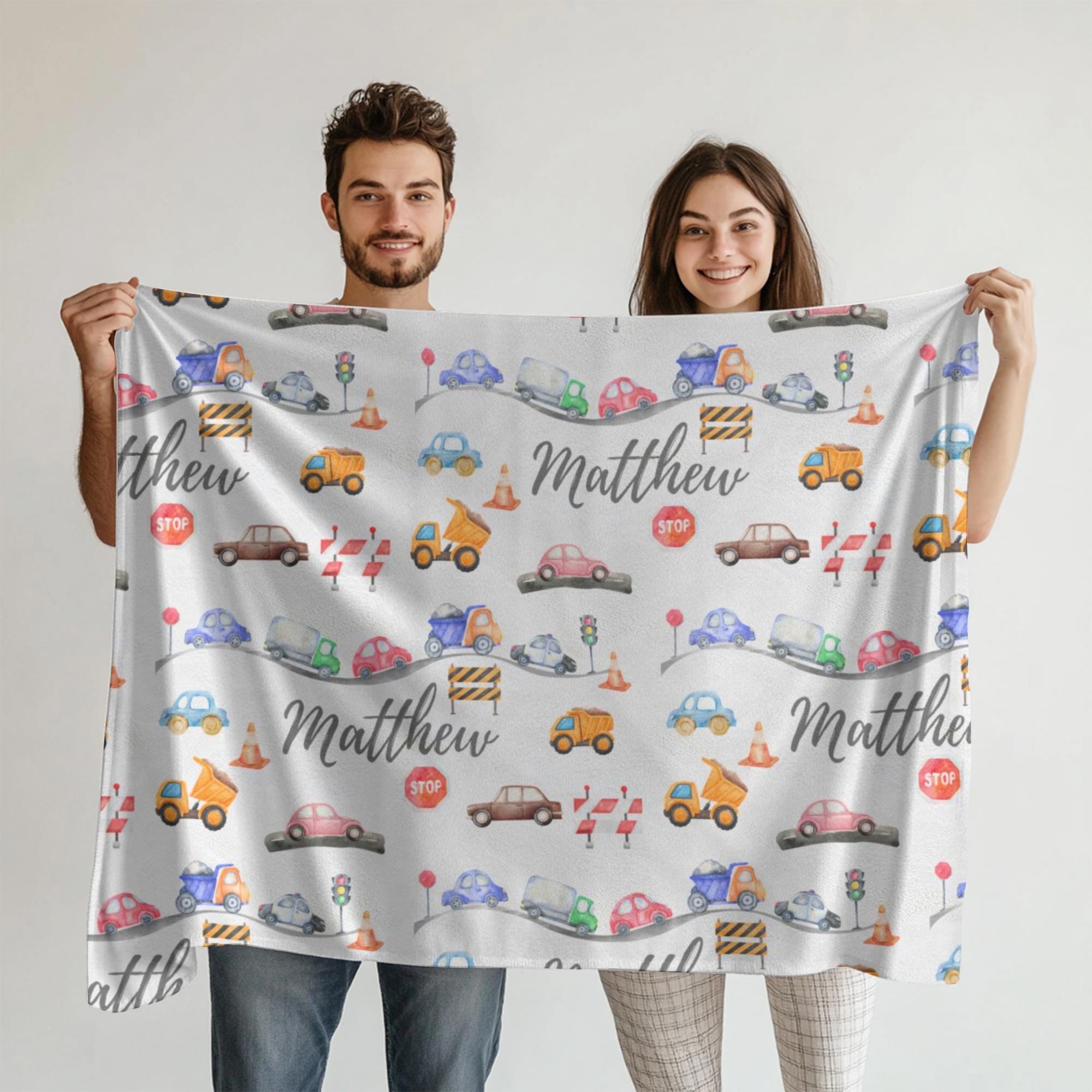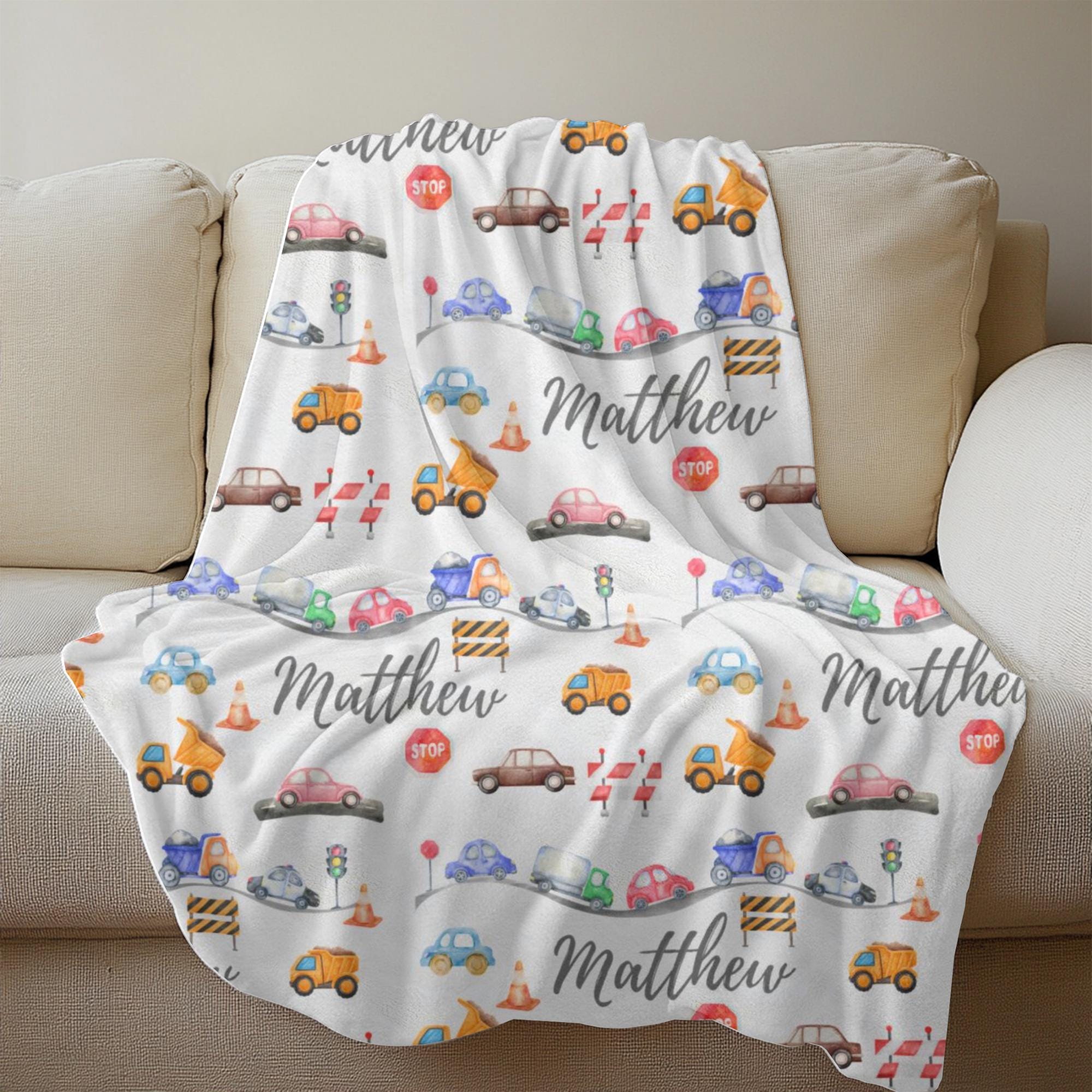 Delight your little one with this personalized name blanket featuring colorful cars, trucks, and construction vehicles, perfect for toddlers, preschoolers, and vehicle-loving kids. With your child’s name printed in a fun repeating pattern, this cozy blanket adds a personal touch to nap time, travel, or their bedroom decor.
