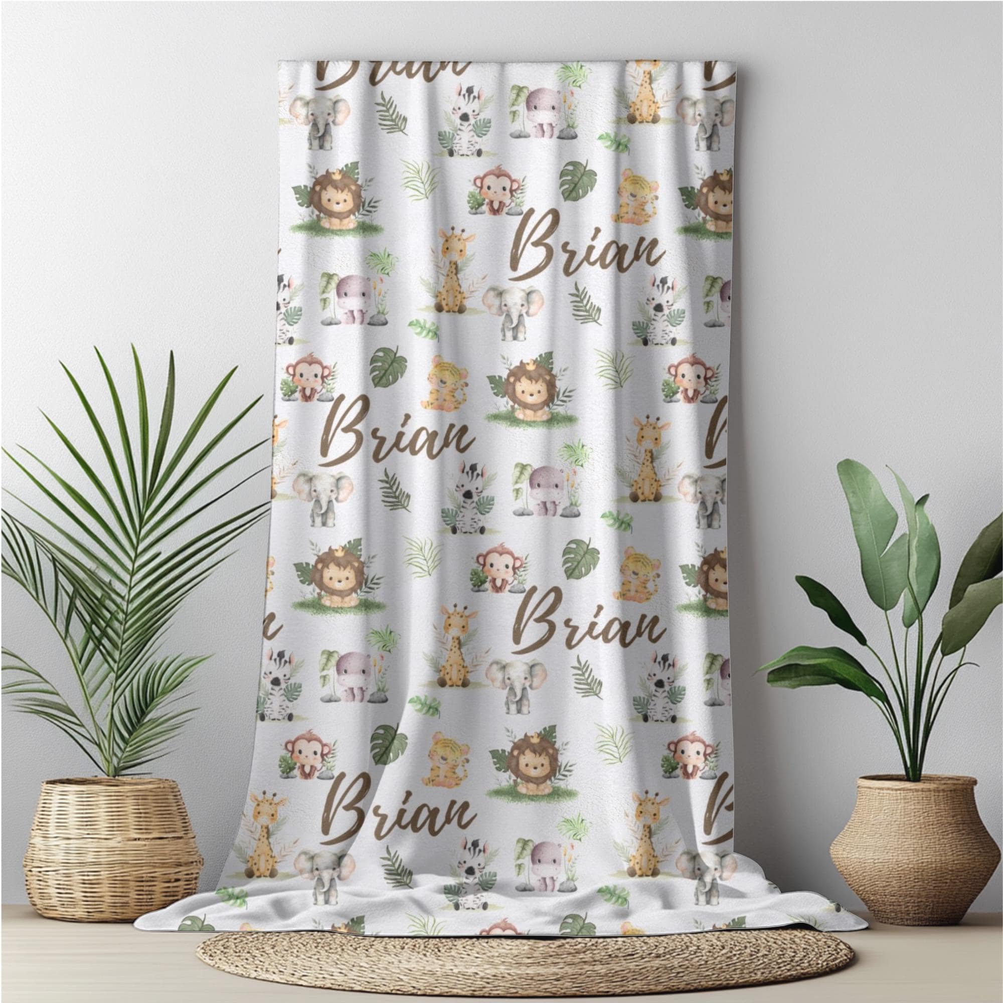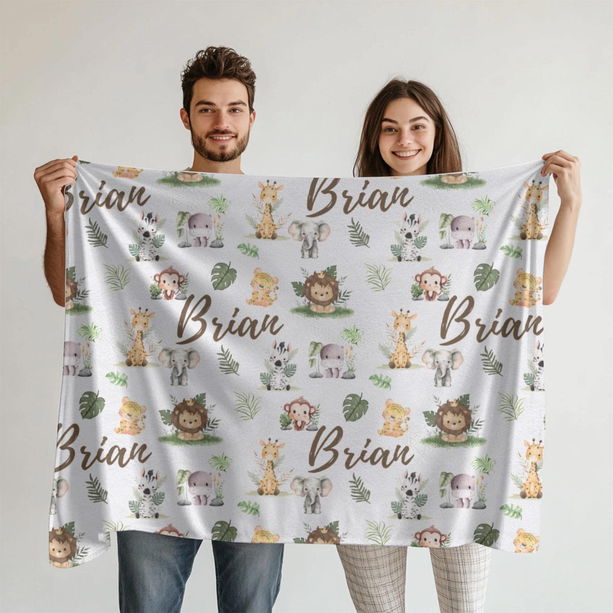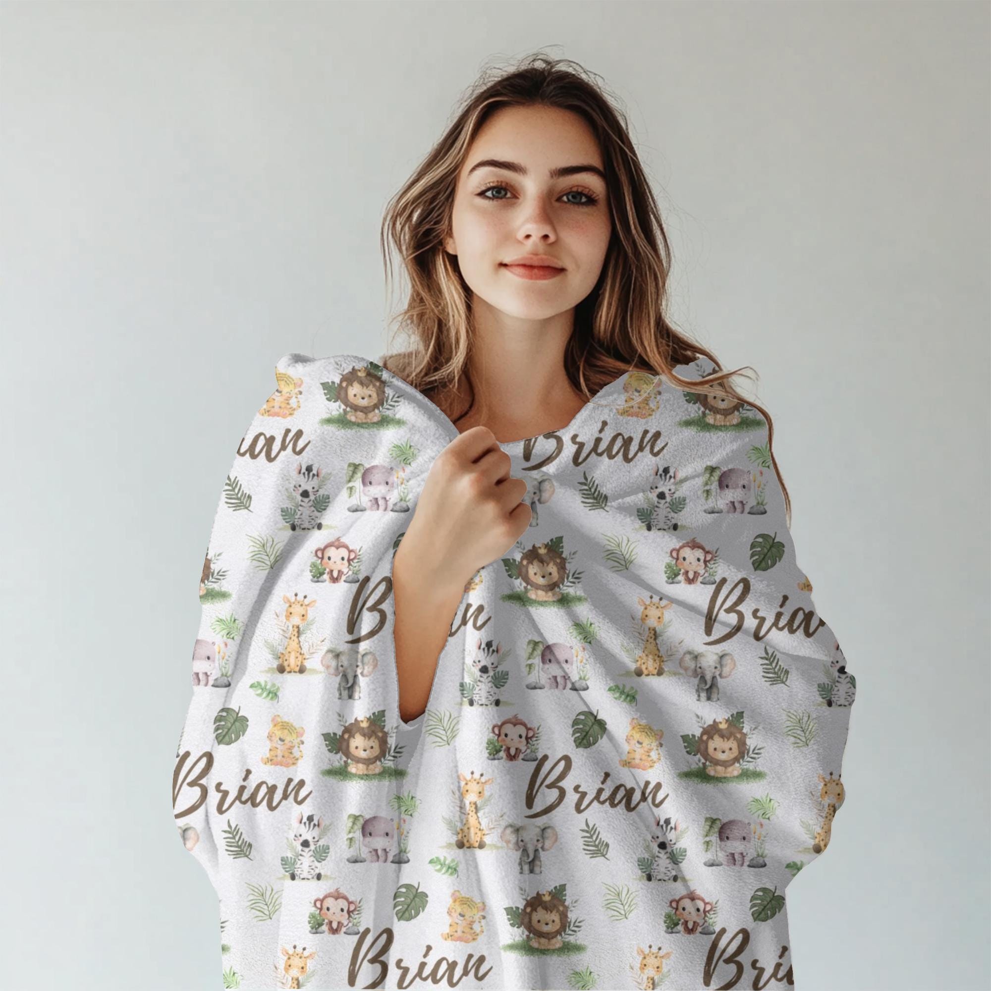Welcome your little one in the wildest (and cutest) way with this personalized safari animal name blanket. Featuring a repeating custom name surrounded by watercolor jungle animals, including a lion, elephant, giraffe, hippo, monkey, and leafy greenery, this ultra-soft velveteen plush blanket is perfect for snuggles, nursery decor, or gifting.