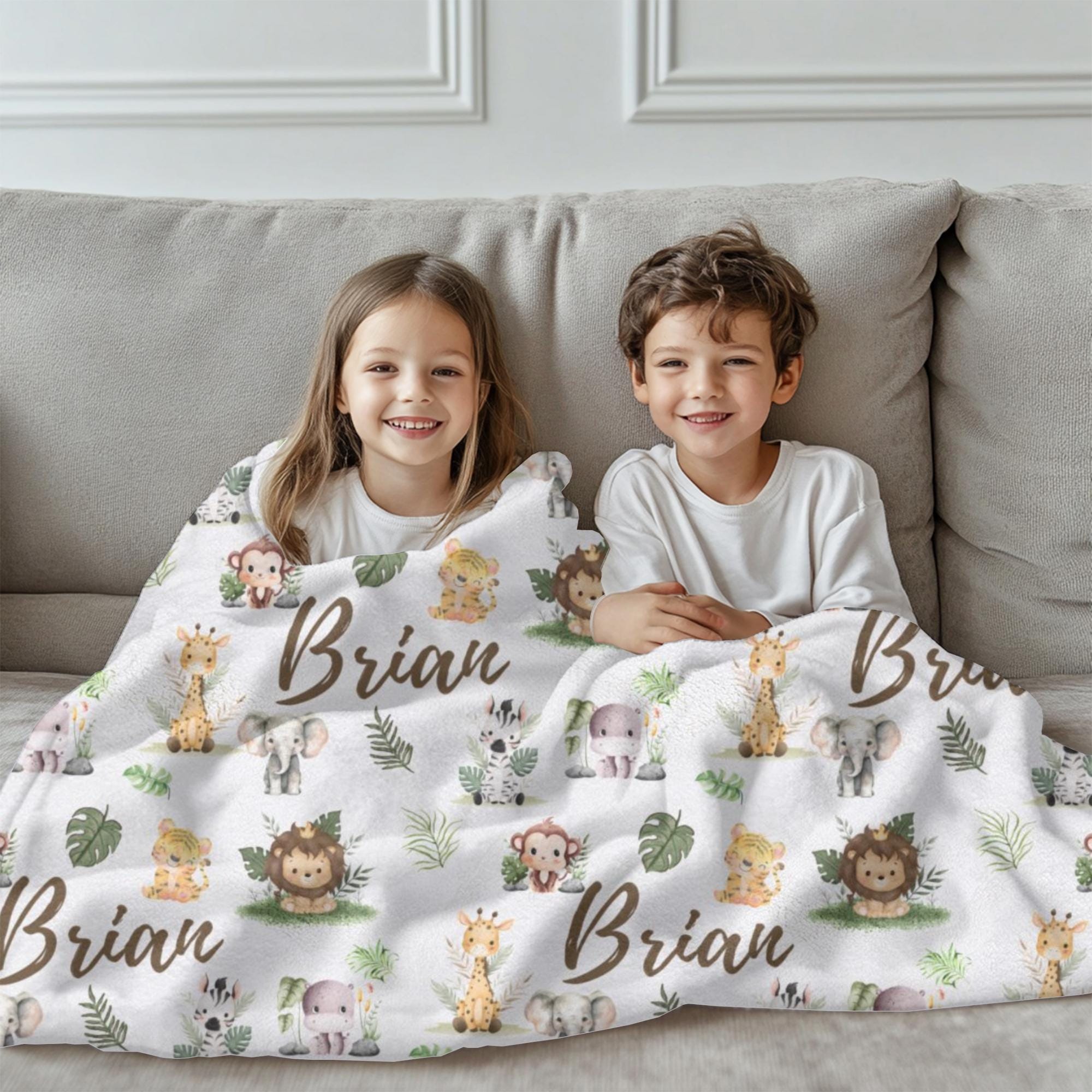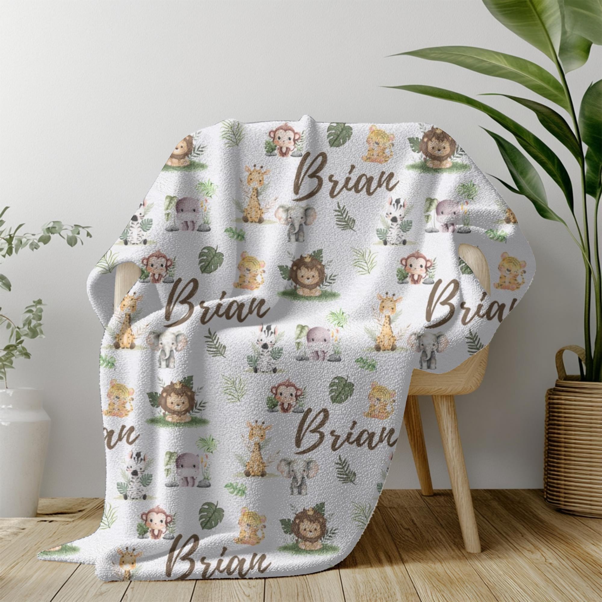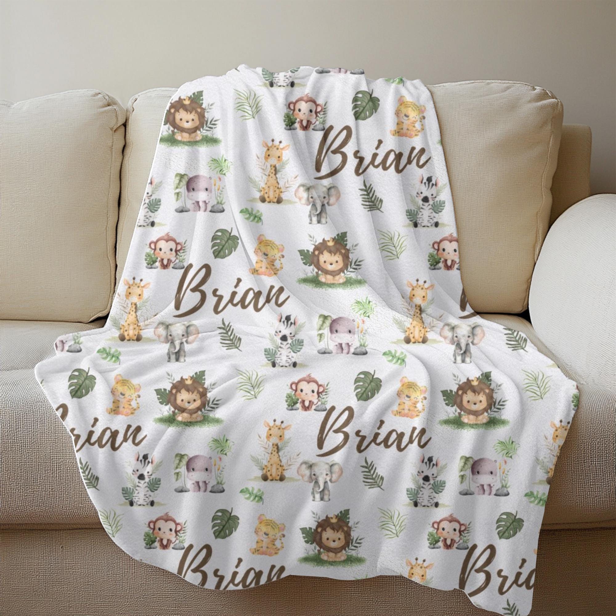 Welcome your little one in the wildest (and cutest) way with this personalized safari animal name blanket. Featuring a repeating custom name surrounded by watercolor jungle animals, including a lion, elephant, giraffe, hippo, monkey, and leafy greenery, this ultra-soft velveteen plush blanket is perfect for snuggles, nursery decor, or gifting.