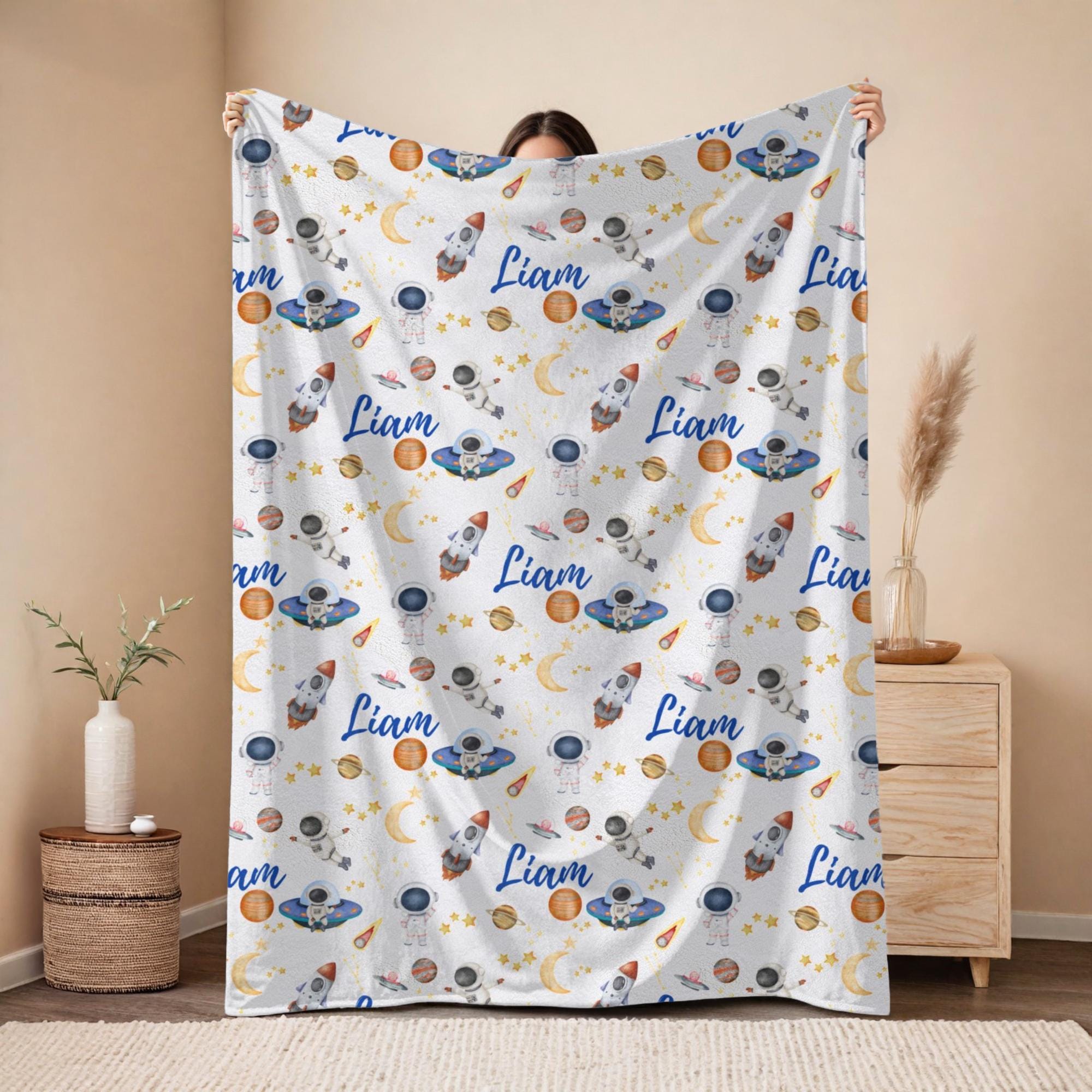 The repeating name layout makes it a thoughtful keepsake while also functioning as a snuggly everyday essential. Great for strollers, daycare, reading corners, or bedroom throws. A stellar gift idea for future astronauts, space-loving kids, and galaxy-themed birthdays.