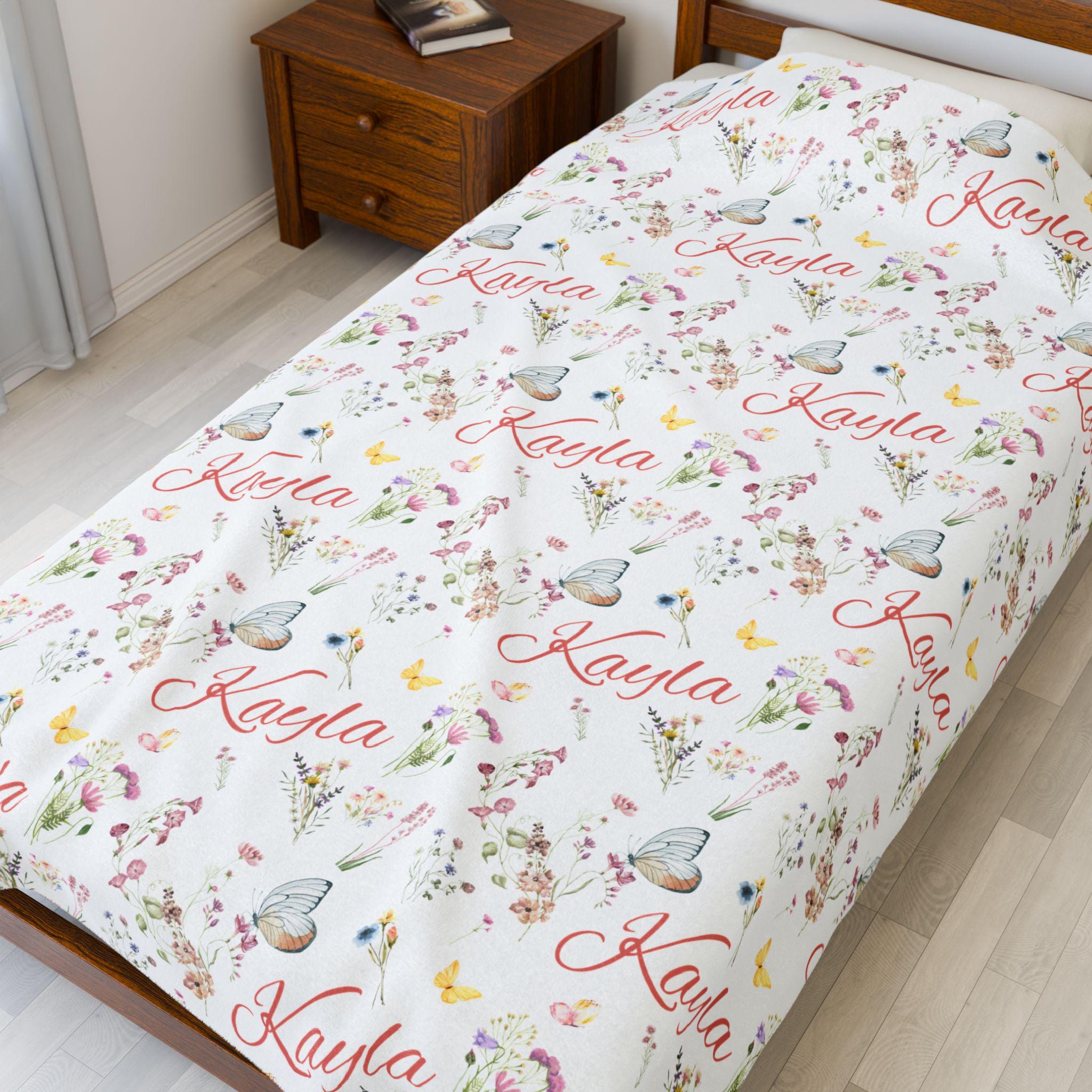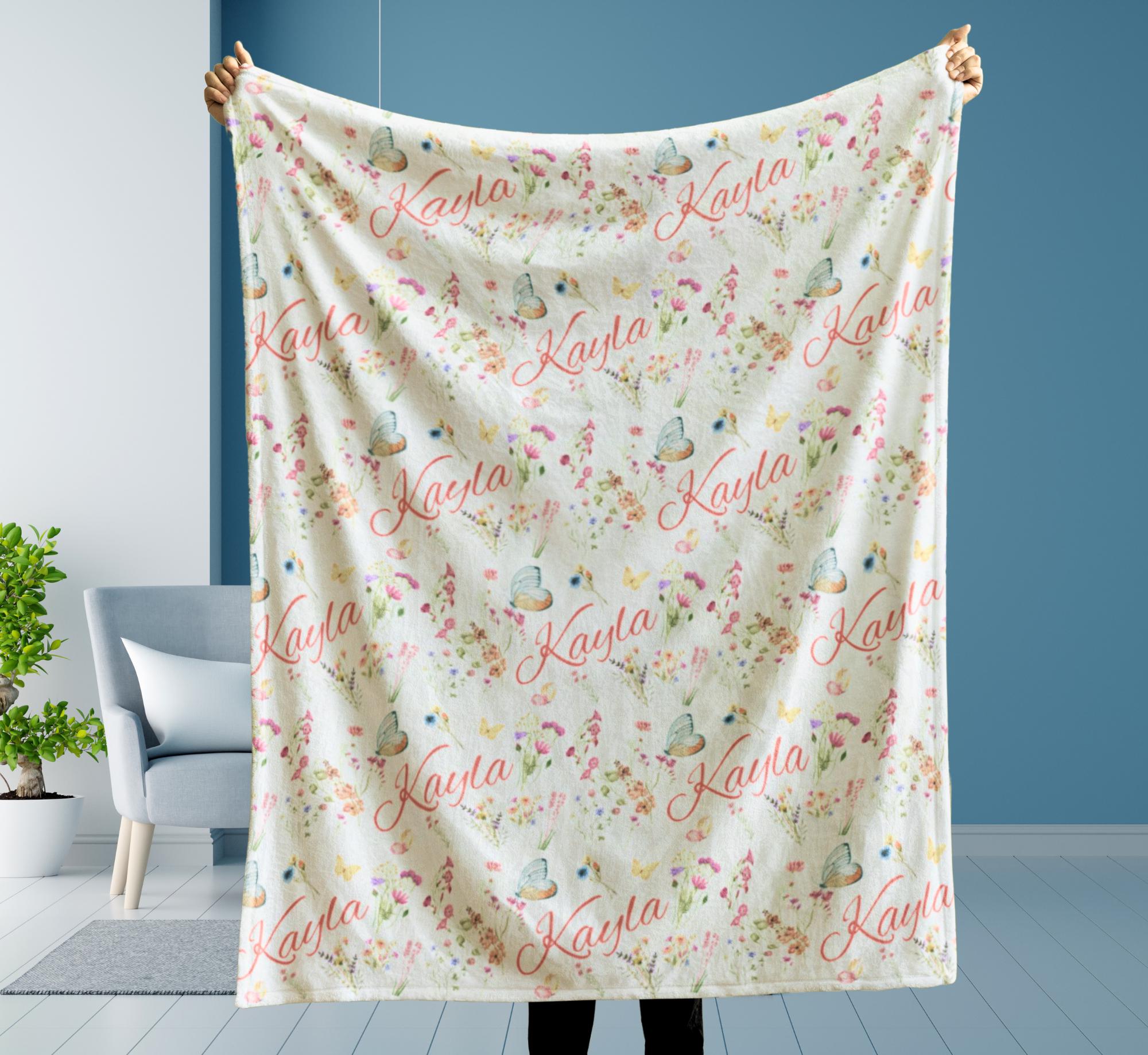 Wrap your little one in charm with this personalized name blanket featuring butterflies, soft florals, and pastel colors. Custom-designed with your child’s name repeated across a watercolor-inspired pattern, this plush minky blanket is perfect for baby girls, toddlers, and sweet nursery spaces.