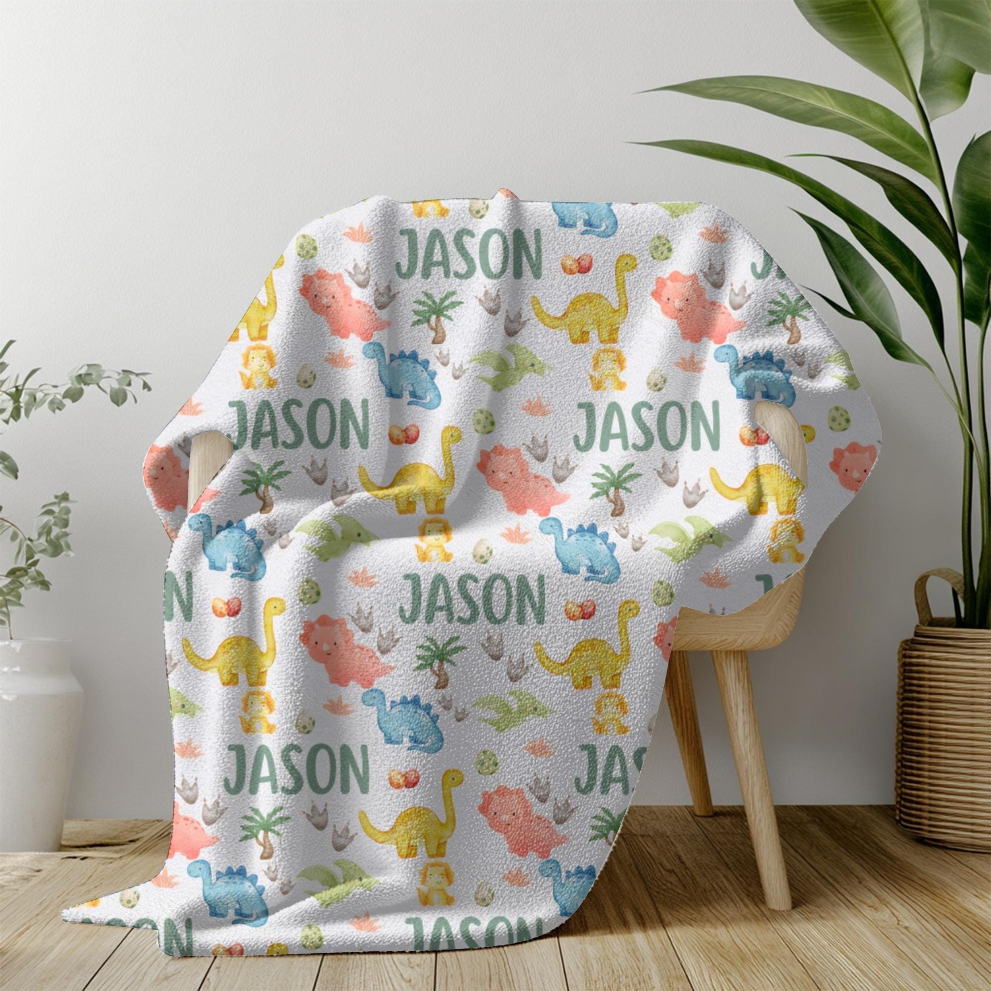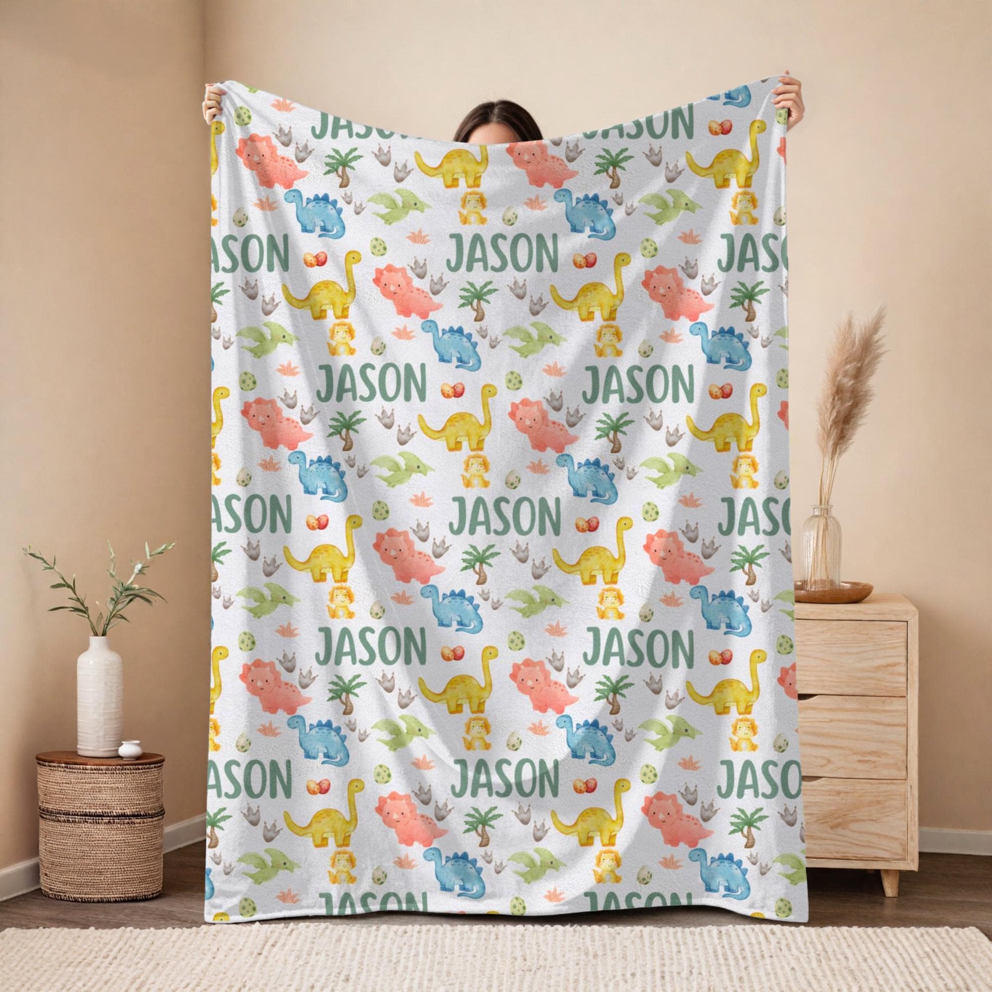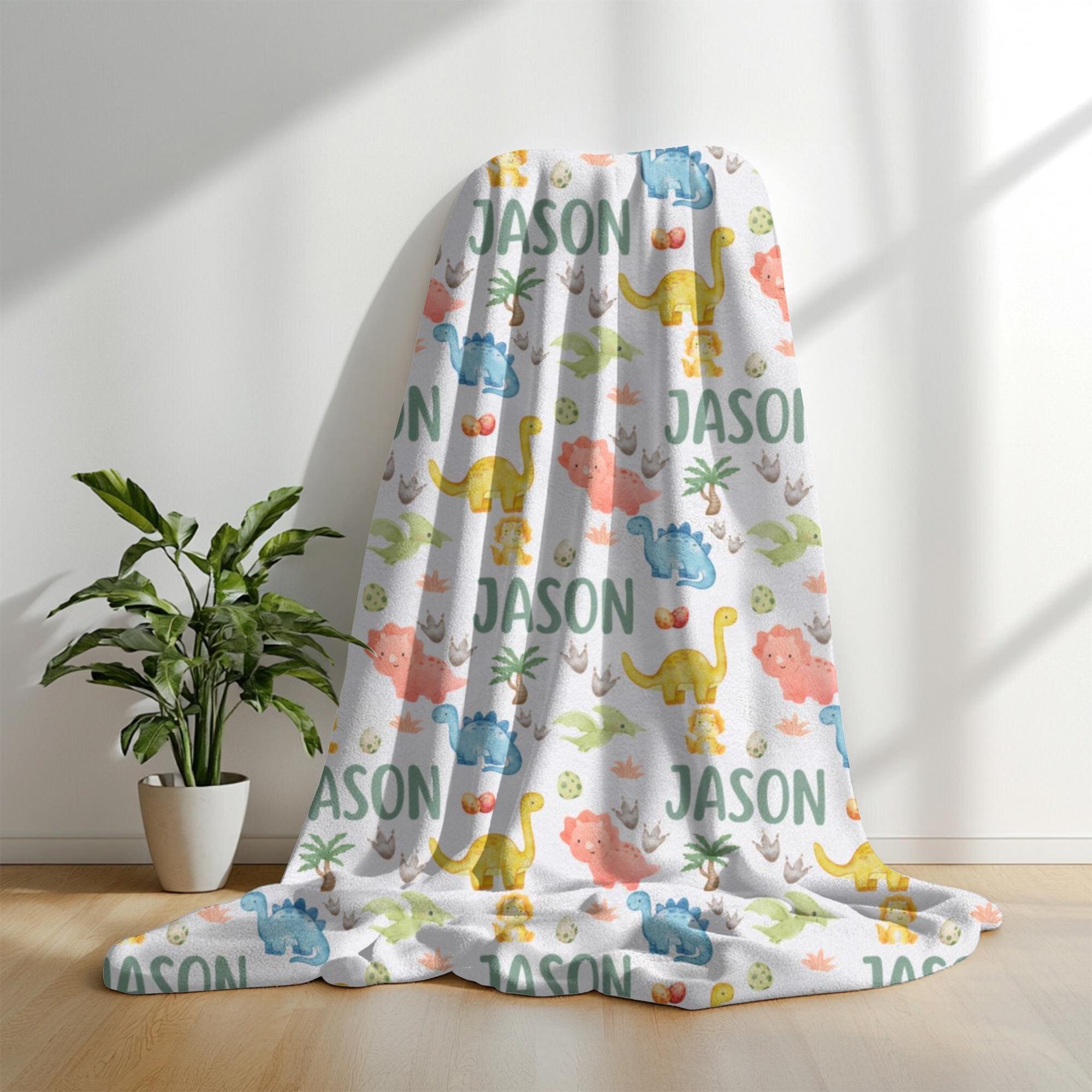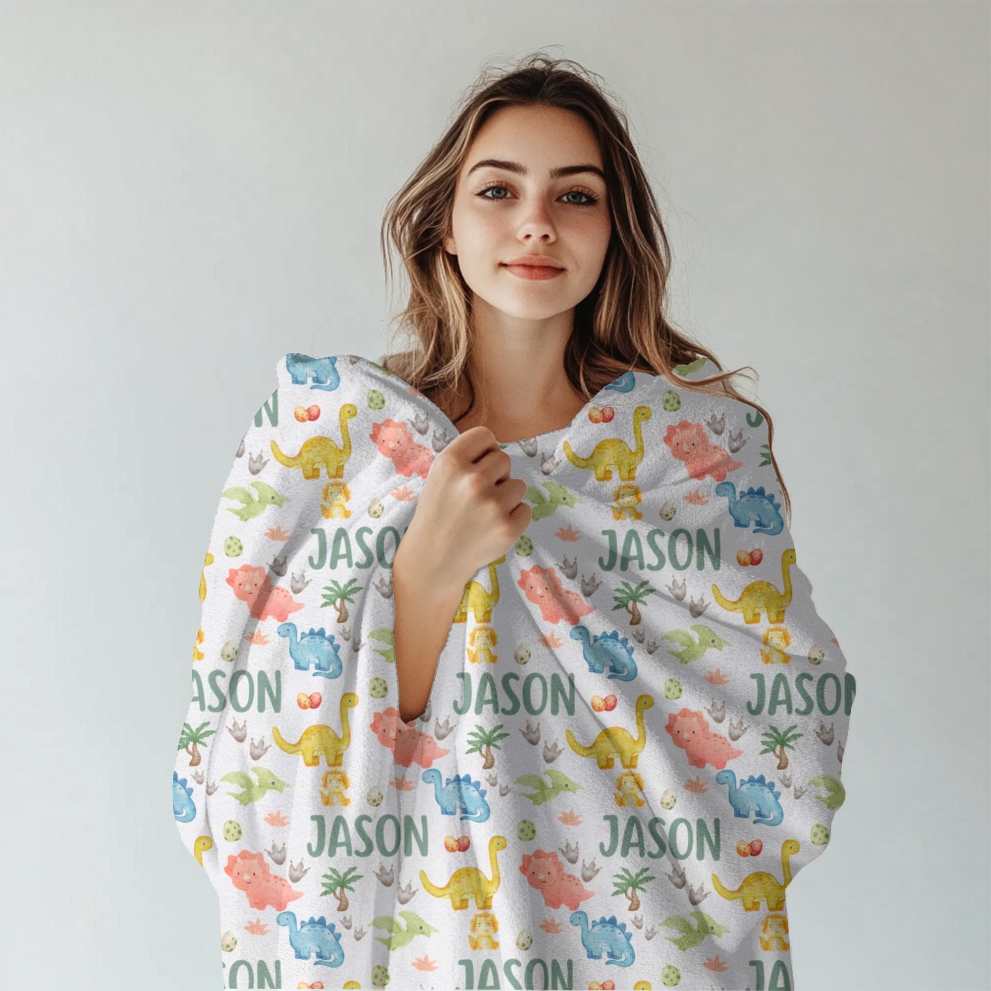 Snuggle up with prehistoric charm! This personalized dinosaur blanket is the perfect gift for dino-loving little ones. Featuring a custom name in a playful repeating pattern alongside watercolor dinosaurs, dino eggs, and footprints, it's a cozy and fun keepsake for any nursery.