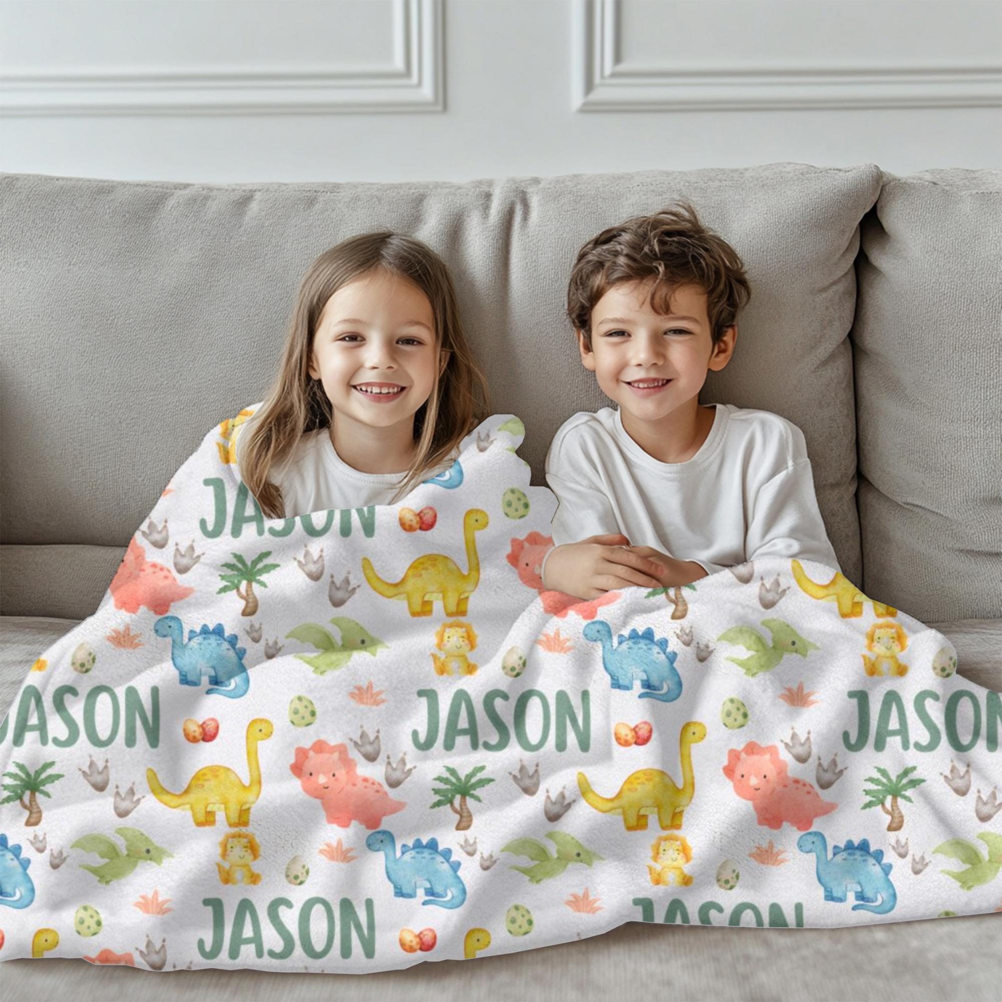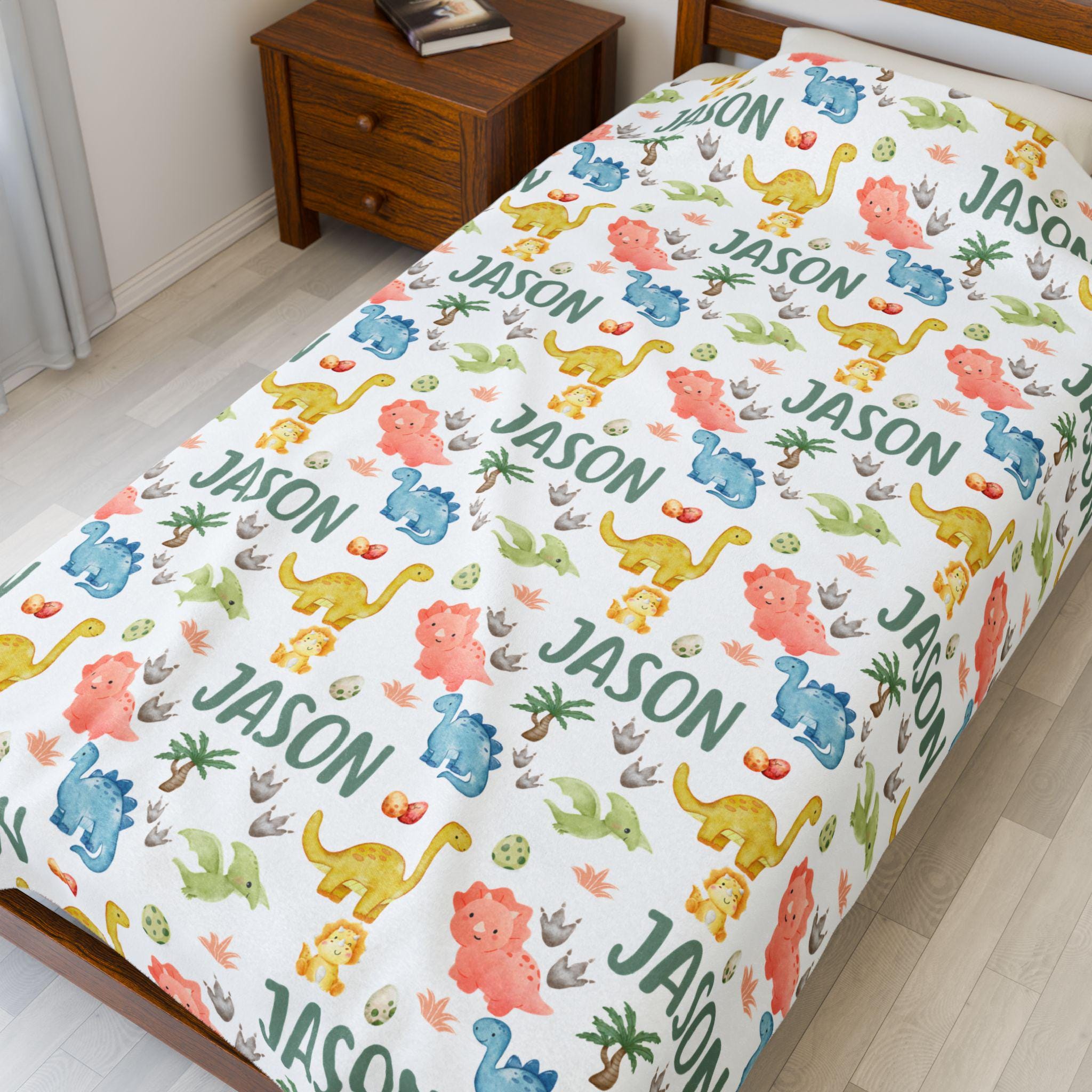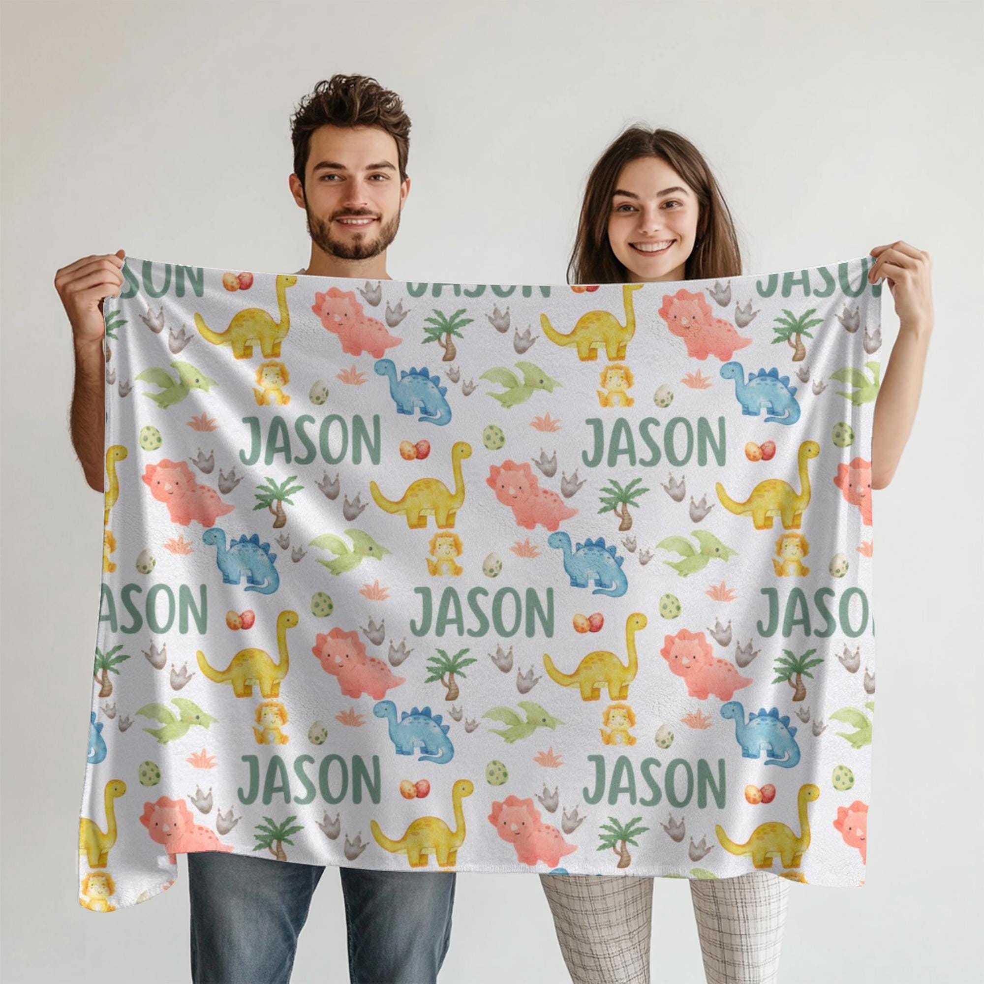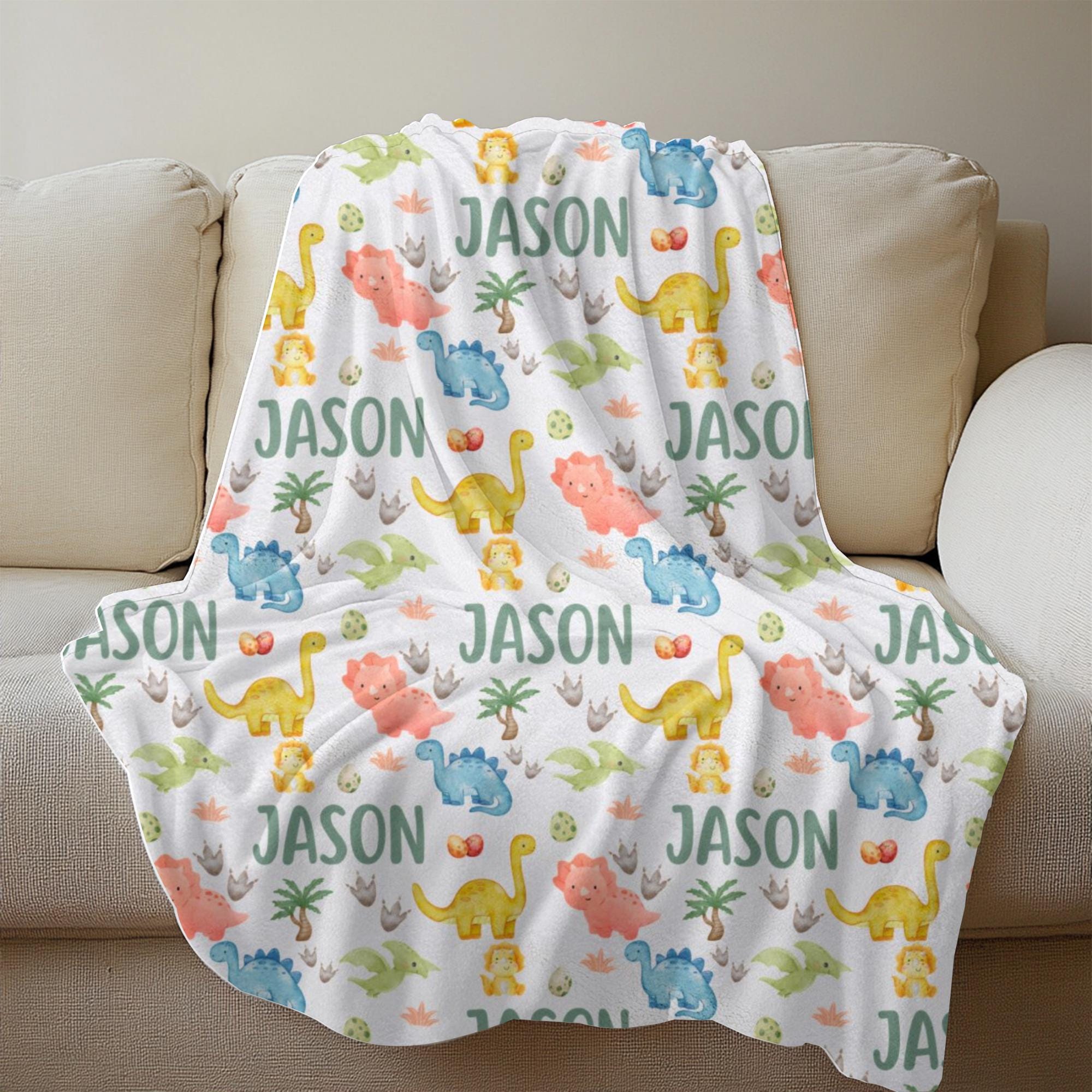 Snuggle up with prehistoric charm! This personalized dinosaur blanket is the perfect gift for dino-loving little ones. Featuring a custom name in a playful repeating pattern alongside watercolor dinosaurs, dino eggs, and footprints, it's a cozy and fun keepsake for any nursery.