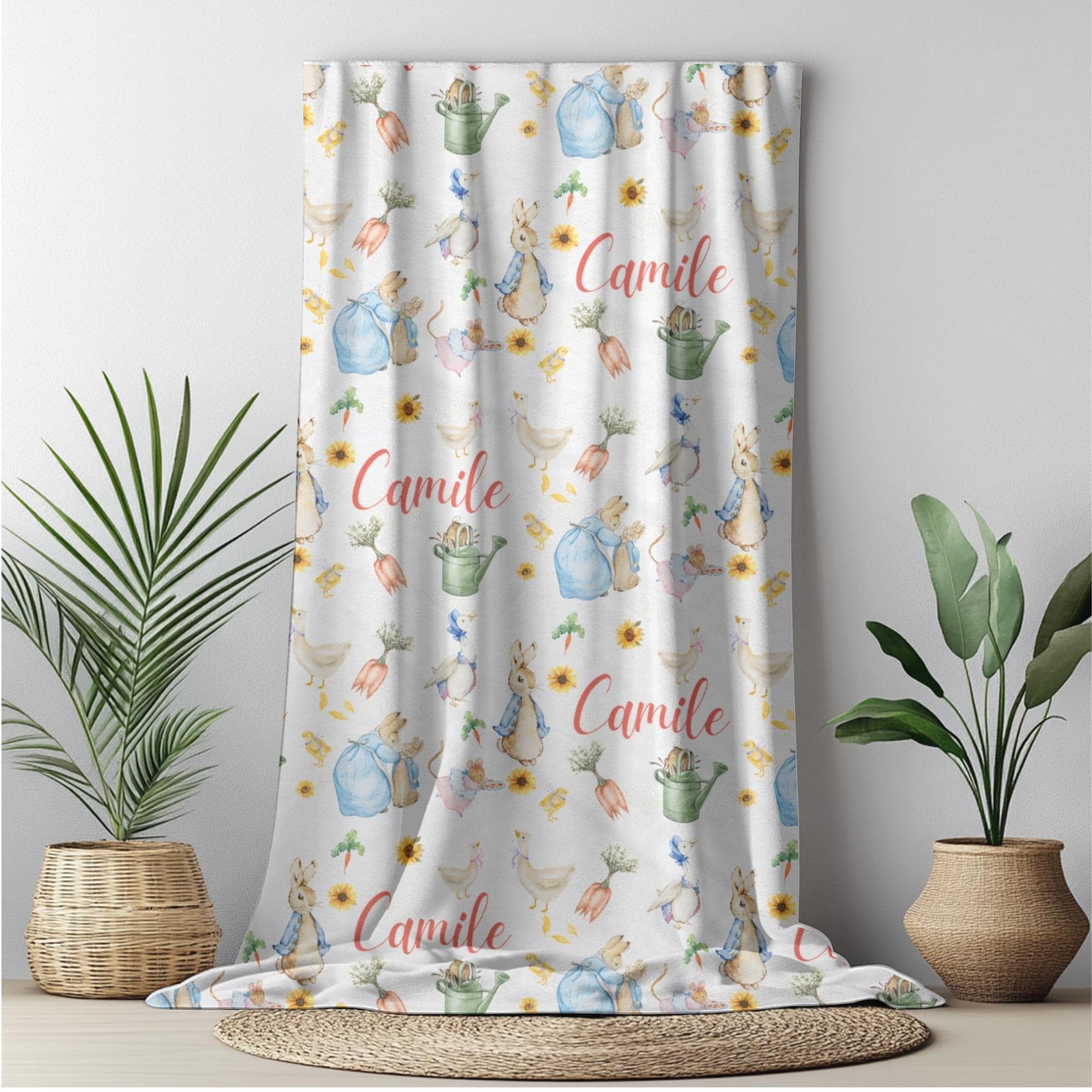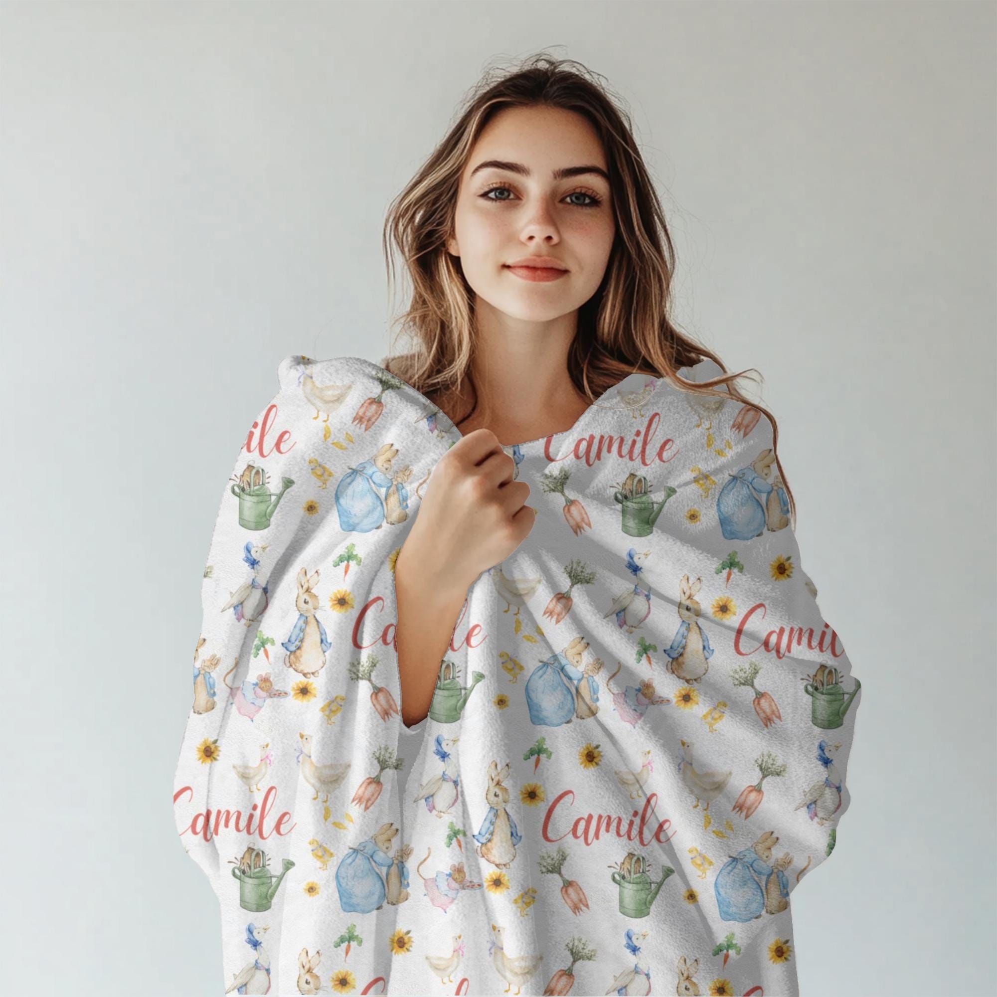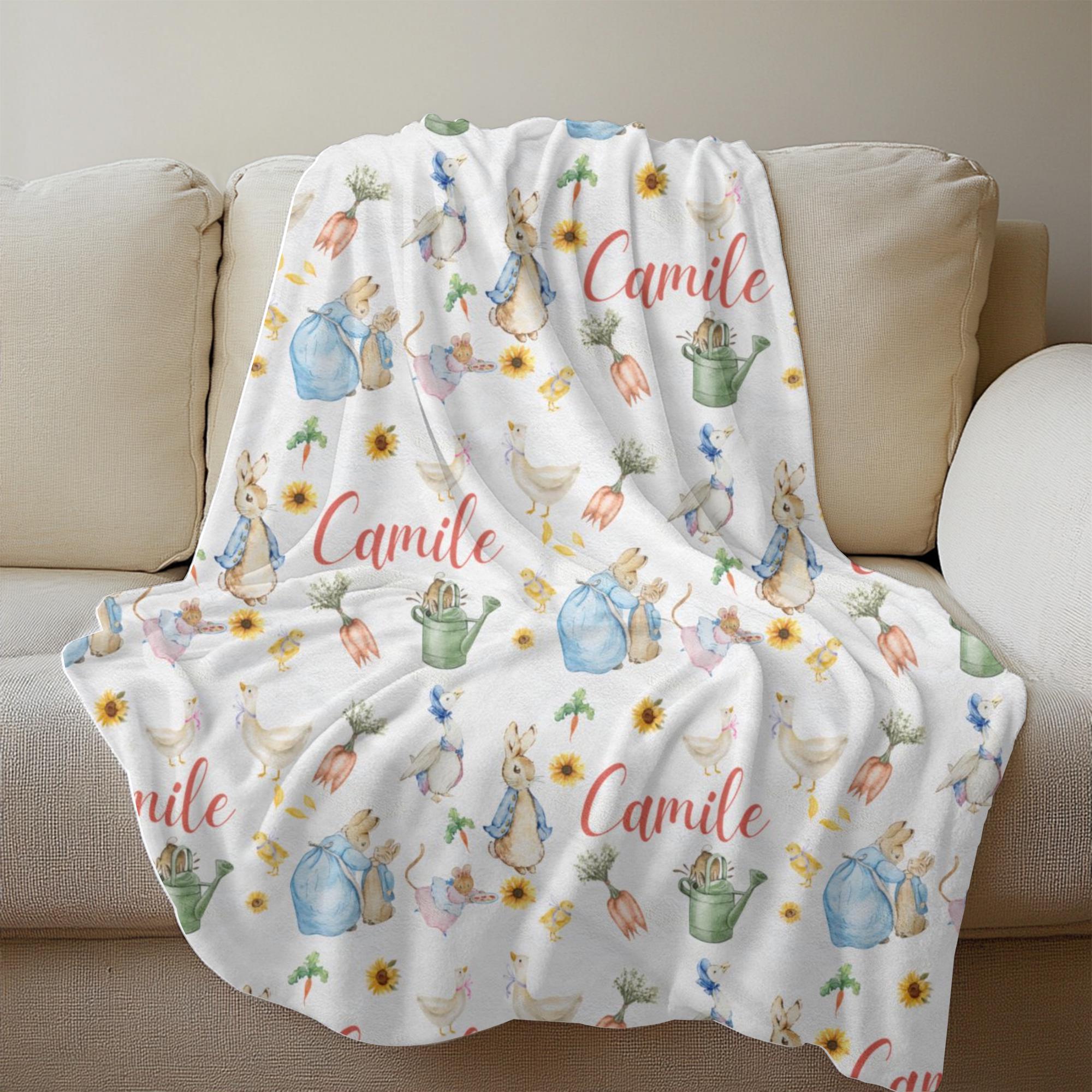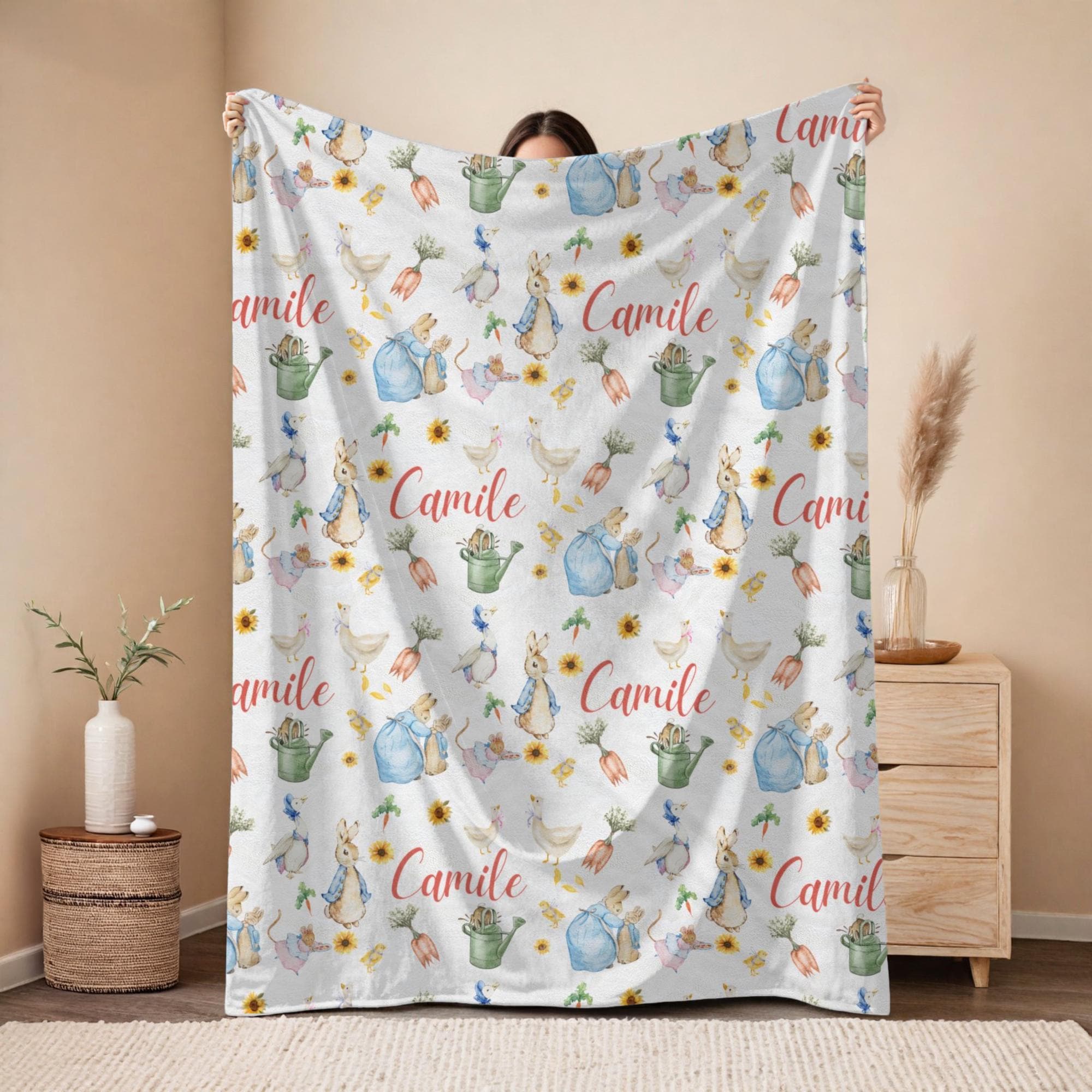 Wrap your little one in timeless storybook charm with this personalized bunny garden blanket. Featuring sweet watercolor illustrations of bunnies, ducks, flowers, and garden tools, this custom blanket is perfect for baby girls, toddler snuggles, or as a thoughtful baby shower gift.