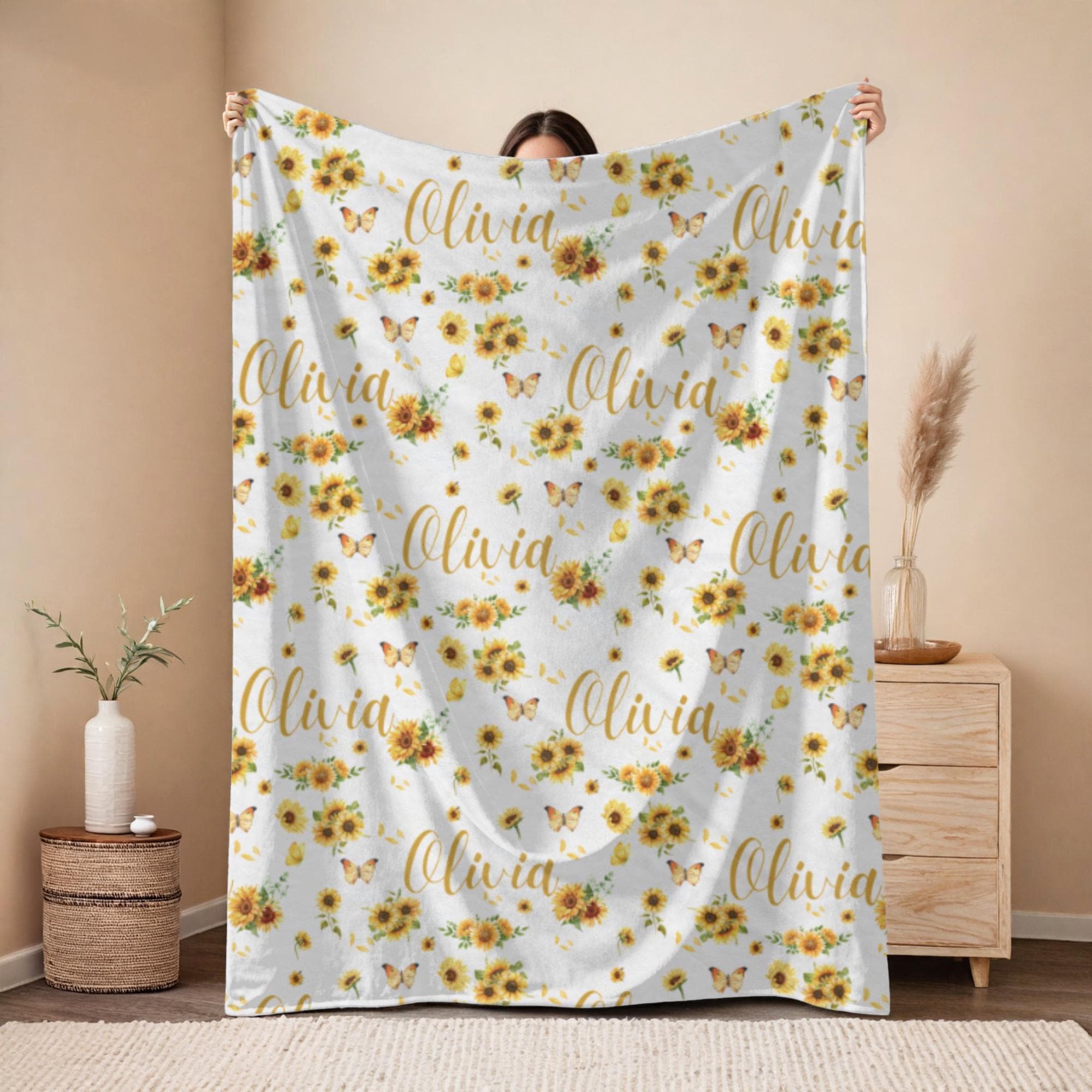 Wrap your little one in sunshine with this personalized sunflower name blanket. Featuring a charming repeating name design with soft watercolor sunflowers, delicate butterflies, and fluttering petals, this custom blanket is perfect for baby girls and sunflower lovers alike.