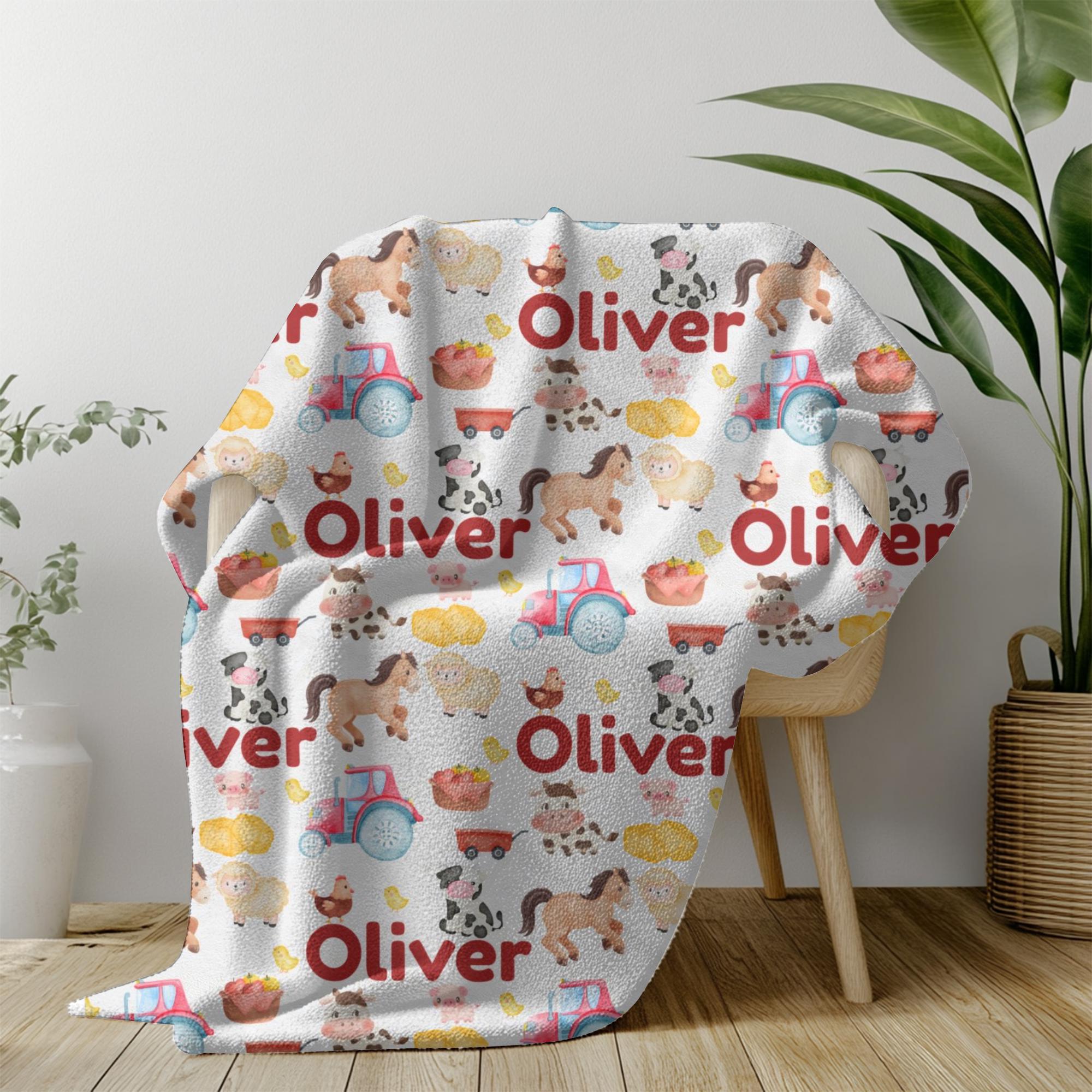 Bring the warmth and charm of the countryside into your little one’s space with this personalized farm animal baby blanket. Featuring adorable barnyard friends — a cow, pig, horse, and sheep — alongside a rustic barn scene and your child’s name in bold, clear lettering, this custom throw is perfect for boys’ nurseries, baby showers, or toddler cuddle time.