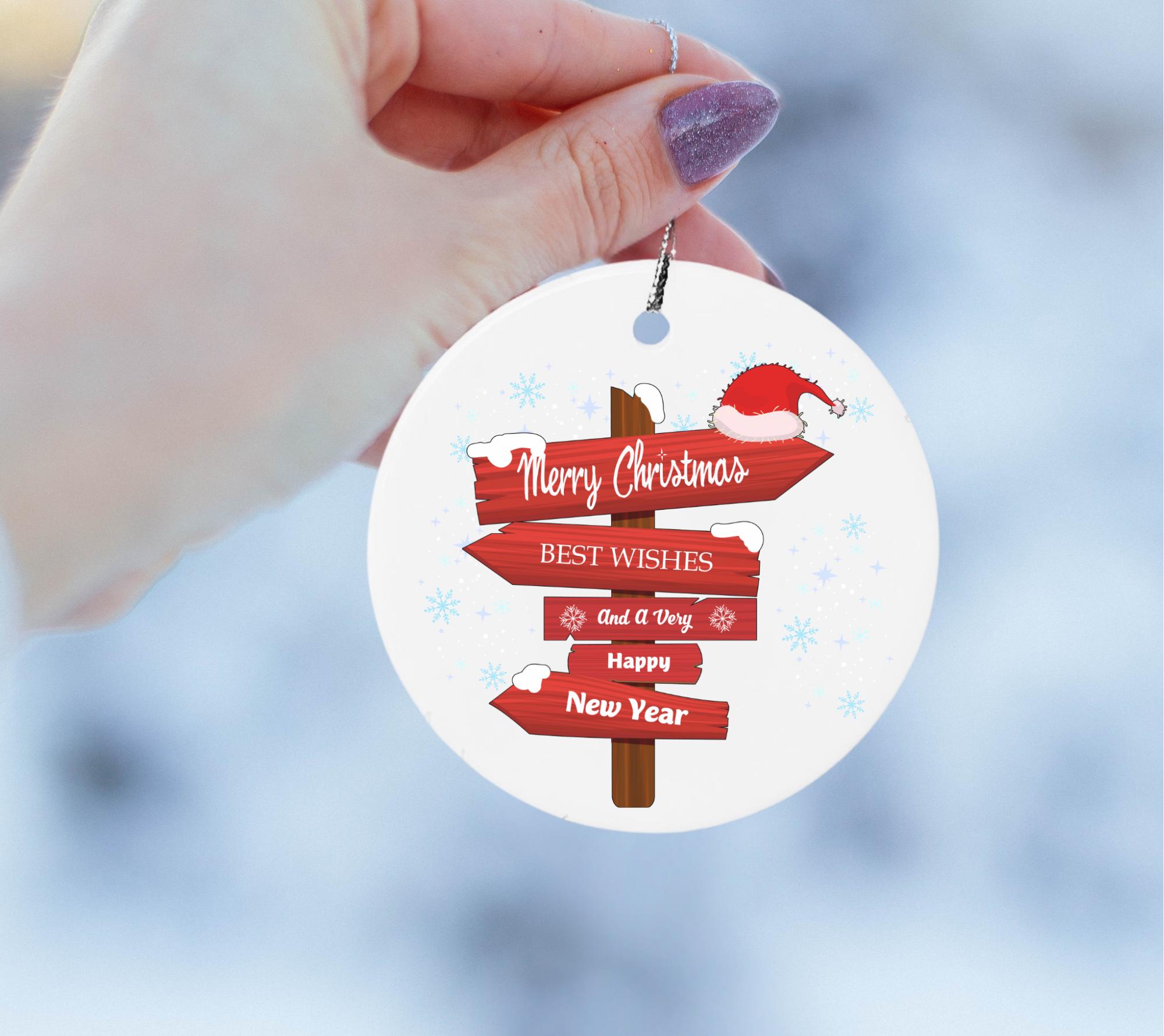 Celebrate the joy of the holiday season with a festive, personalized touch! This handmade ceramic Christmas ornament features a bright red holiday signpost with cheerful greetings, “Merry Christmas,” “Best Wishes,” and “Happy New Year,” topped with a playful Santa hat and surrounded by delicate snowflakes. Personalized with your name and year on the back, this keepsake is perfect for hanging on your Christmas tree, giving as a thoughtful holiday gift, or adding to your festive home décor.