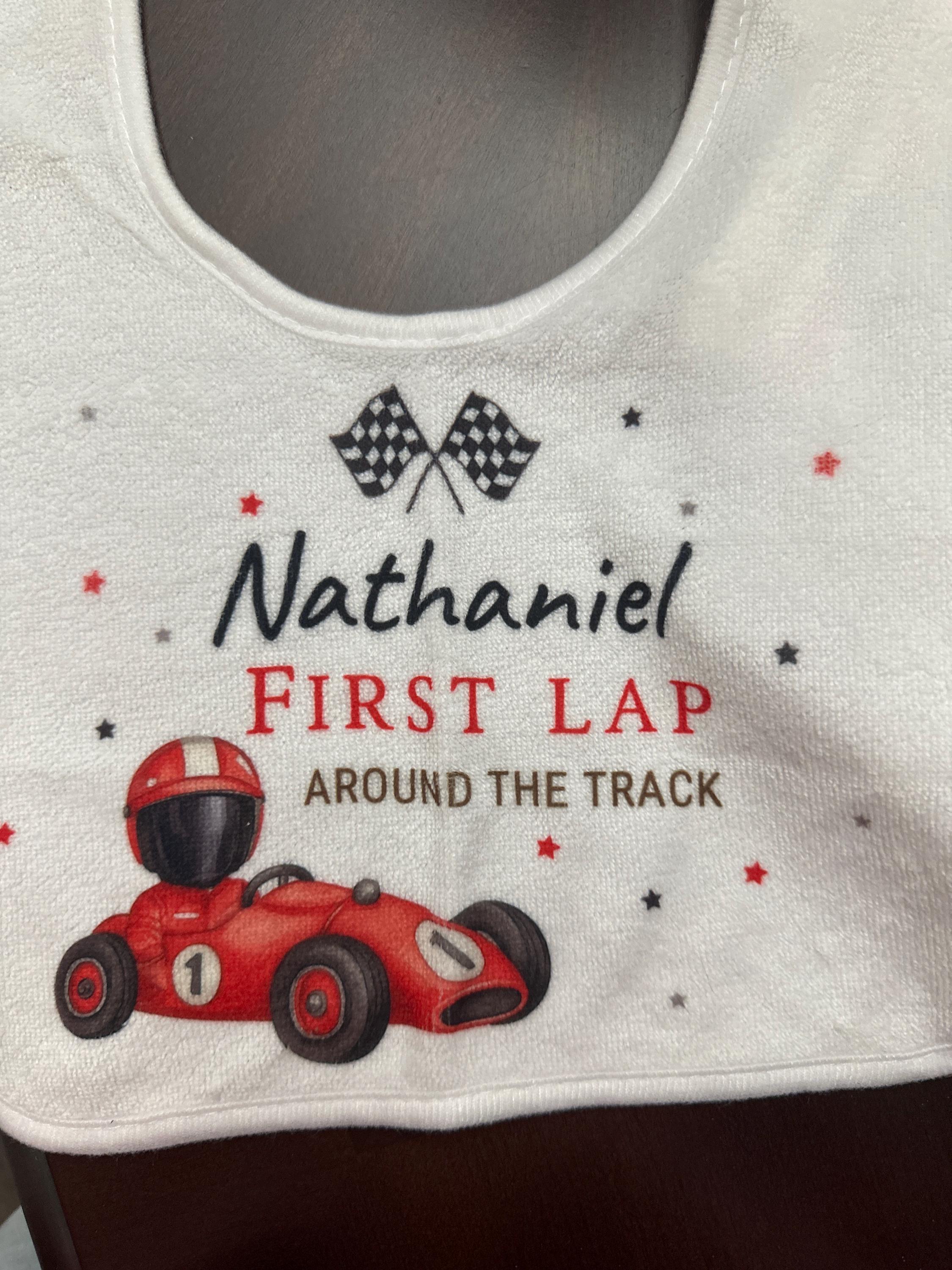 Celebrate your little racer’s first birthday with this adorable First Lap Around the Track bib and matching sippy cup. Perfect for race car birthday parties, cake smash photos, and milestone celebrations, this set is both practical and keepsake-worthy.