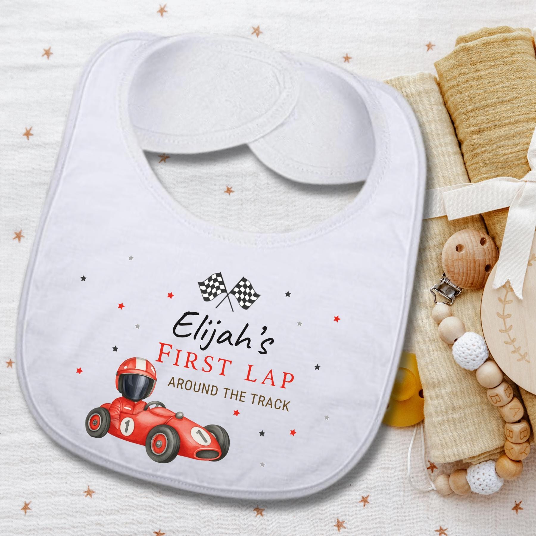 Personalized with your child’s name, it features a bright red race car, checkered flags, and playful stars—making it an eye-catching accessory that’s as photo-worthy as it is practical. Whether it's worn for the party, a first birthday photoshoot, or saved as a sweet memento, this bib adds the perfect finishing touch.