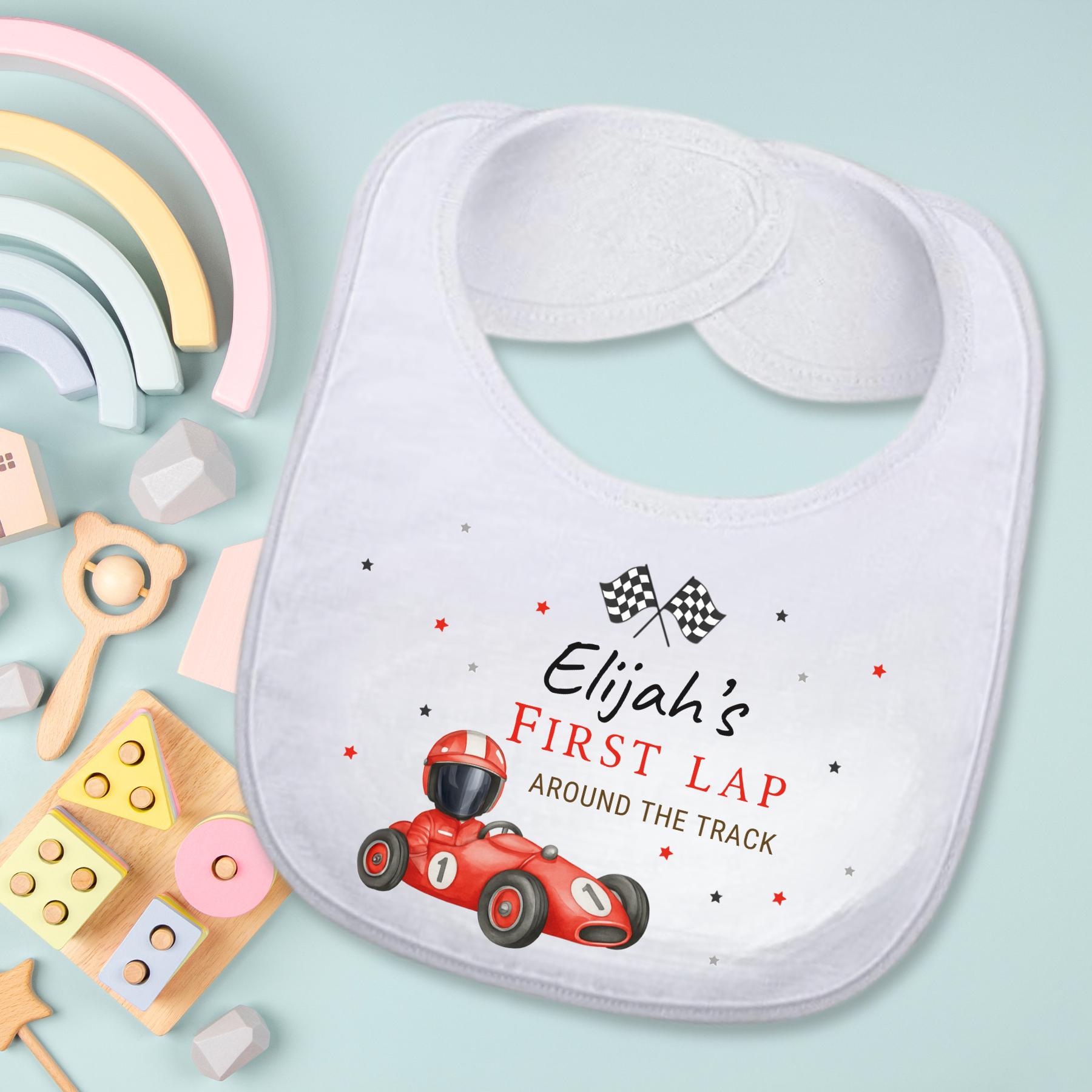 Start your little racer’s big day with a victory lap! This adorable "First Lap Around the Track" race car bib is the perfect touch for a 1st birthday party, cake smash photo shoot, or keepsake that celebrates your baby boy's milestone with charm and fun.