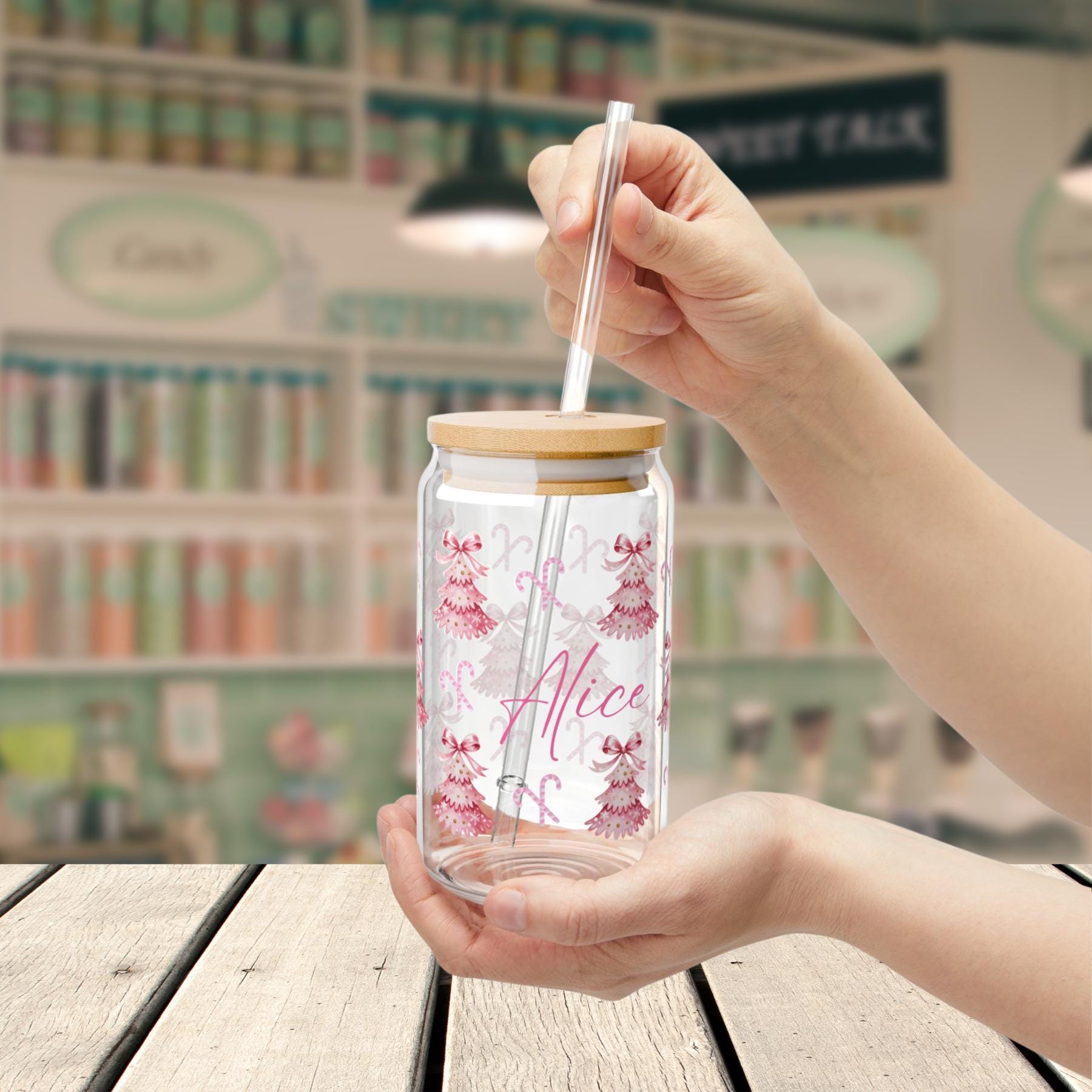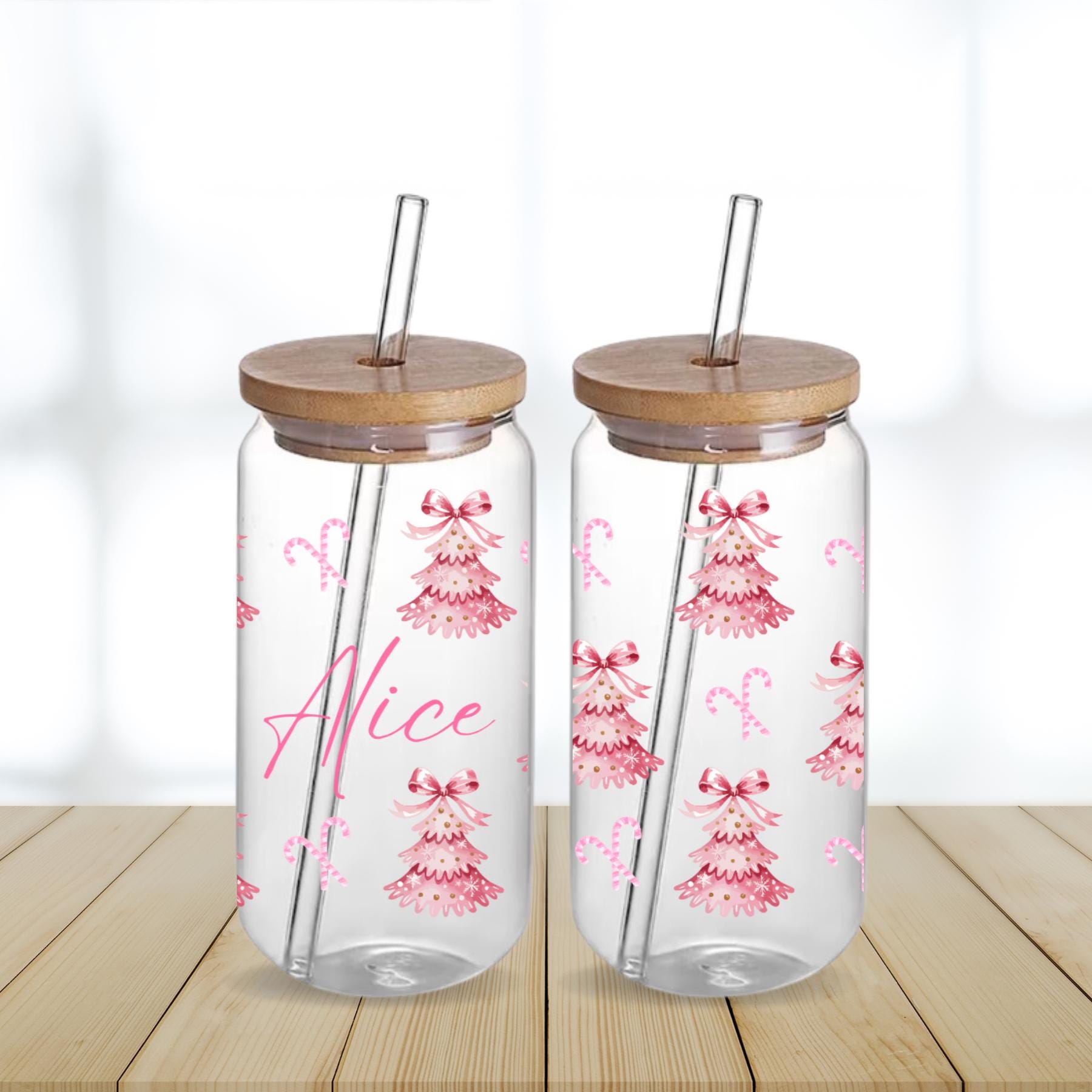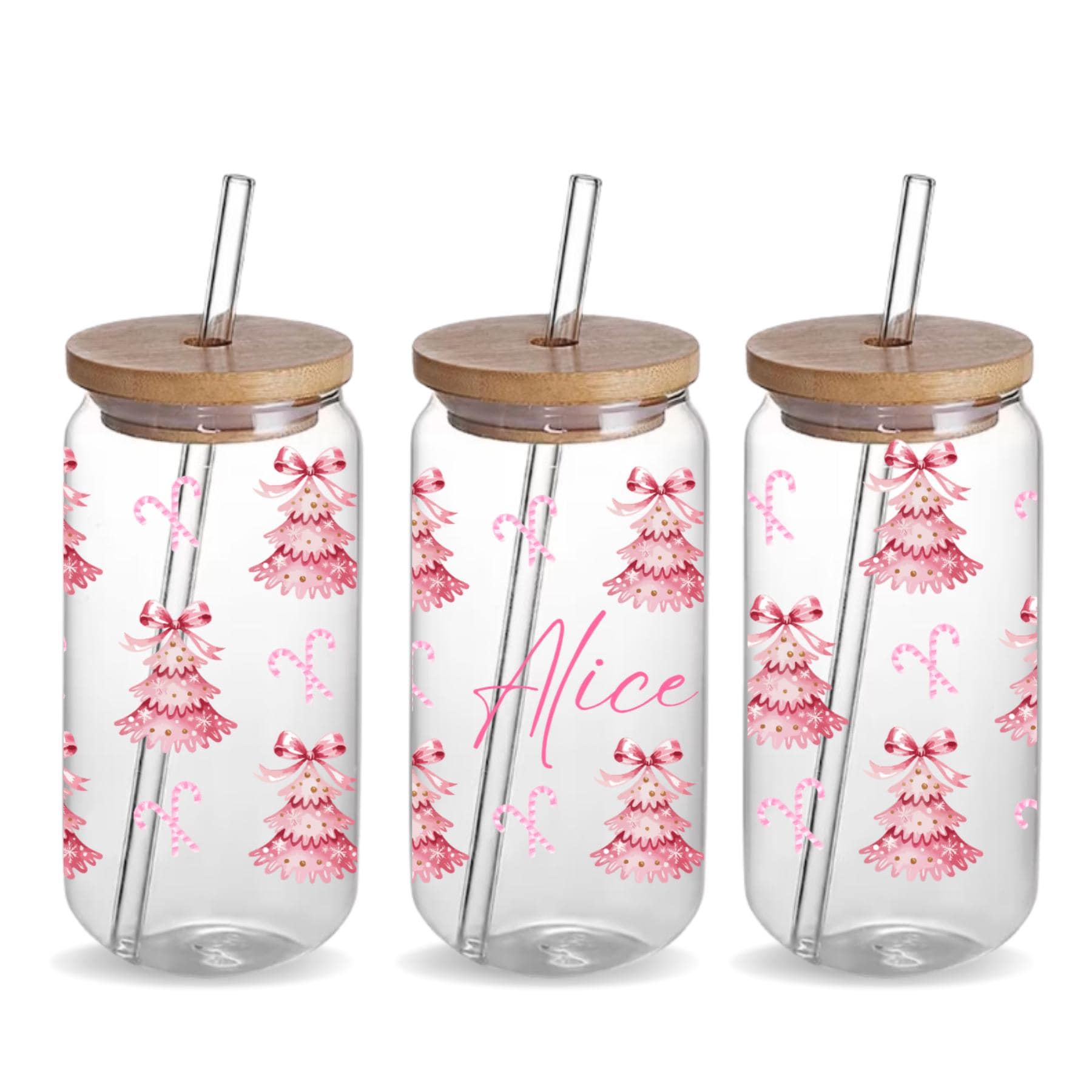 Sip the season in style with this pink Christmas can glass cup, a perfect holiday gift for her! Decorated with soft pink Christmas trees, candy canes, and a personalized name, this festive glass adds a cozy, feminine touch to your favorite drink.