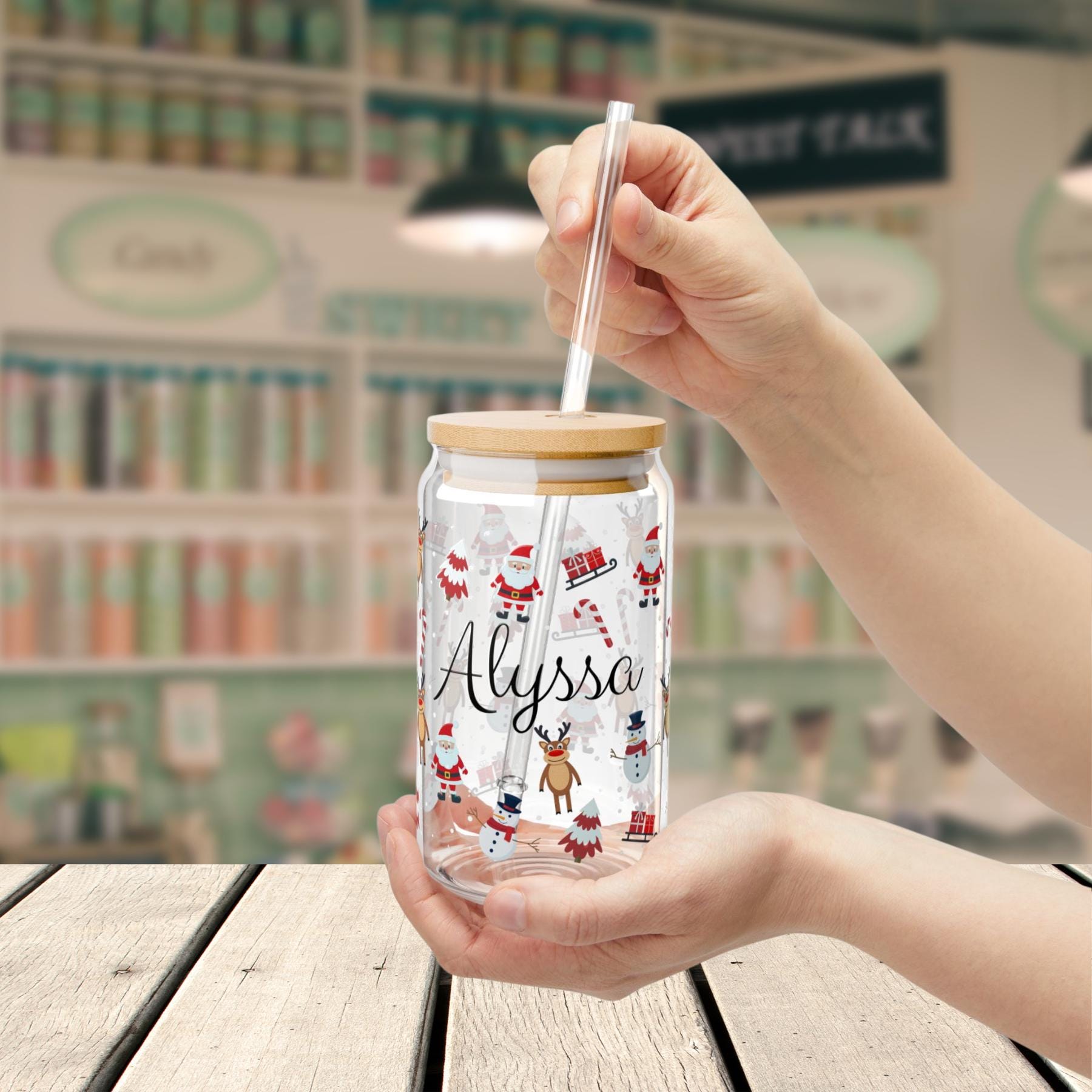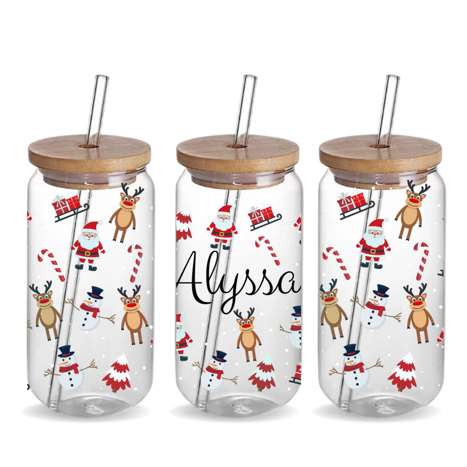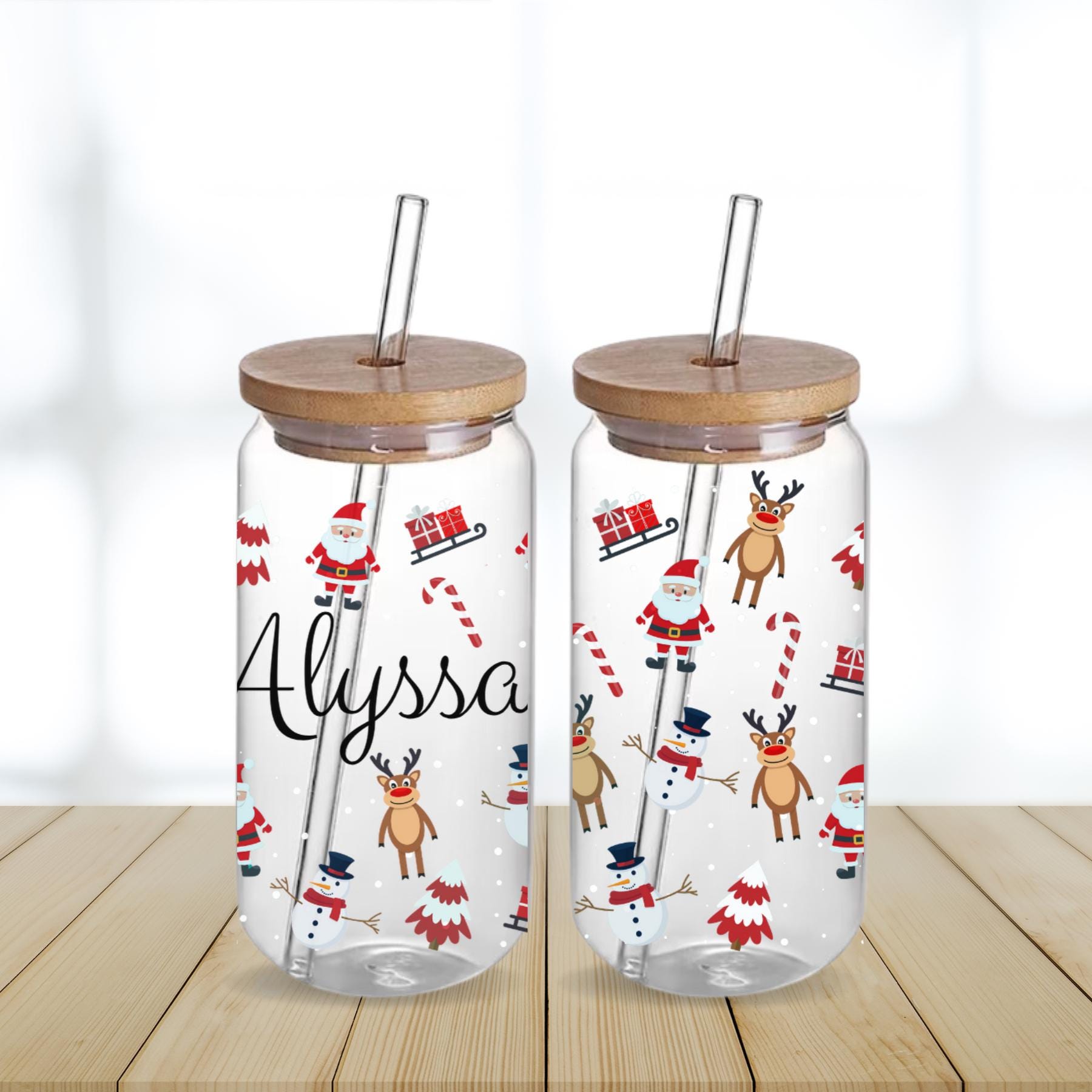 Make every sip merry with this personalized Christmas glass featuring Santa, reindeer, snowmen, and candy canes. Customized with your name, this festive holiday sipper is perfect for iced coffee, hot cocoa, or any favorite drink of the season.