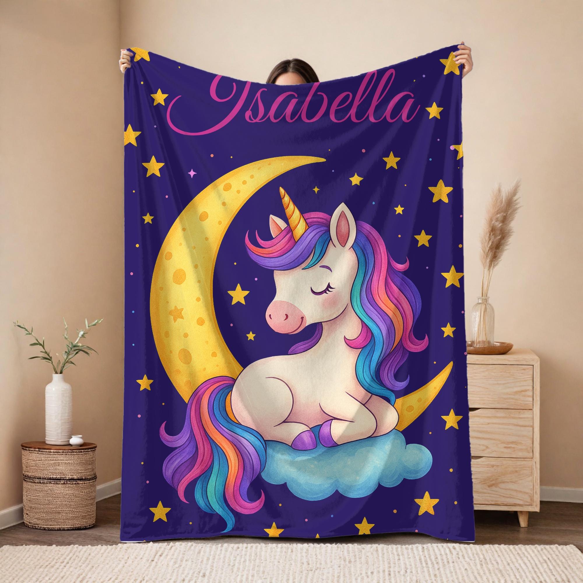 Bring a touch of magic to bedtime with this personalized unicorn and moon blanket, featuring a dreamy celestial design and your child’s name. This vibrant, high-resolution print includes a sweet pink unicorn, sparkling stars, and a glowing crescent moon, perfect for toddlers, kids, or newborns.
