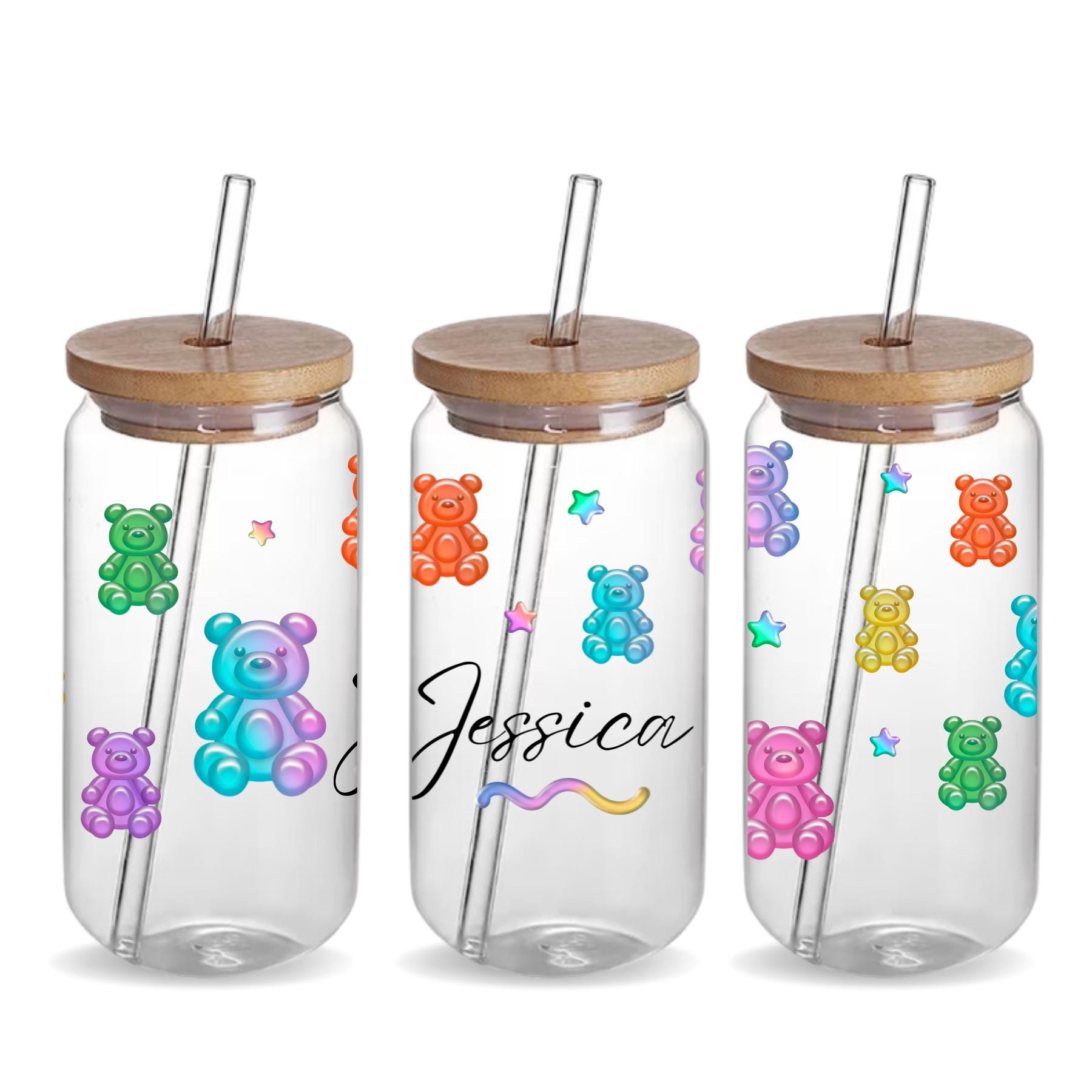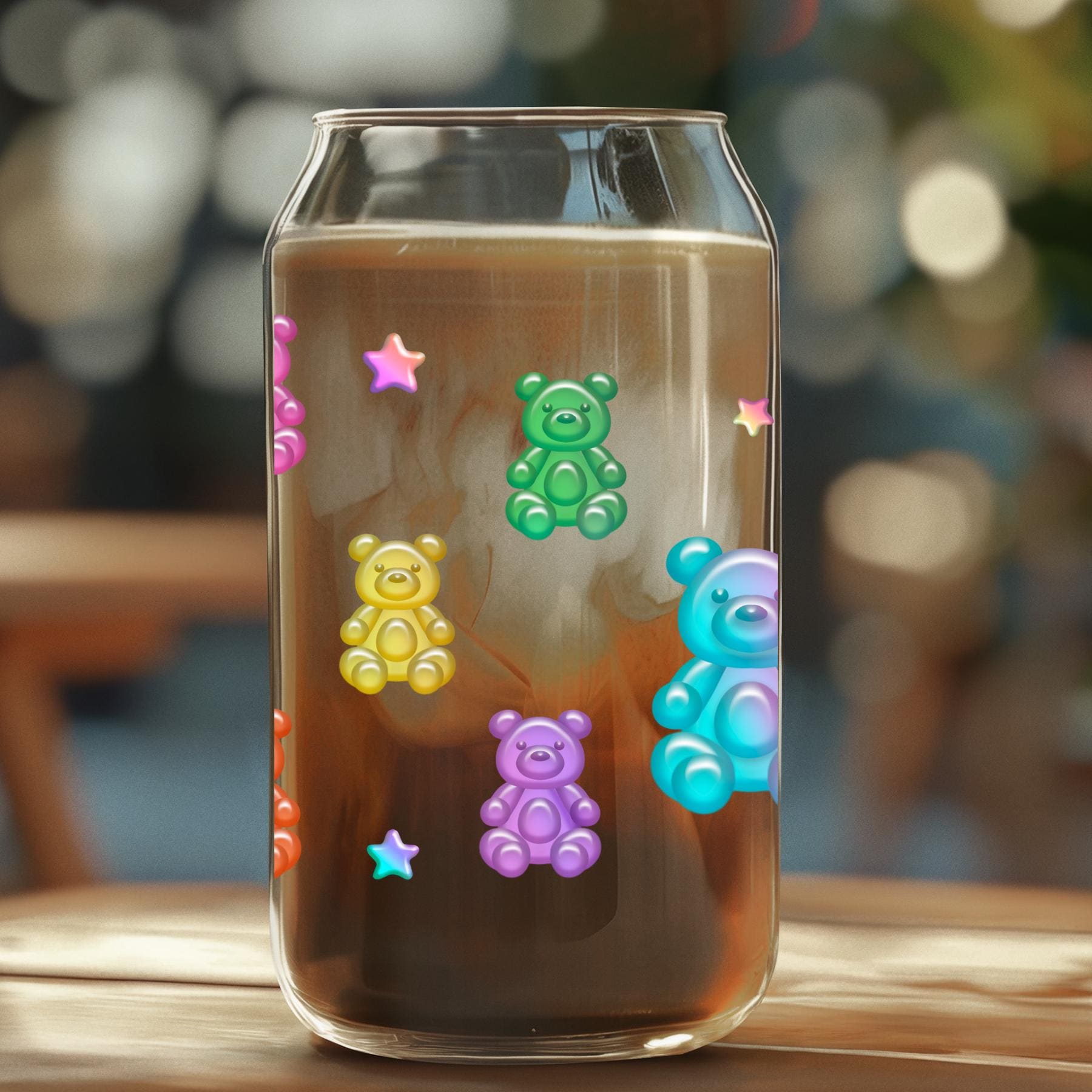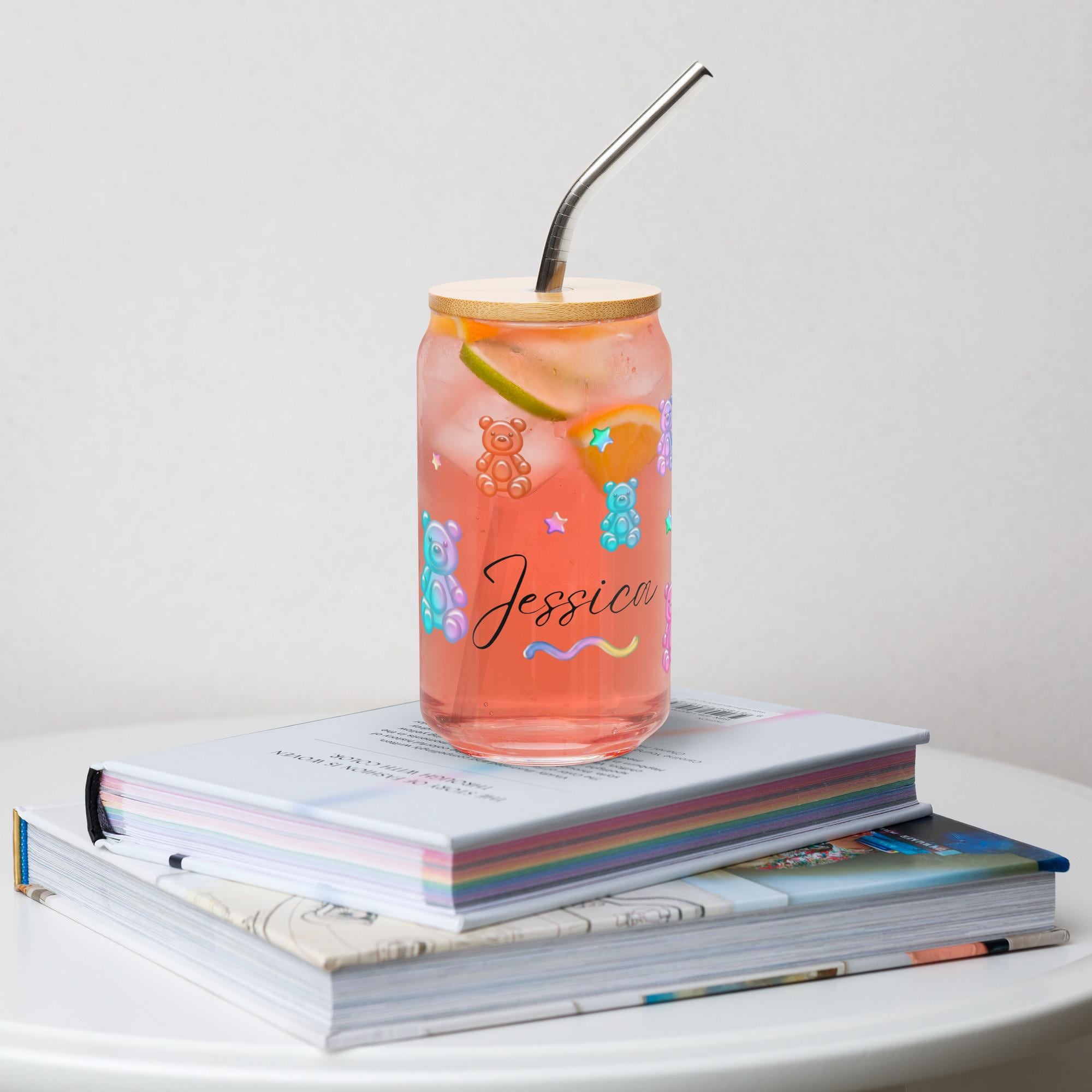 Bright, playful, and unique, this Personalized Gummy Bear Glass Cup is the perfect way to make your daily iced coffee or matcha feel special. Designed with adorable rainbow gummy bears, pastel stars, and your custom name, this colorful can-shaped glass combines aesthetic design with functionality.