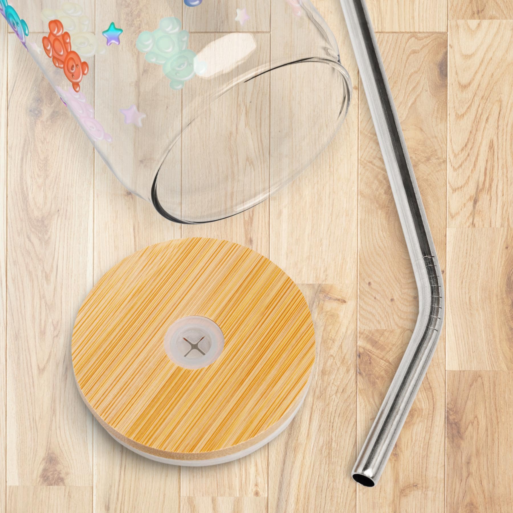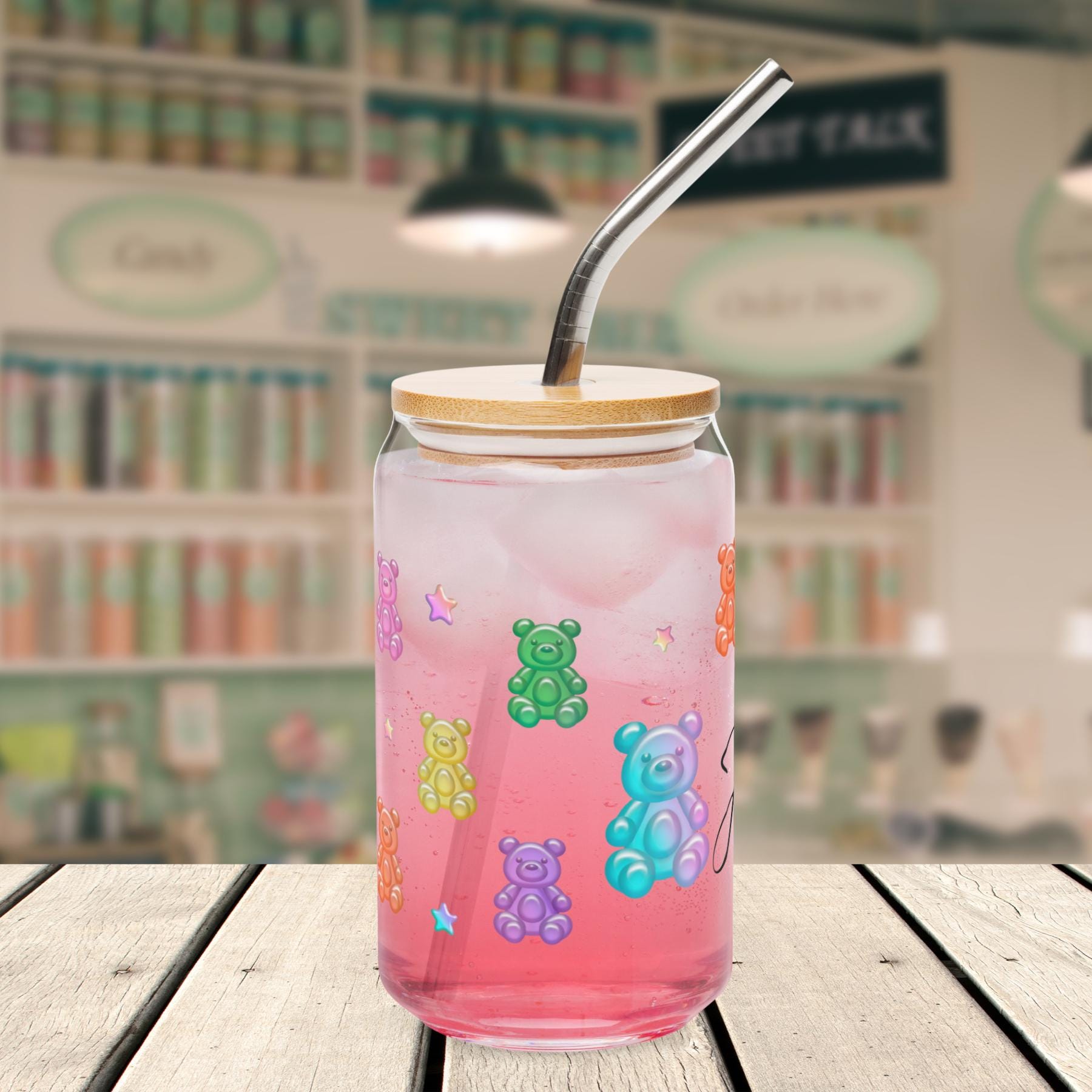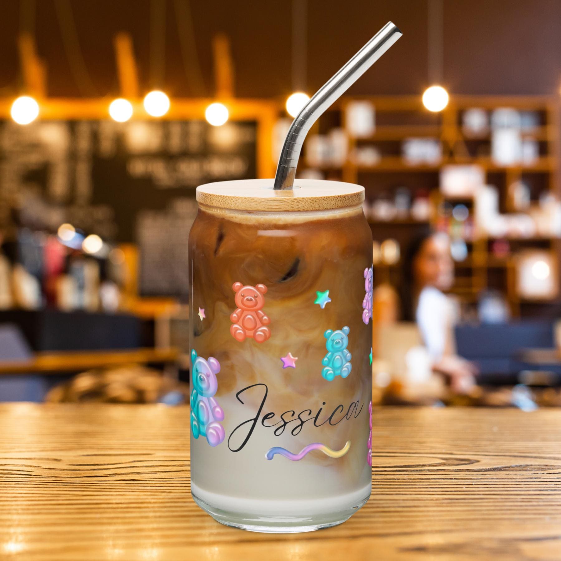 Bright, playful, and unique, this Personalized Gummy Bear Glass Cup is the perfect way to make your daily iced coffee or matcha feel special. Designed with adorable rainbow gummy bears, pastel stars, and your custom name, this colorful can-shaped glass combines aesthetic design with functionality.