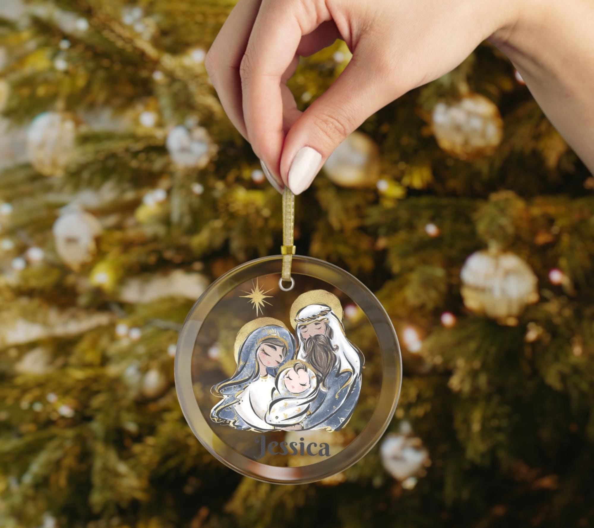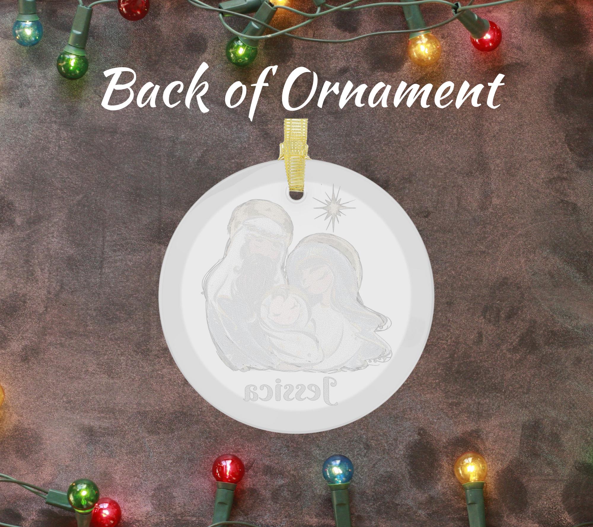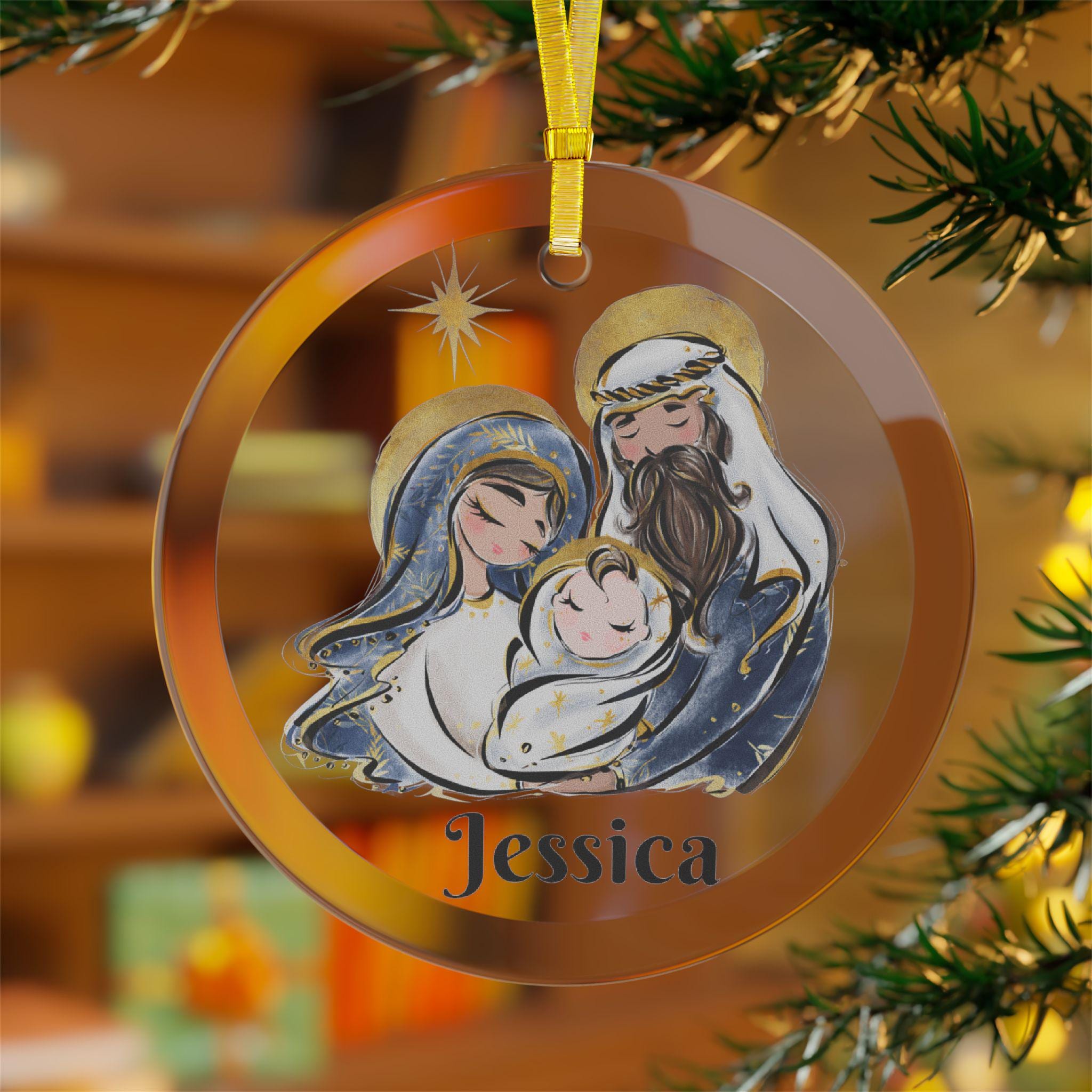 Celebrate the true meaning of Christmas with this beautiful Holy Family glass ornament, featuring Mary, Joseph, and Baby Jesus under the Star of Bethlehem. Crafted from 100% premium glass with a beveled edge that reflects tree lights beautifully, this personalized ornament brings timeless faith and elegance to your holiday décor. Add a name or year for a heartfelt keepsake that will be cherished for years to come.