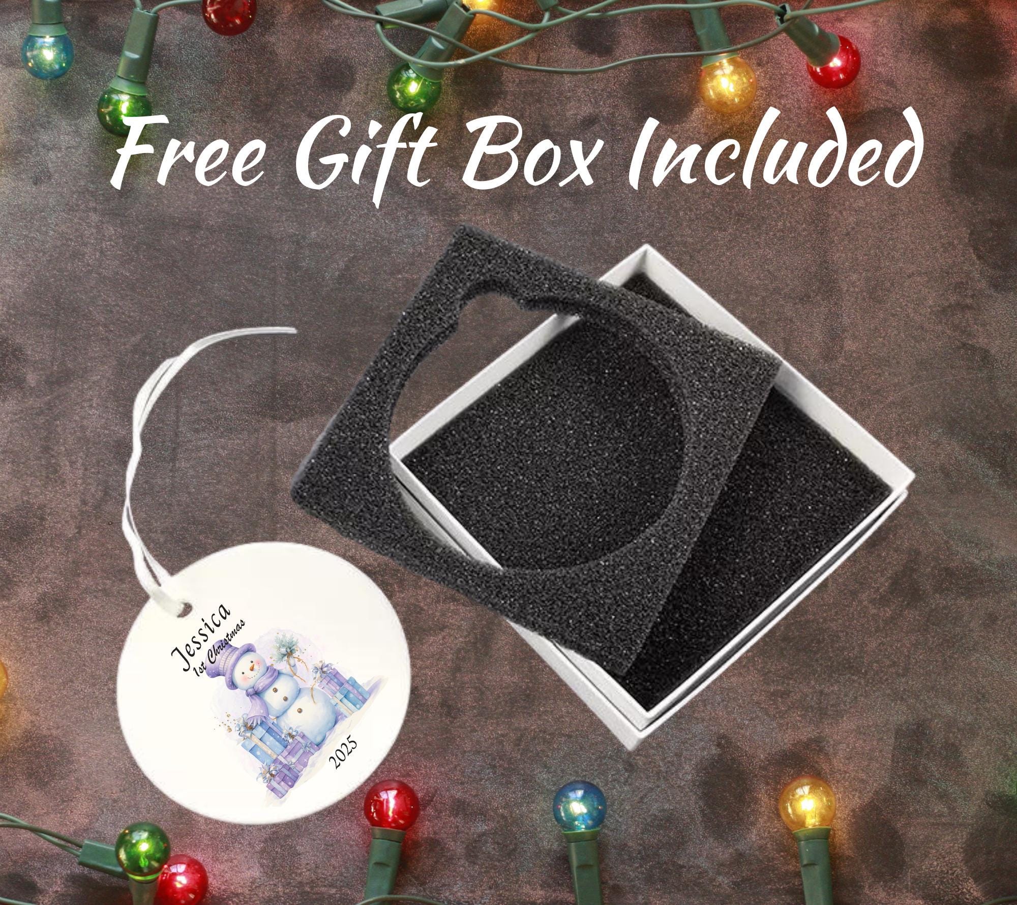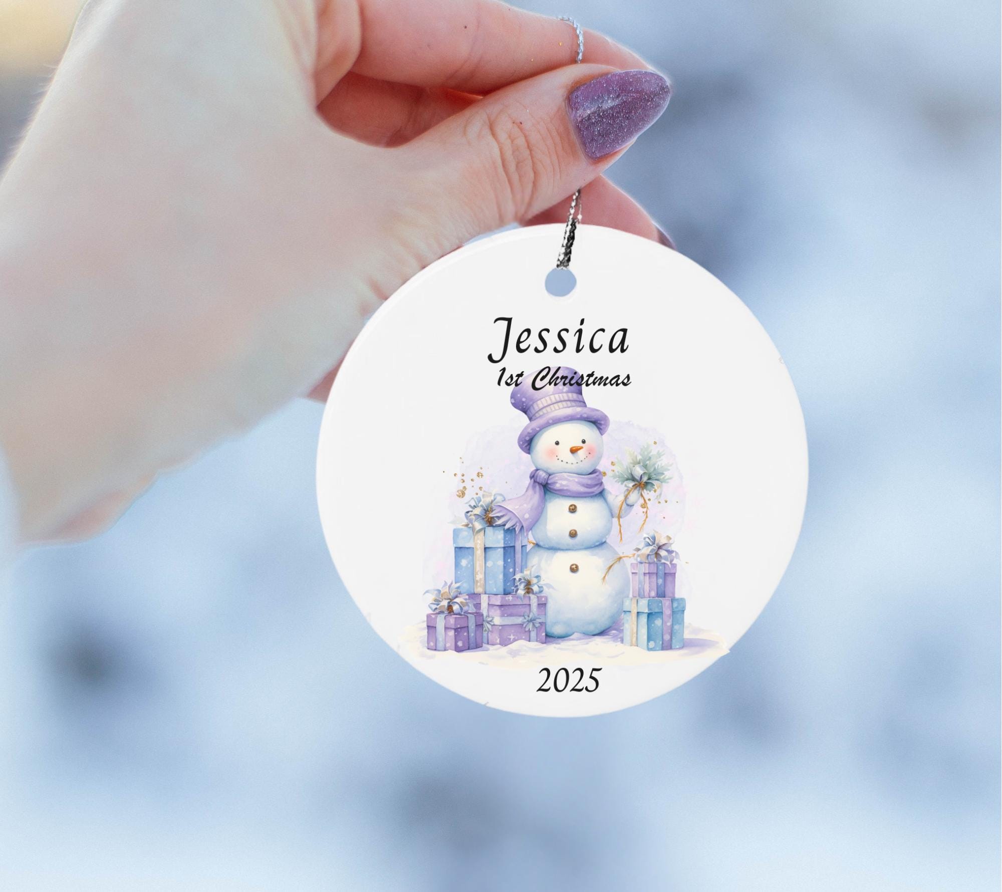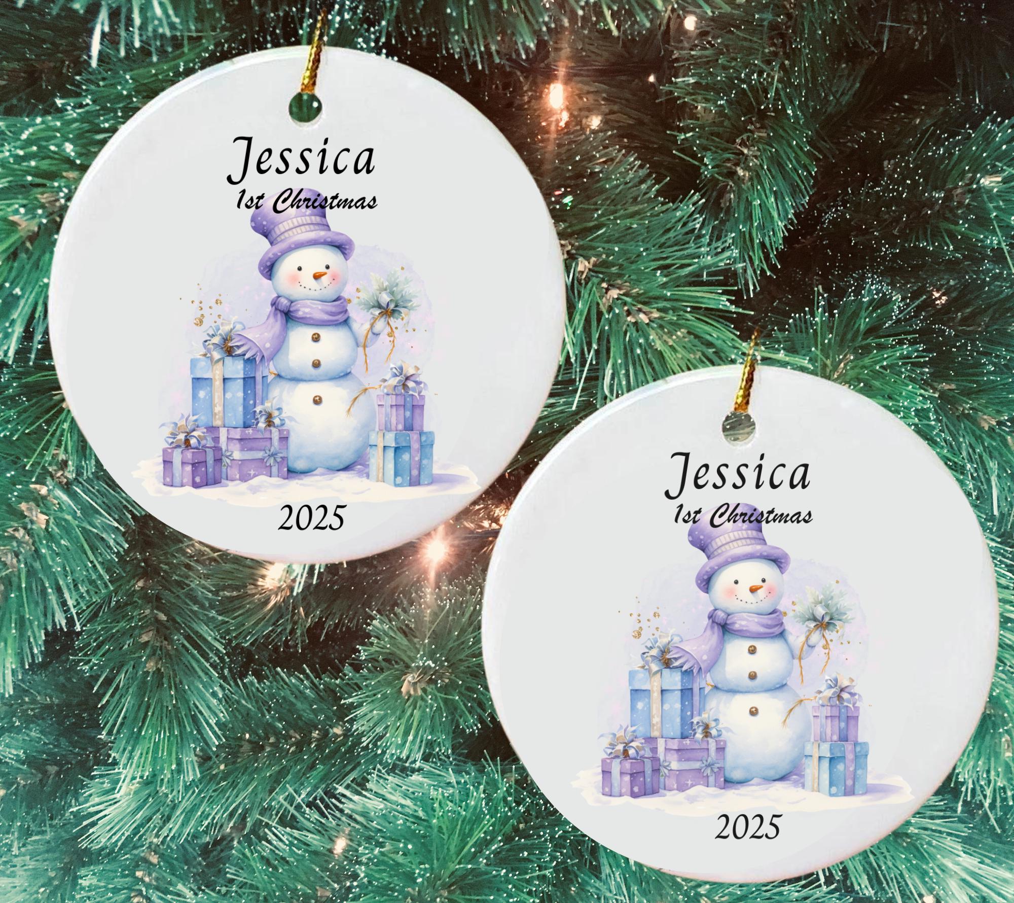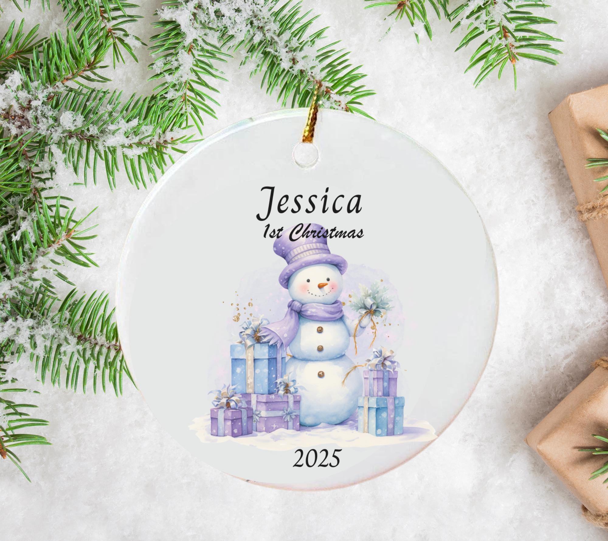 Celebrate your little one’s magical first holiday with this adorable Personalized Snowman Baby’s First Christmas Ornament. Featuring a charming watercolor snowman surrounded by pastel purple gifts, this custom ceramic ornament captures the joy and wonder of your baby’s very first Christmas. Perfect for new parents, grandparents, or godparents, this keepsake will shine on your family tree for years to come.