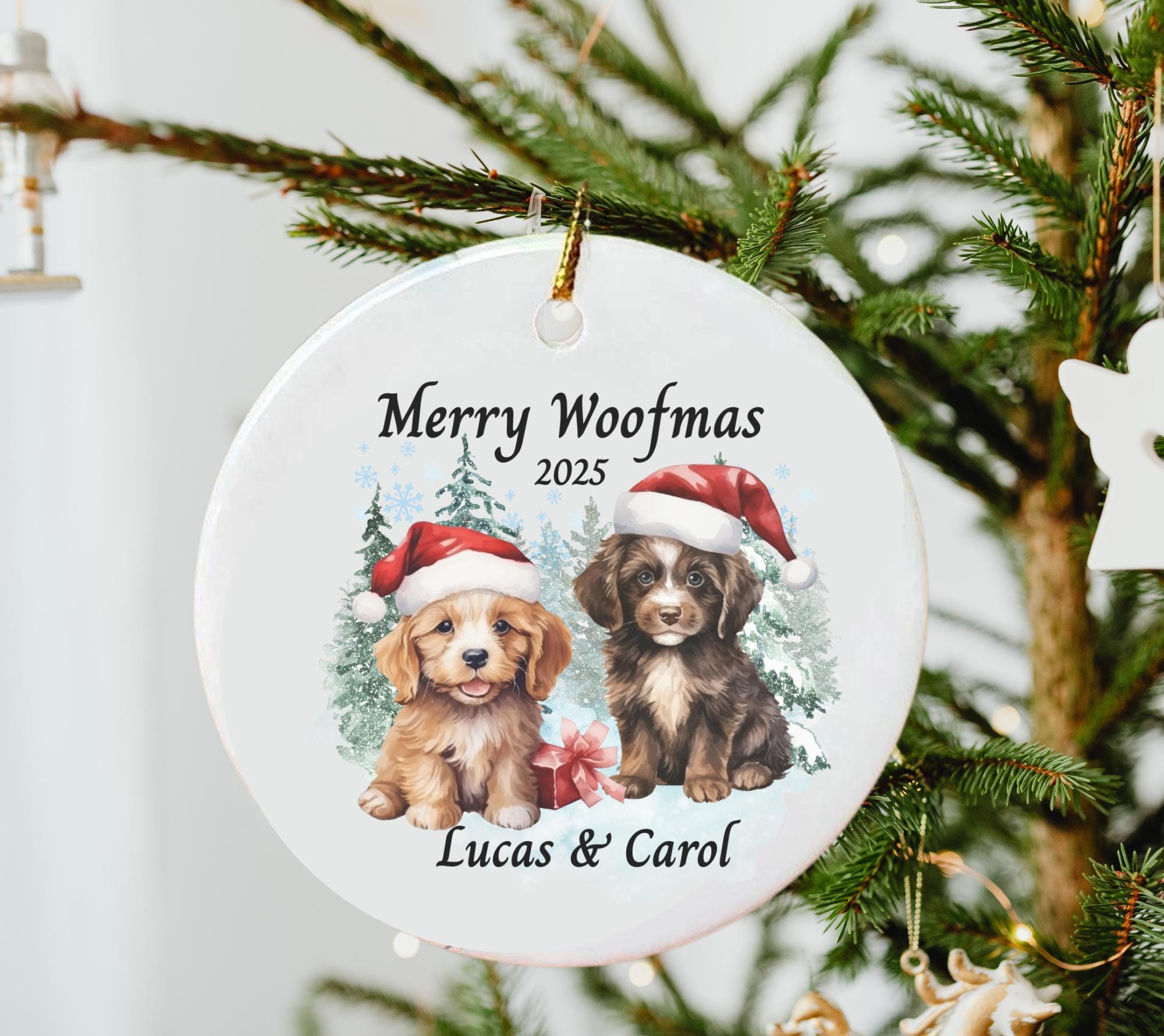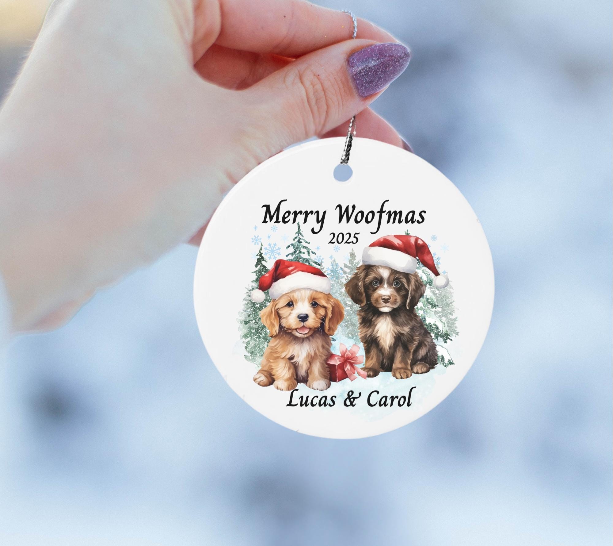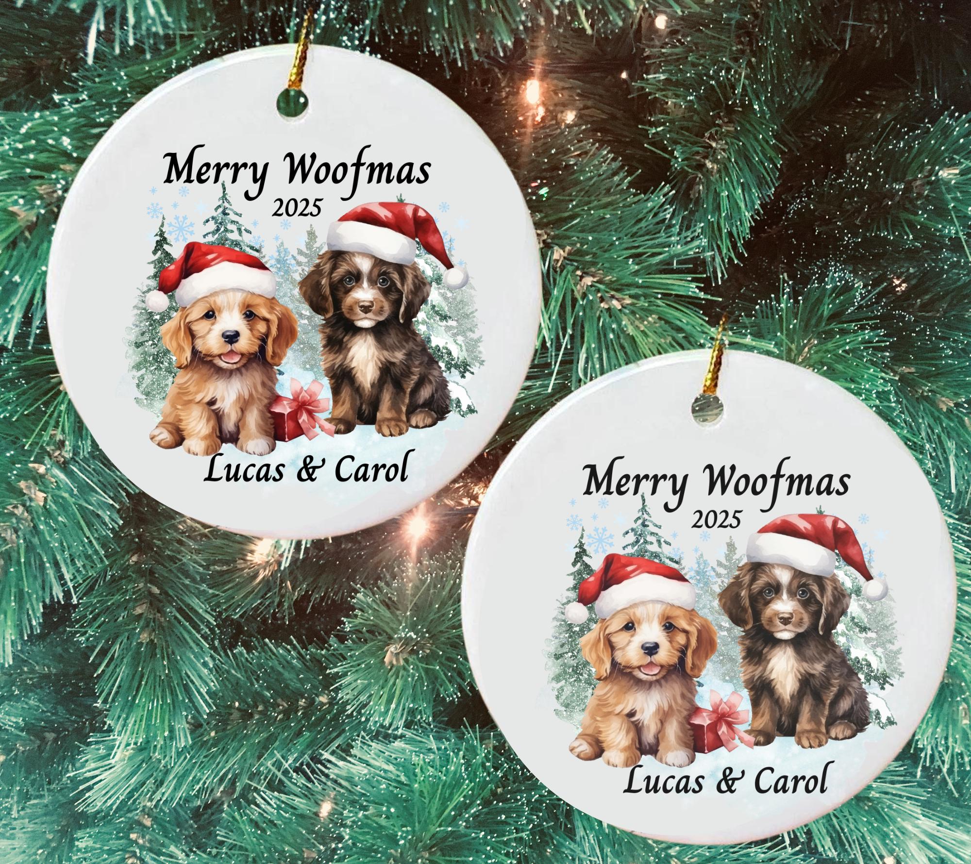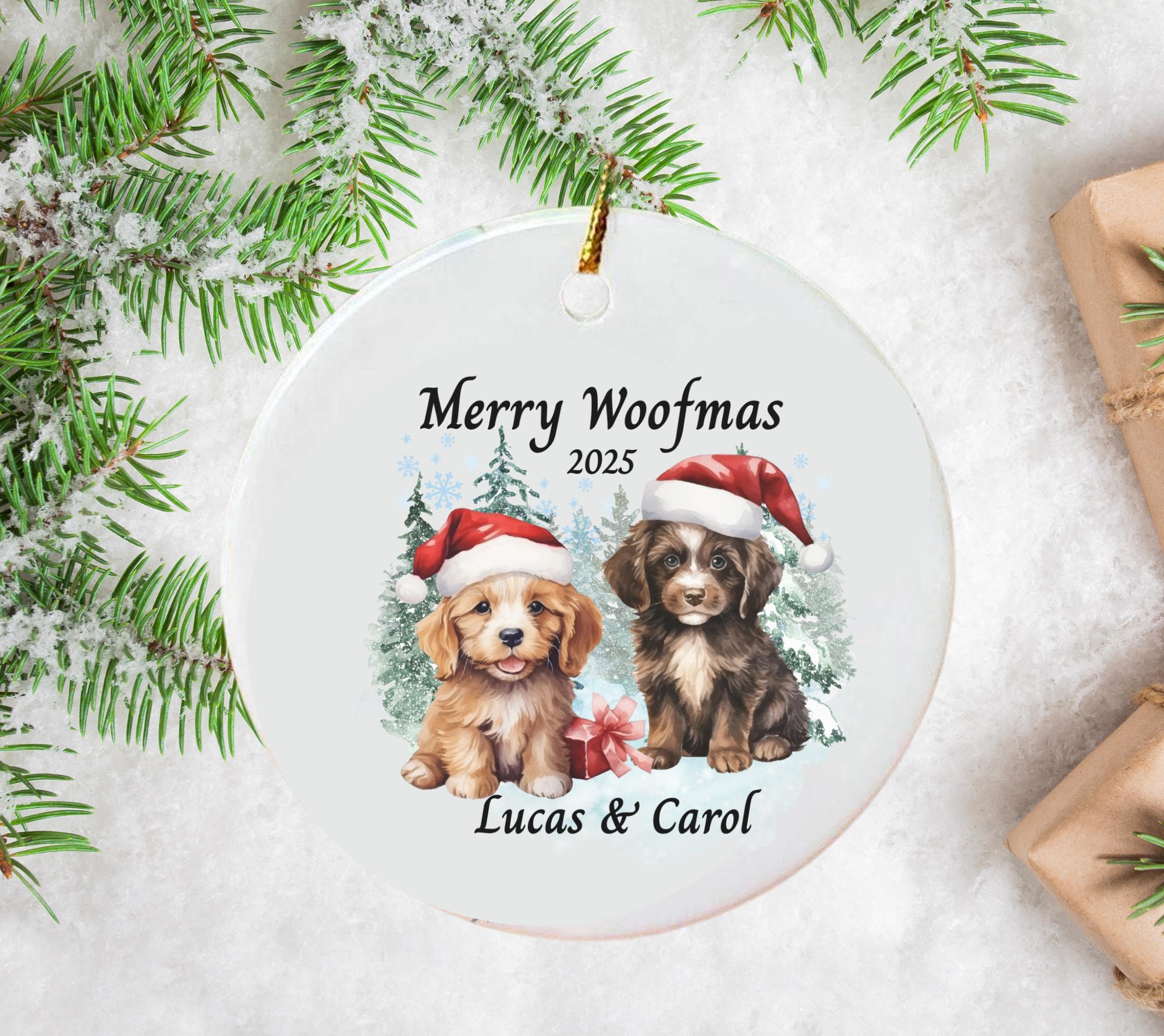 Celebrate the holidays with this adorable Dog Christmas Ornament — a festive keepsake featuring two playful puppies in Santa hats, surrounded by snowy trees and winter charm. This Personalized Merry Woofmas Ornament 2025 makes the perfect Christmas gift for dog lovers, pet parents, couples, or families celebrating the season with their furry friends.