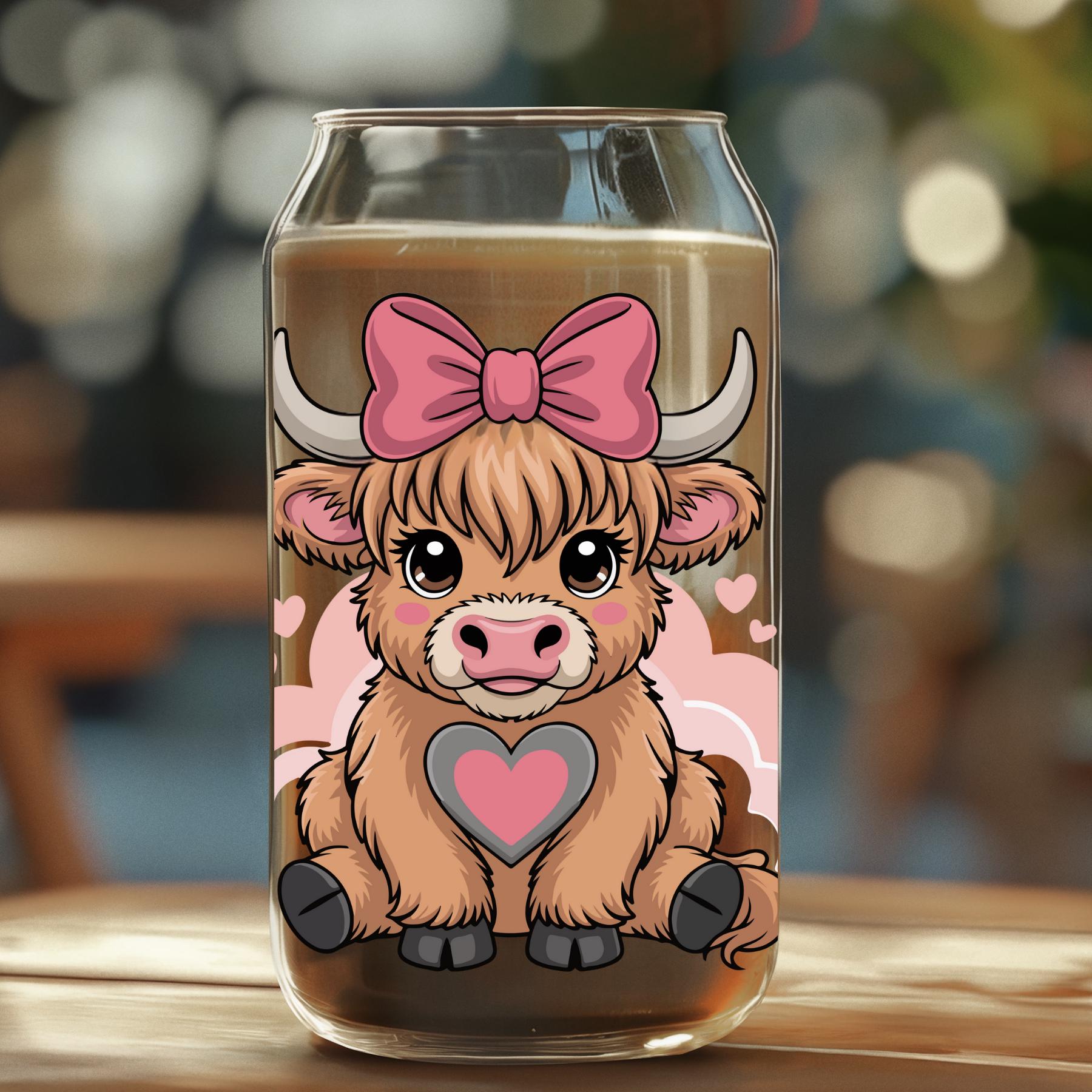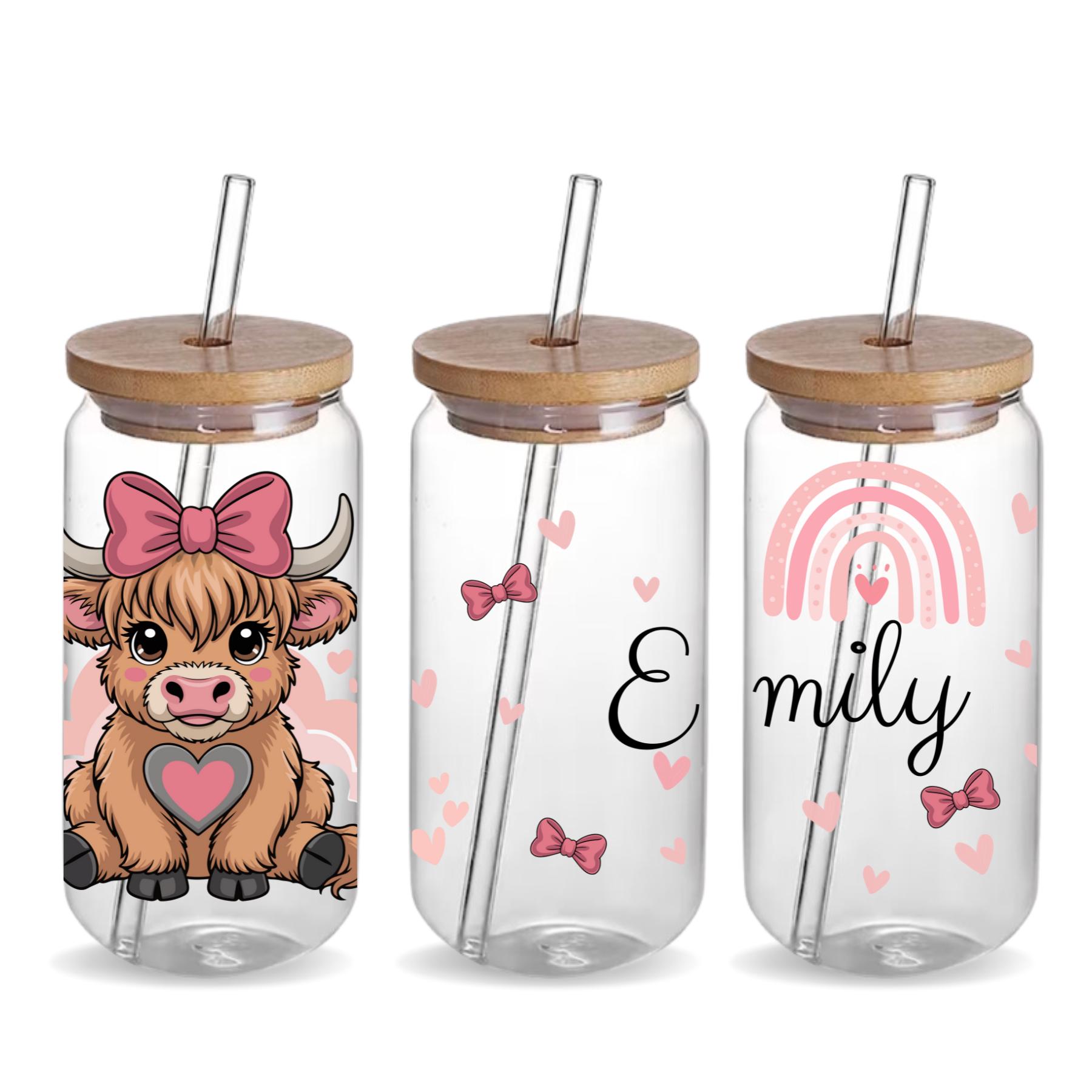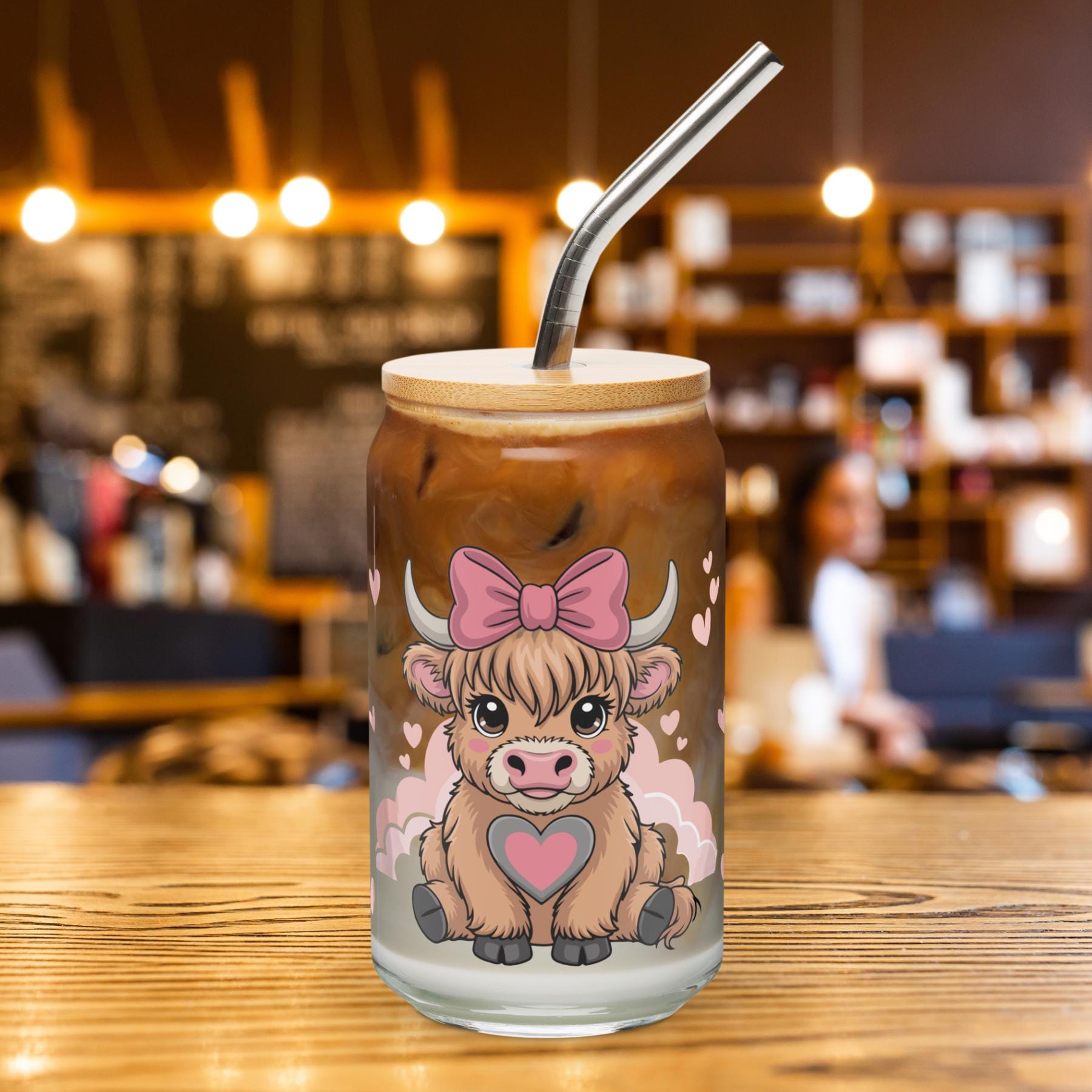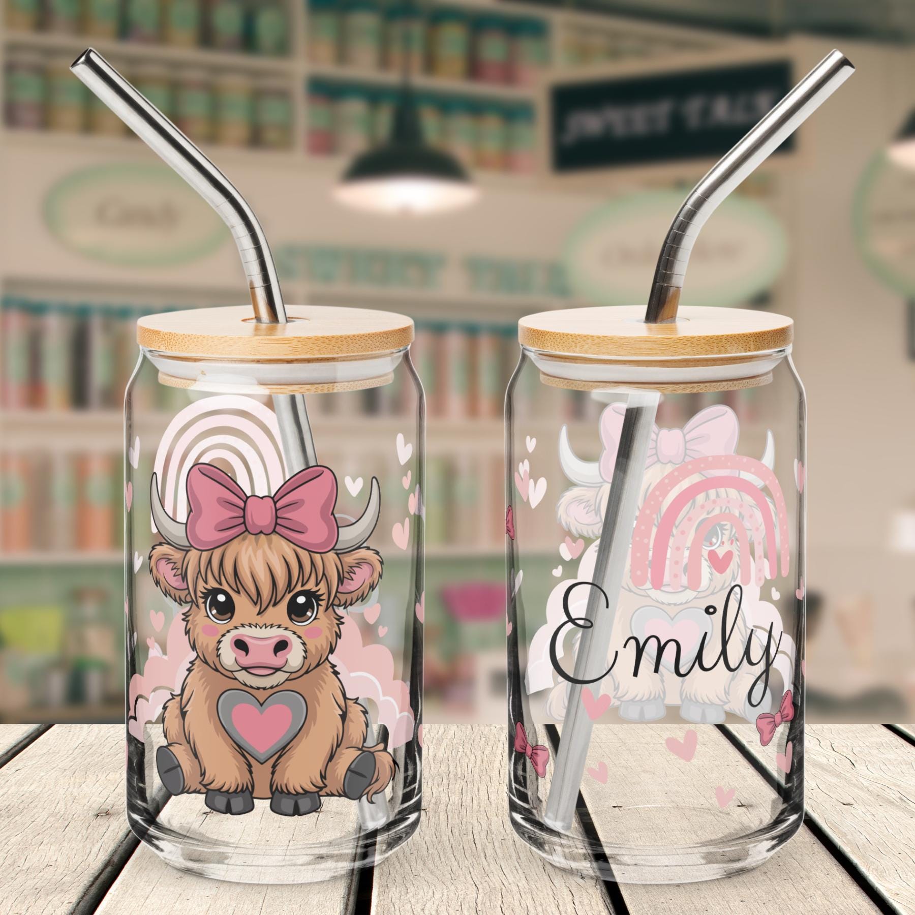 Bring charm and sweetness to your morning routine with this Personalized Highland Cow Glass Cup, a perfect mix of cute, cozy, and country chic. Featuring an adorable baby cow with a pink bow, surrounded by pastel hearts and rainbows, this glass can cup makes every sip feel special.