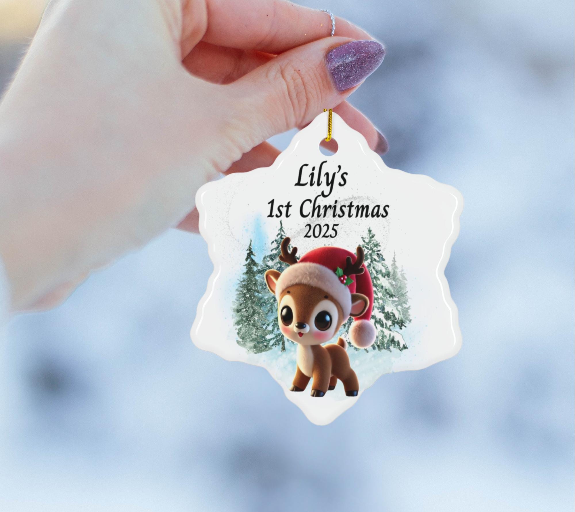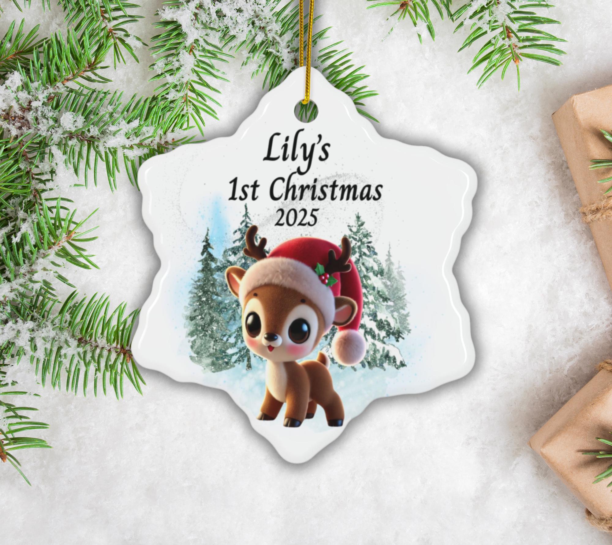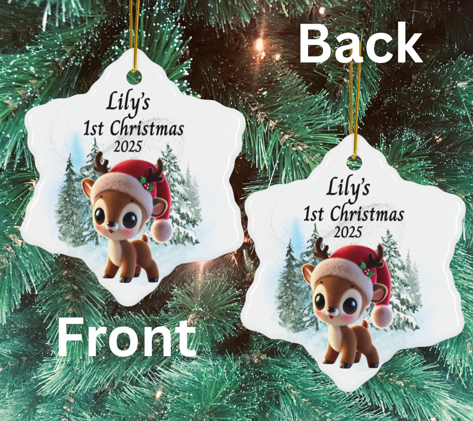 Celebrate your little one’s first holiday season with this sweet Baby’s 1st Christmas Ornament 2025, featuring an adorable baby reindeer wearing a festive Santa hat. Designed in soft winter tones with a snowy forest background, this personalized reindeer ornament makes a heartwarming addition to your family Christmas tree and a keepsake you’ll treasure forever.