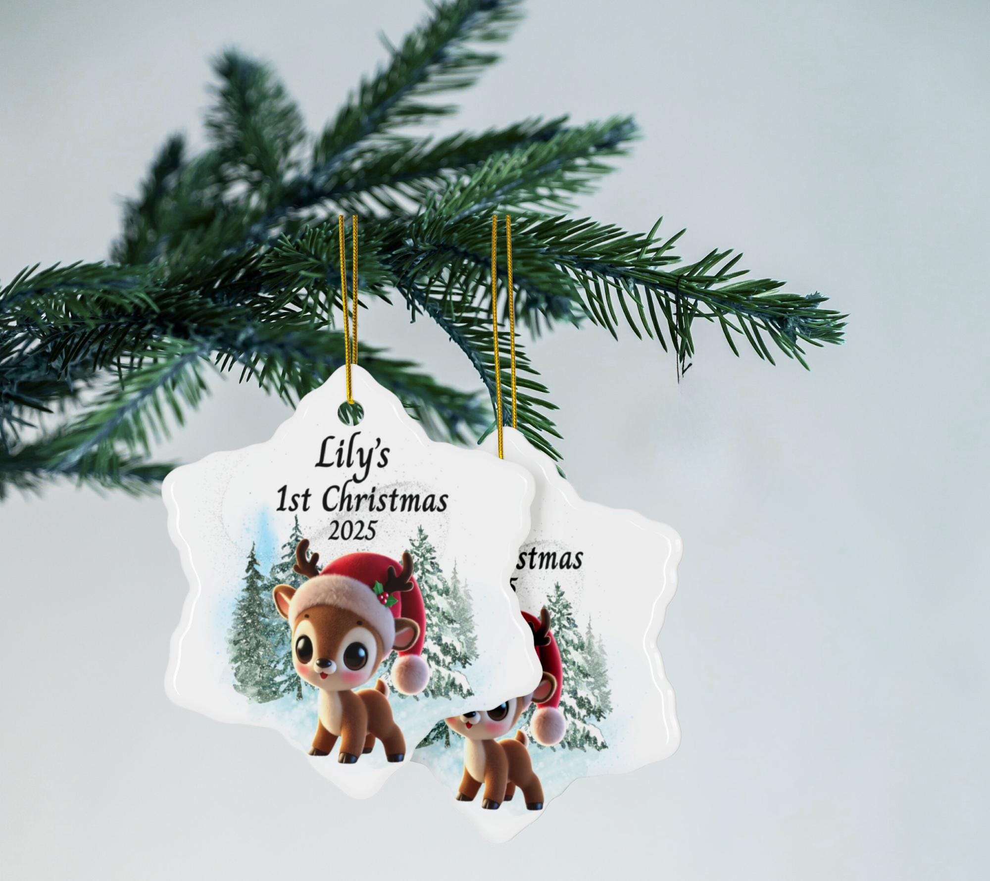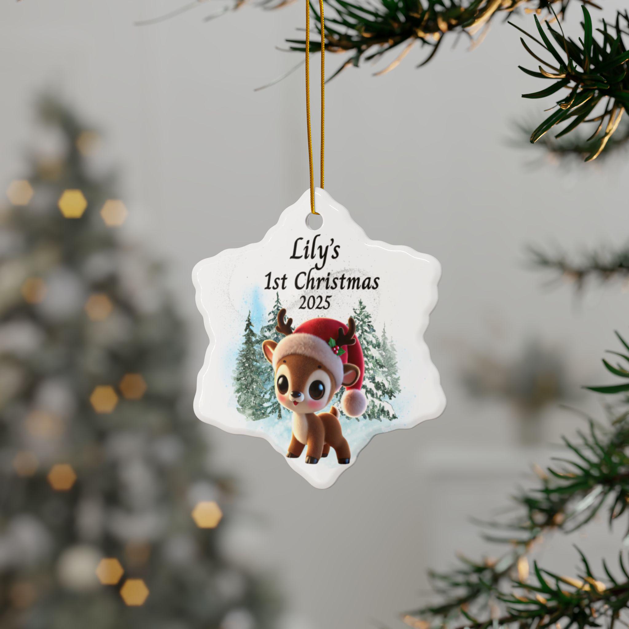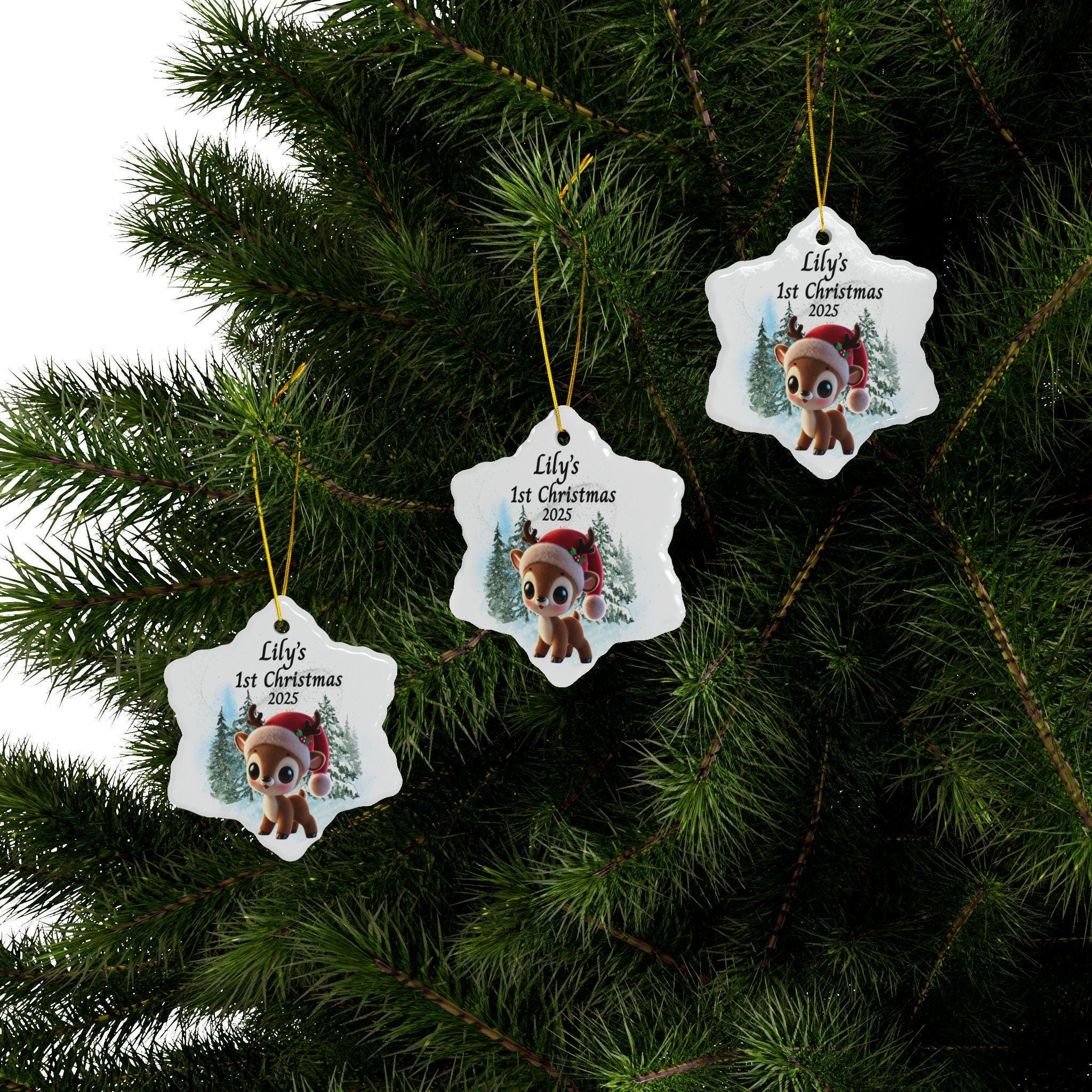Celebrate your little one’s first holiday season with this sweet Baby’s 1st Christmas Ornament 2025, featuring an adorable baby reindeer wearing a festive Santa hat. Designed in soft winter tones with a snowy forest background, this personalized reindeer ornament makes a heartwarming addition to your family Christmas tree and a keepsake you’ll treasure forever.