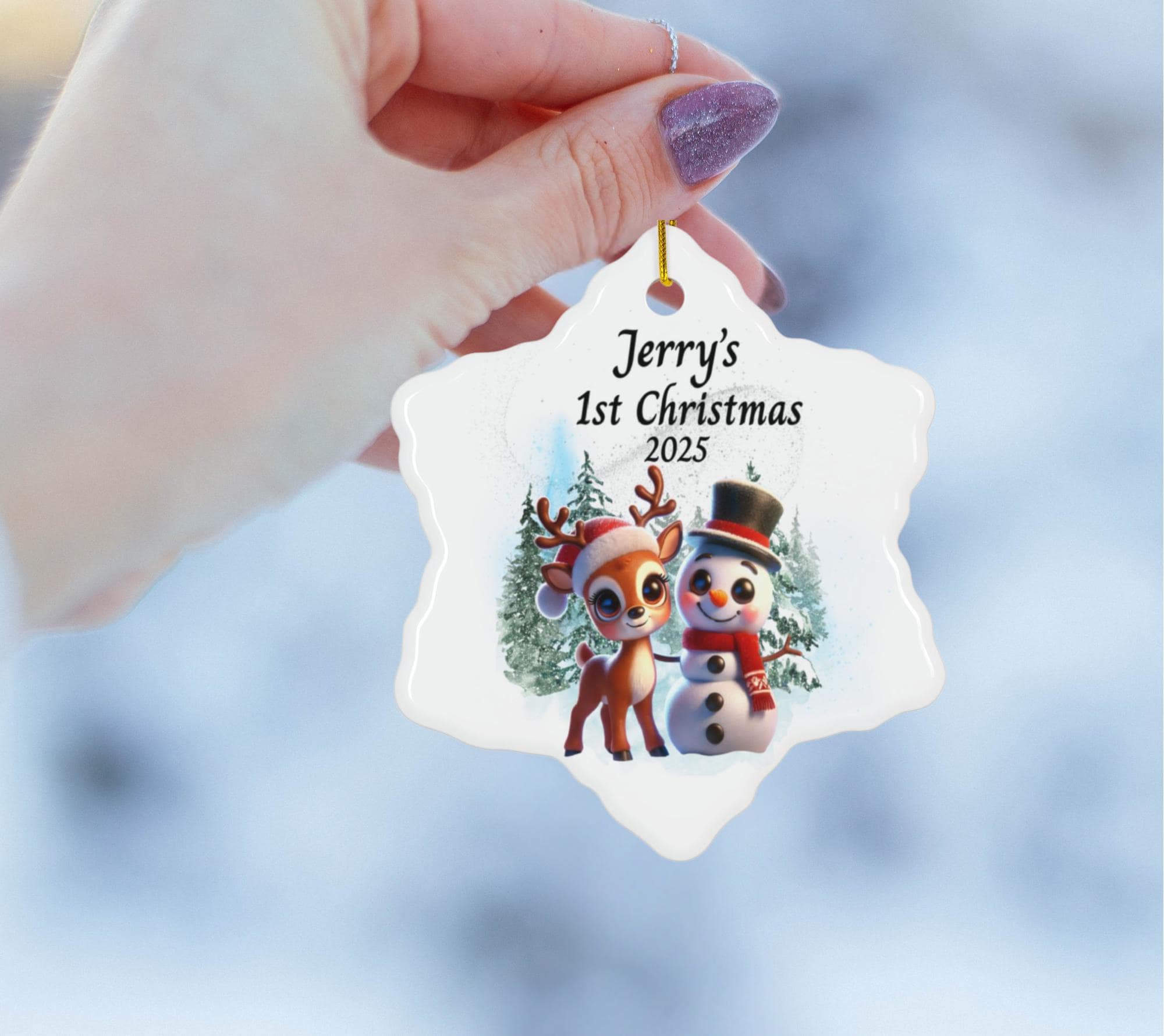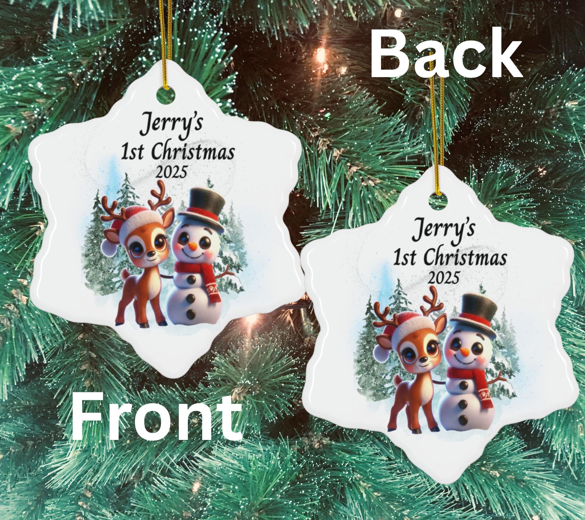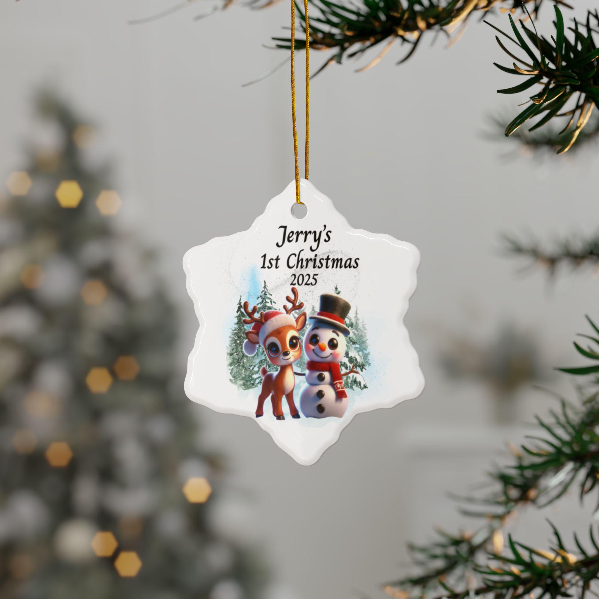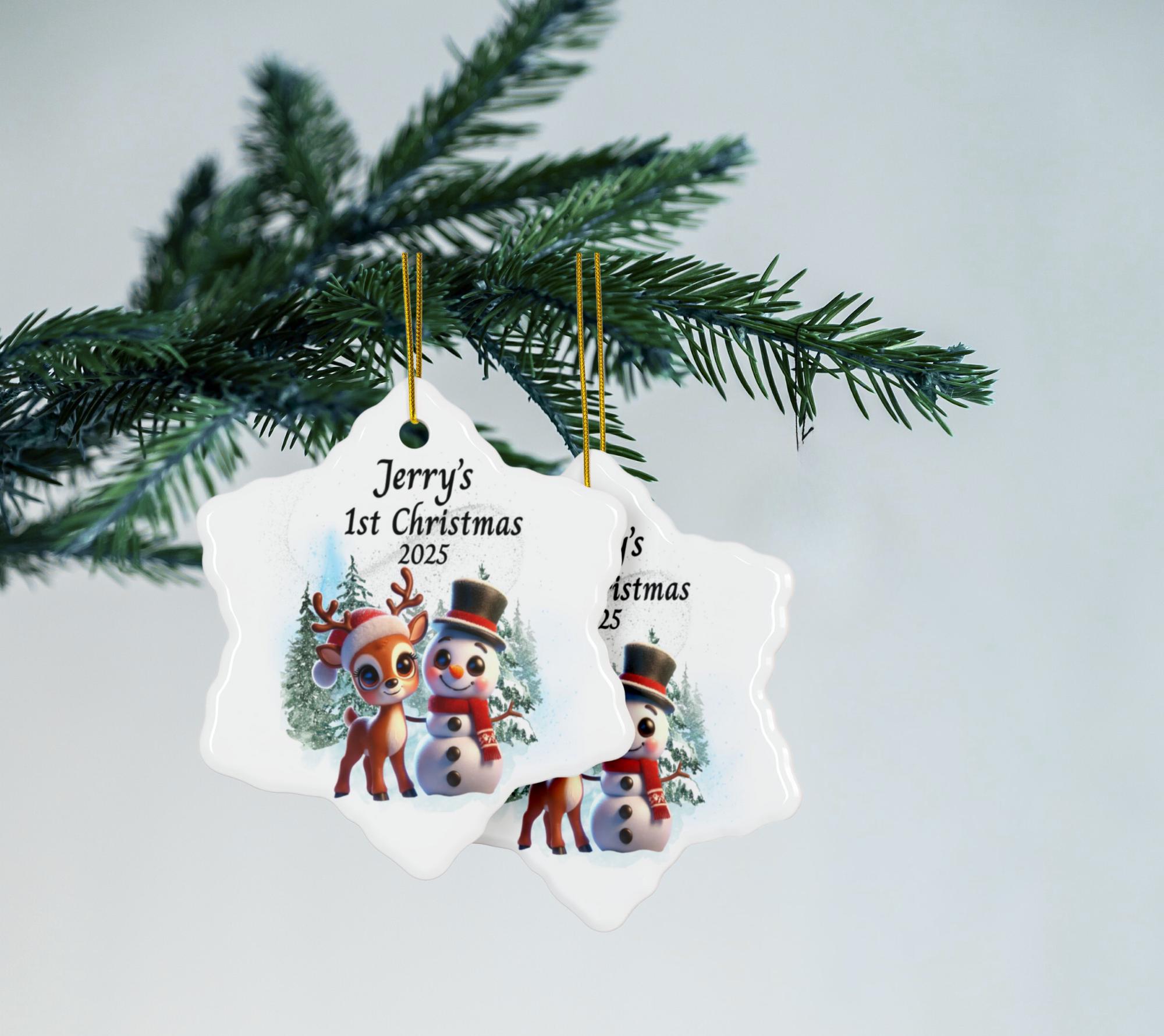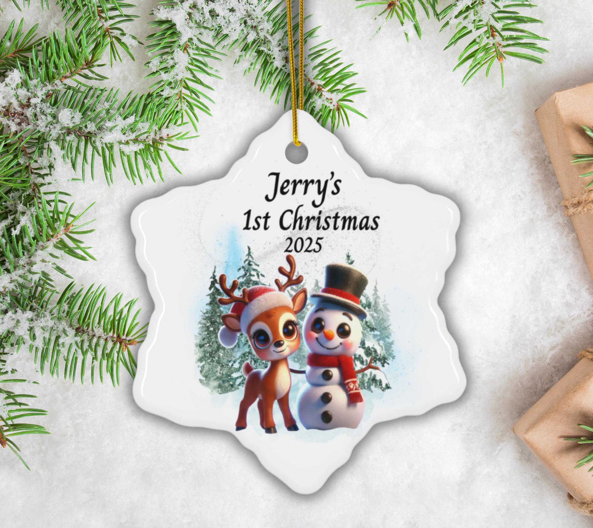 Celebrate your little one’s very first Christmas with this adorable Baby’s 1st Christmas Ornament 2025, featuring a cheerful reindeer and snowman surrounded by snowy evergreens. This personalized baby ornament is the perfect keepsake to capture the magic of your child’s first holiday season.